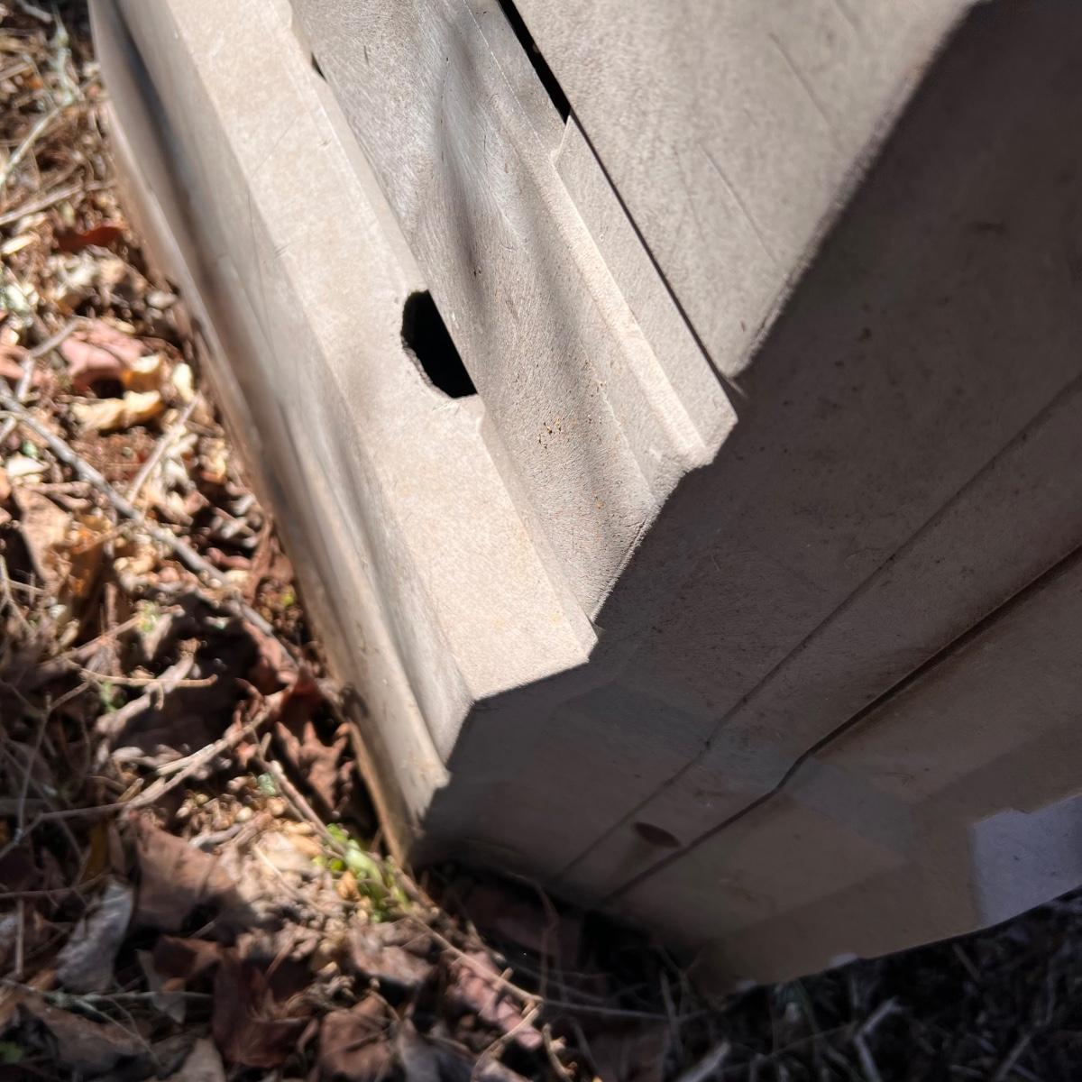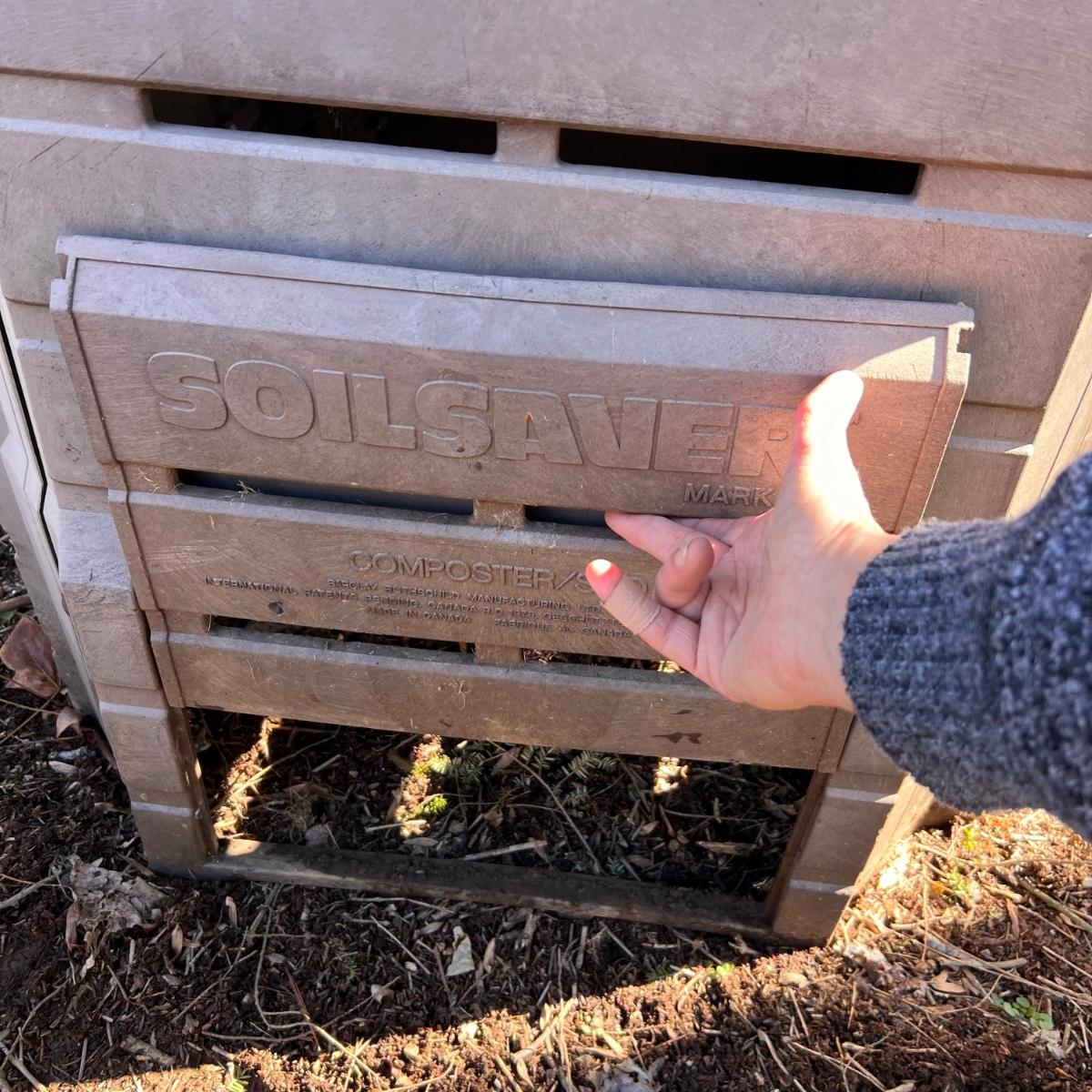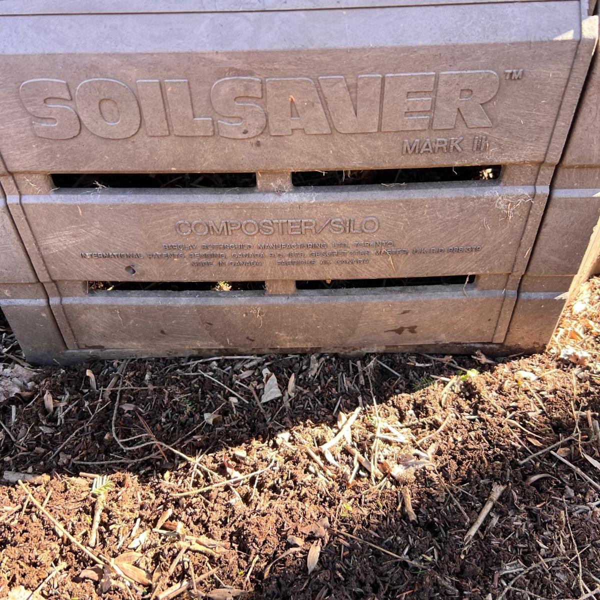 Sturdy plastic compost bin. It has two pull up sections to release your gardeners gold once it is ready and a lid to add more leaves, food scraps, etc. Has a small crack on one side, see pic.