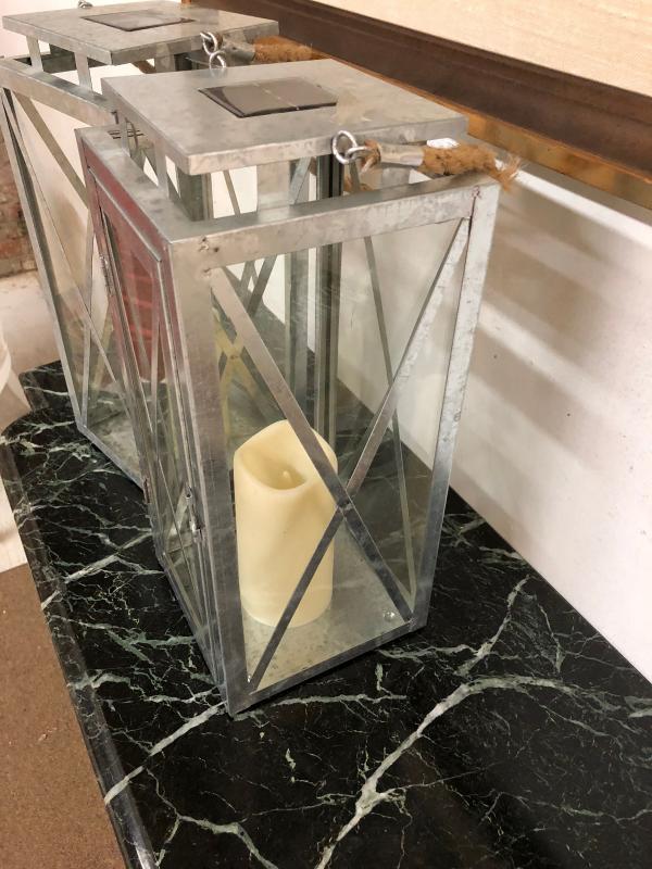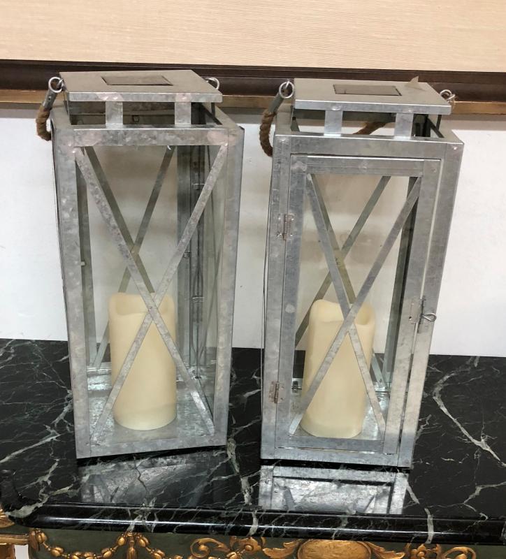 Solar Candle Lanterns Galvanized Metal lot#2. Not tested sold as-is, solar powered LED candle, measure 7" square, 16" tall 1 of 3 lots of lanterns.