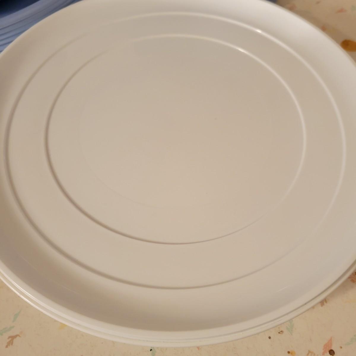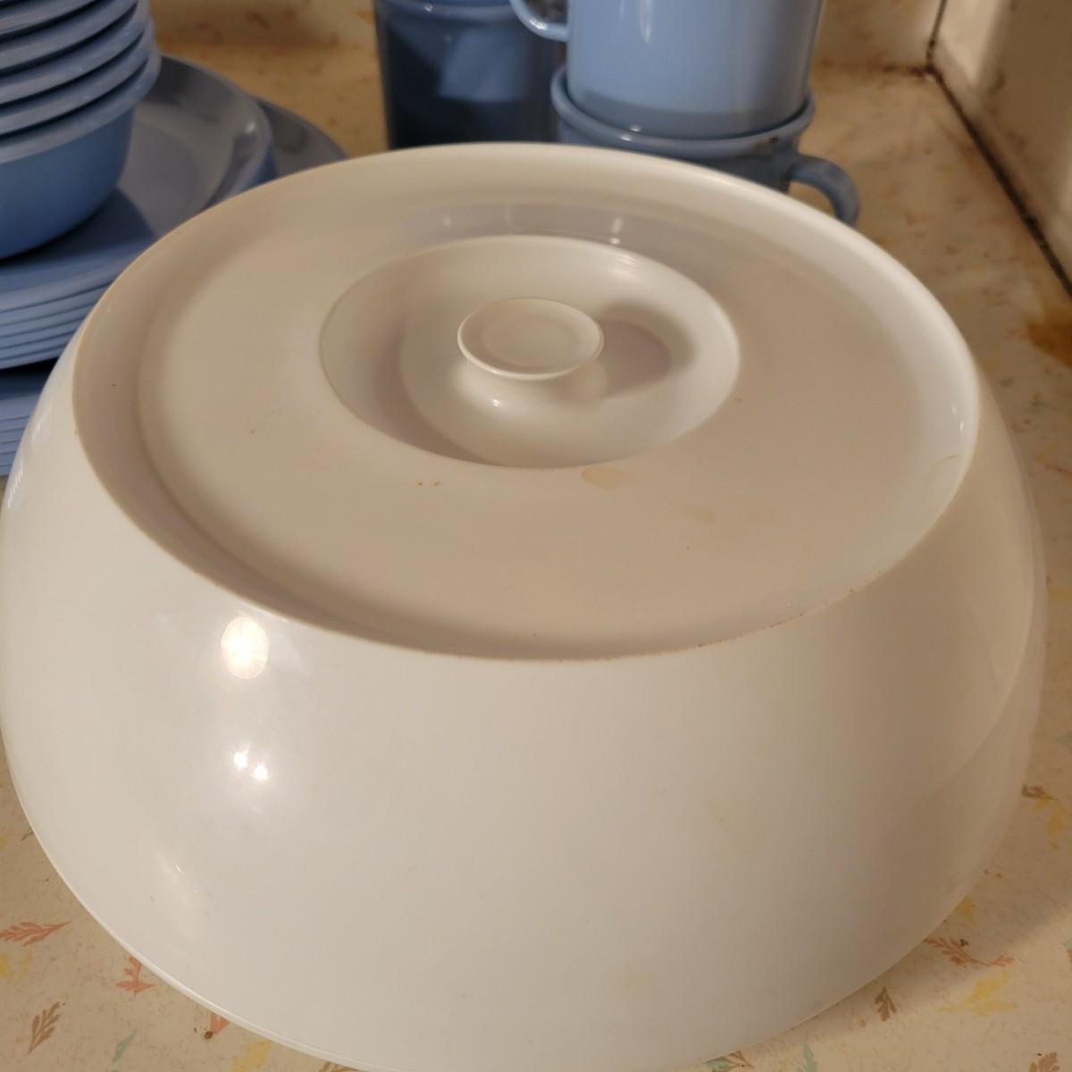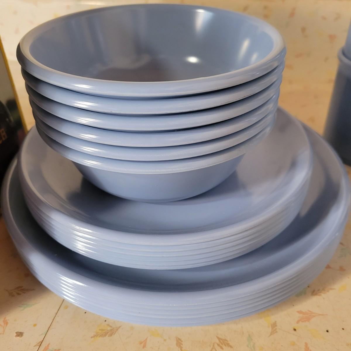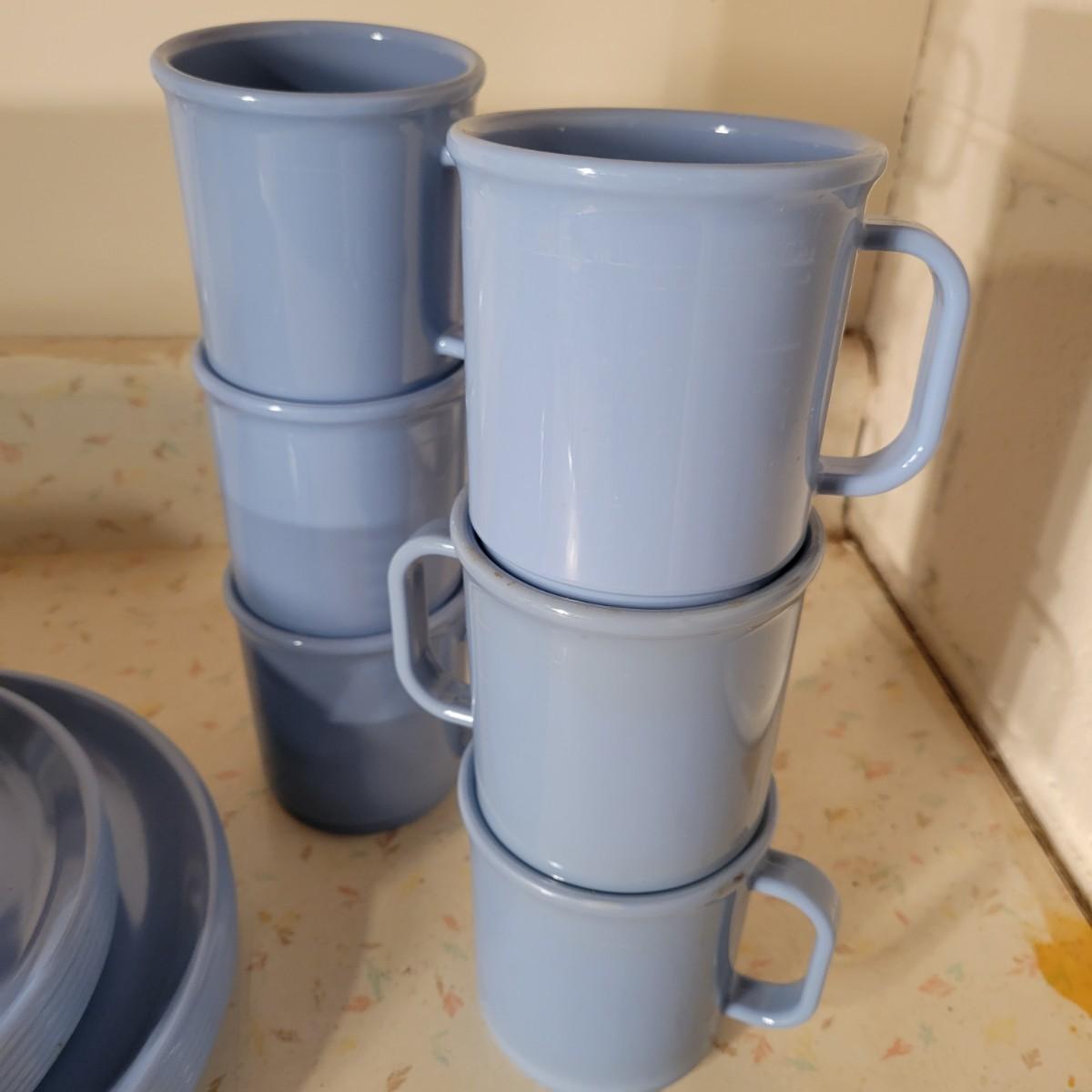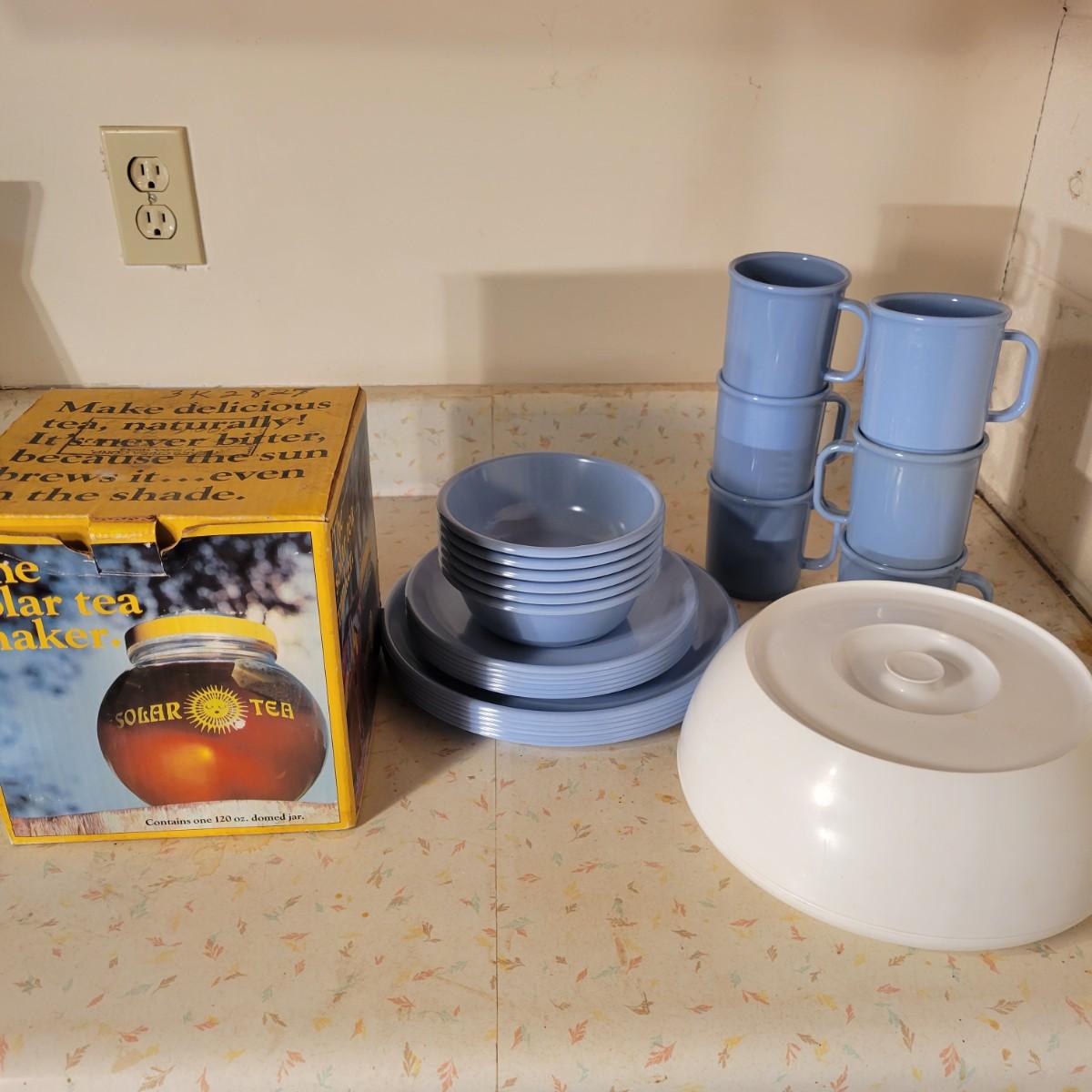 A six piece set of Rubbermaid Melamine dishes and cups in good condition. Also includes a solar tea brewer that appears to be unused and a plastic cake holder. Cake holder measures approximately 10"D x 4"H. Shipping available