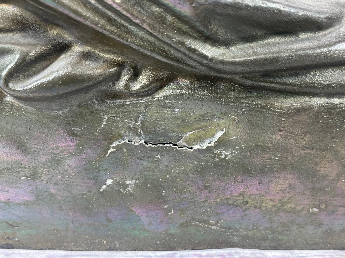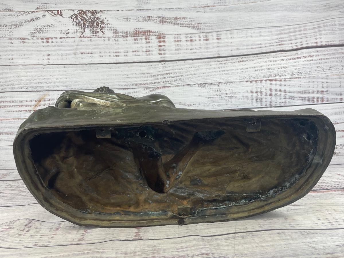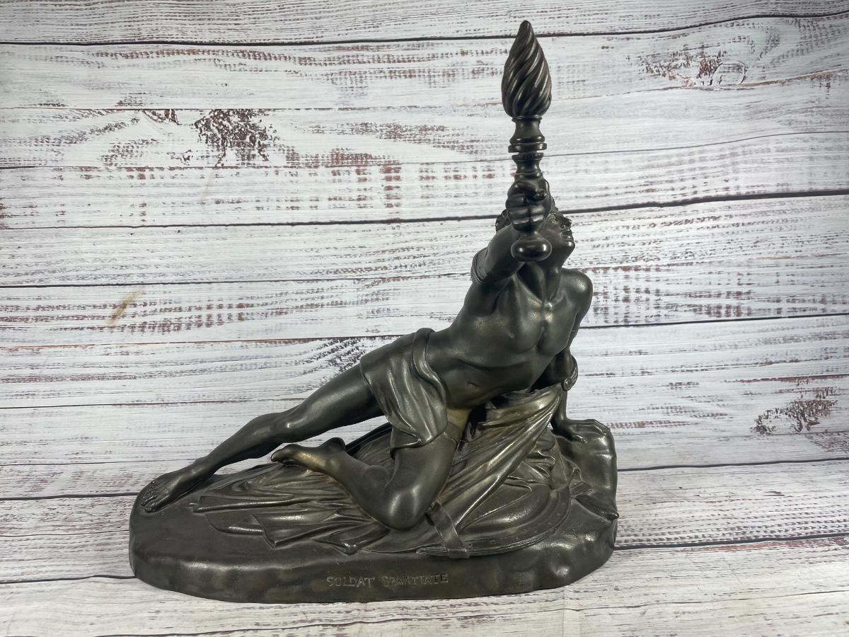 Vintage spelter metal statue titled Soldat Spartiate, a reproduction of famous neoclassical sculpture Jean-Pierre Cortot's sculpture. There have been variations of his sculpture made including bronzes and lamps. Item is in decent condition, there is a few cracks and discoloration on the statue. It is approximately 14” size..