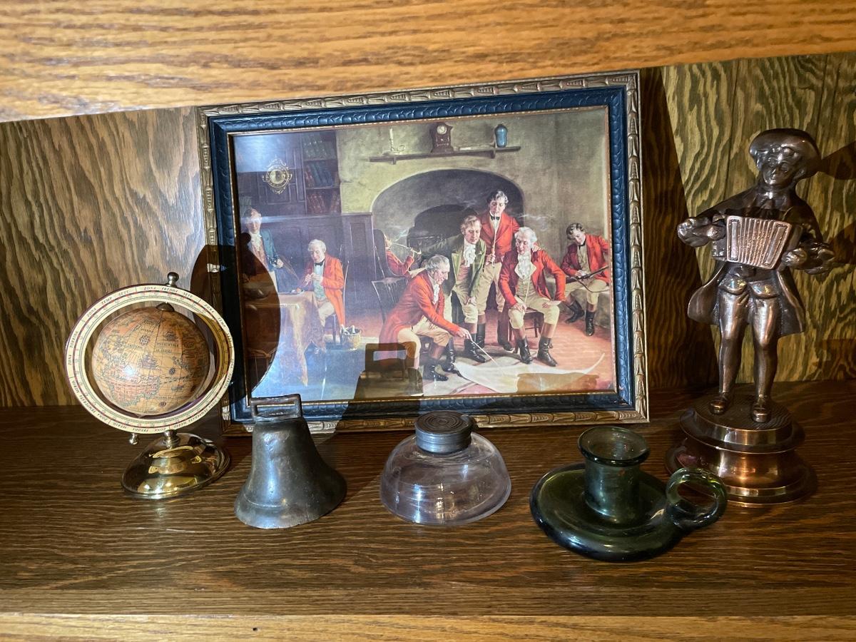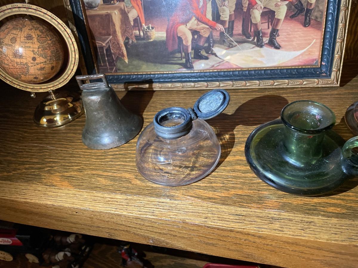 Ink well, statue and bell, globe