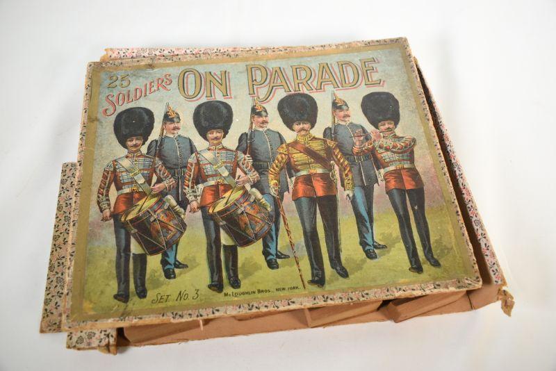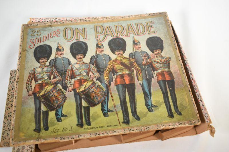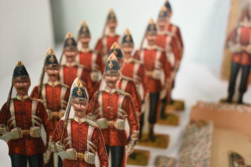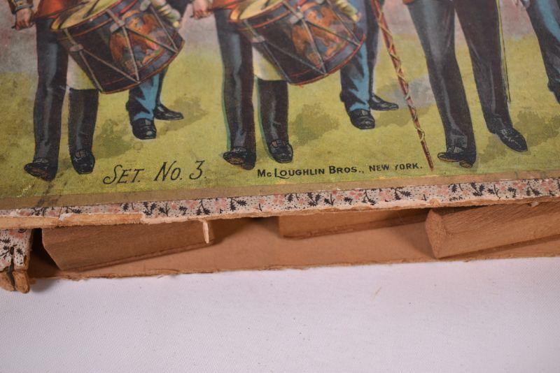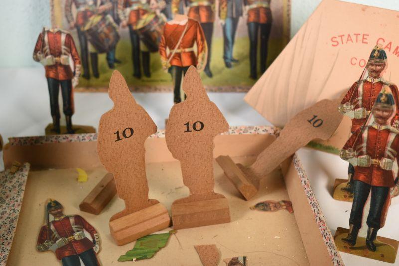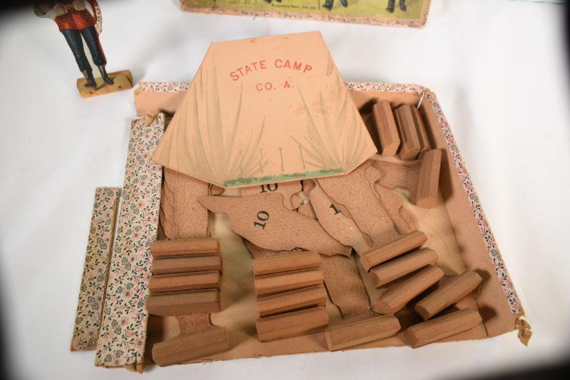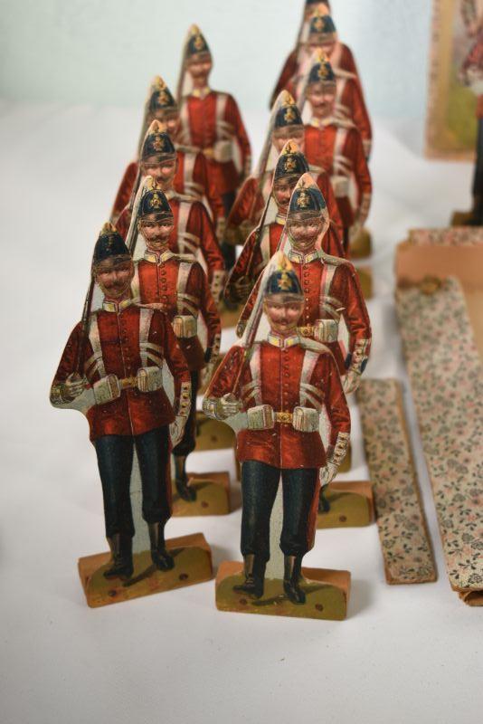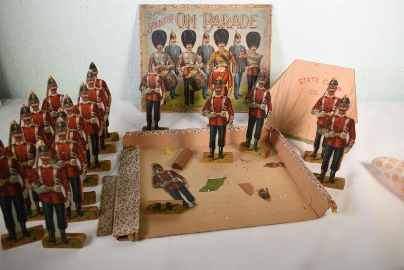 Cardboard soldiers with wooden stands. The box has some damage to it as shown in the pictures. The pieces are set on wood. There are a couple broken pieces