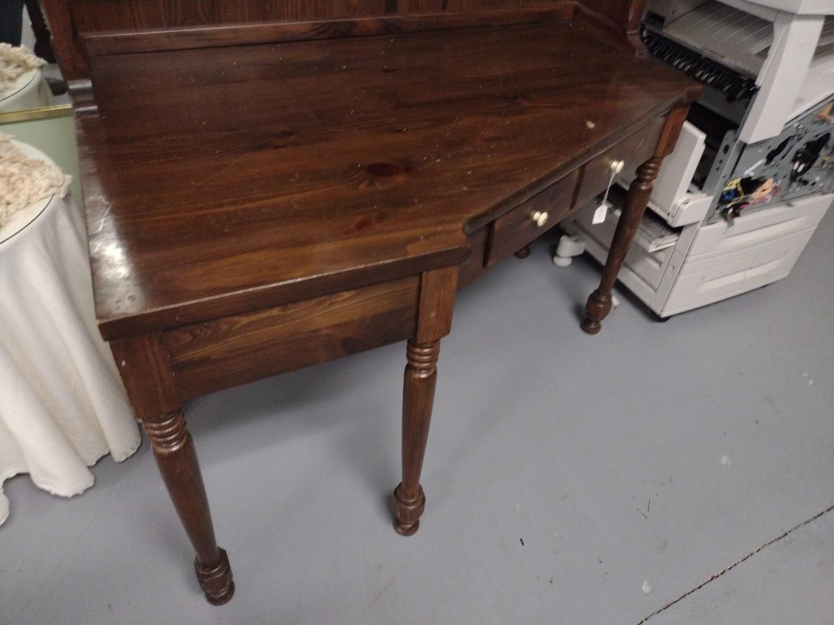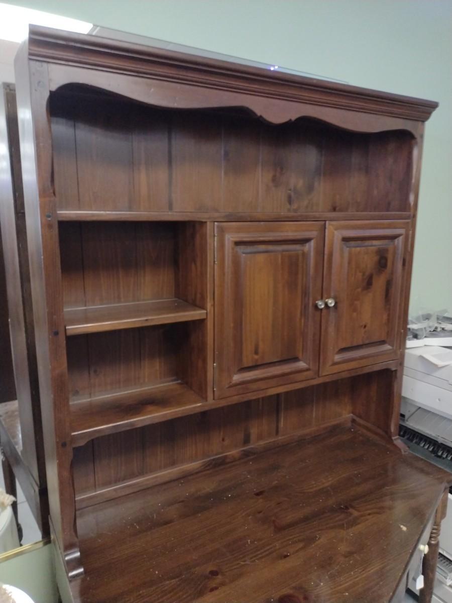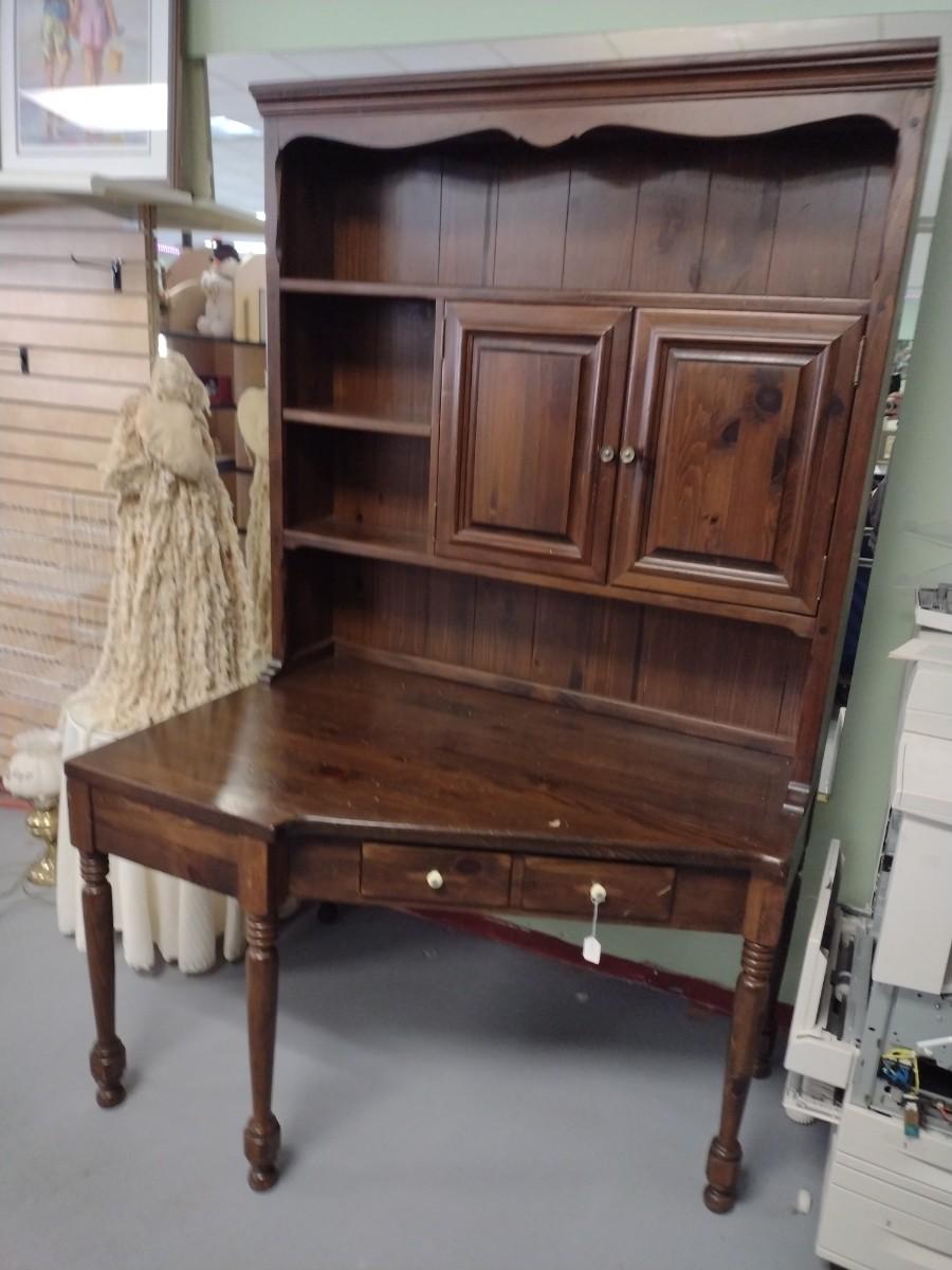 Solid Wood Two Piece Desk with Hutch rear leg will need to be repaired.