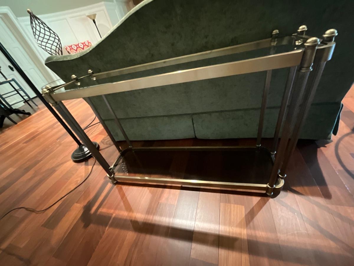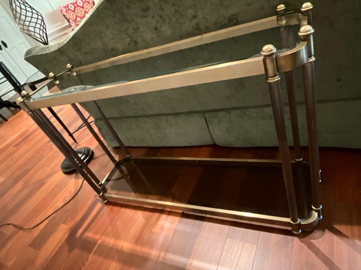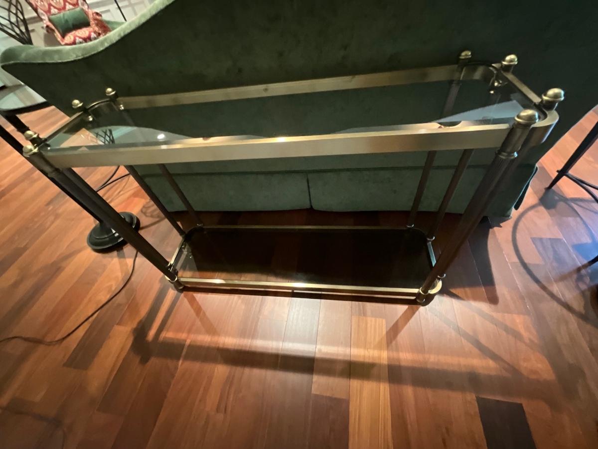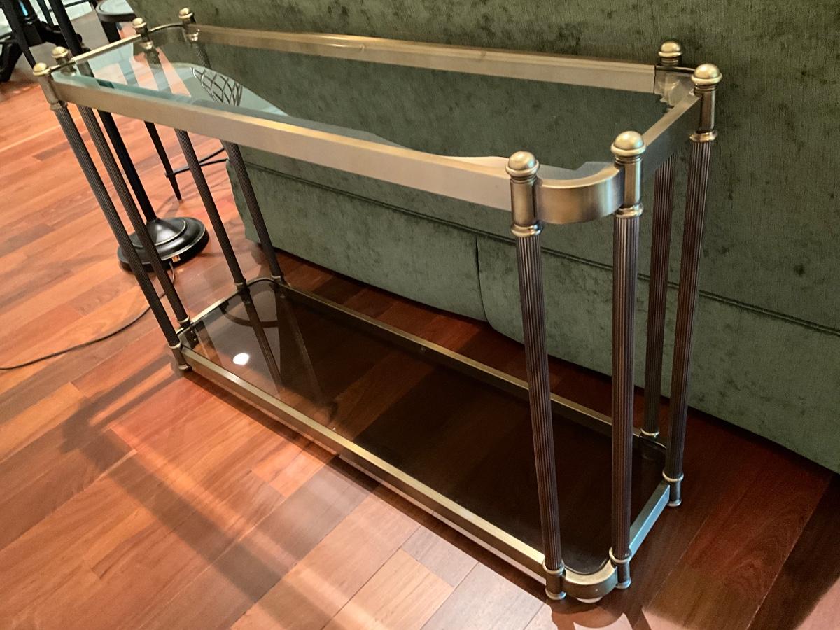 Brass and glass two tiered console table. 30 inches tall, 14 inches deep, 48 inches wide.