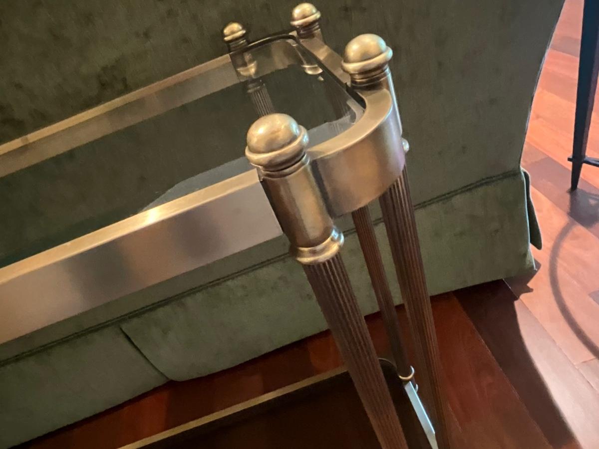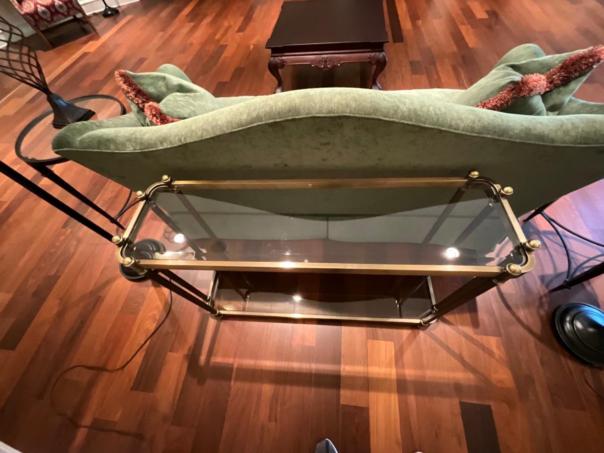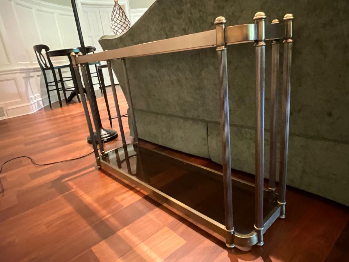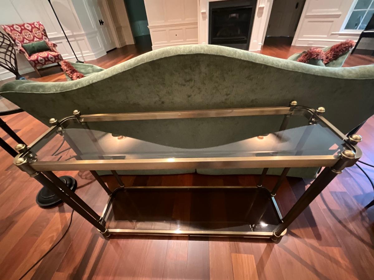 Brass and glass two tiered console table. 30 inches tall, 14 inches deep, 48 inches wide.
