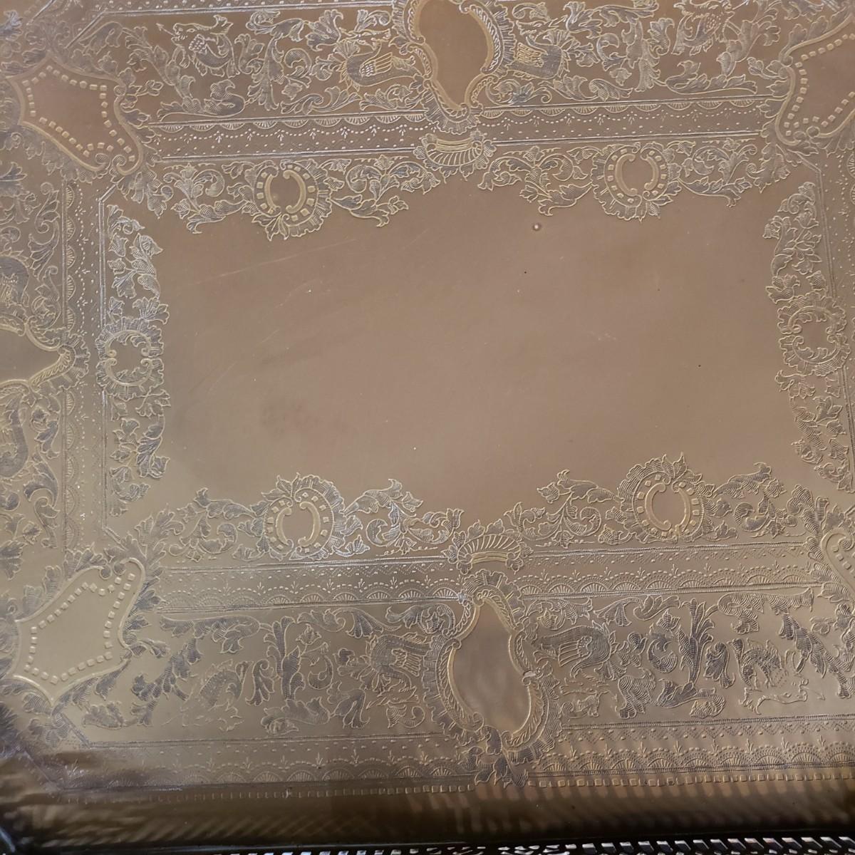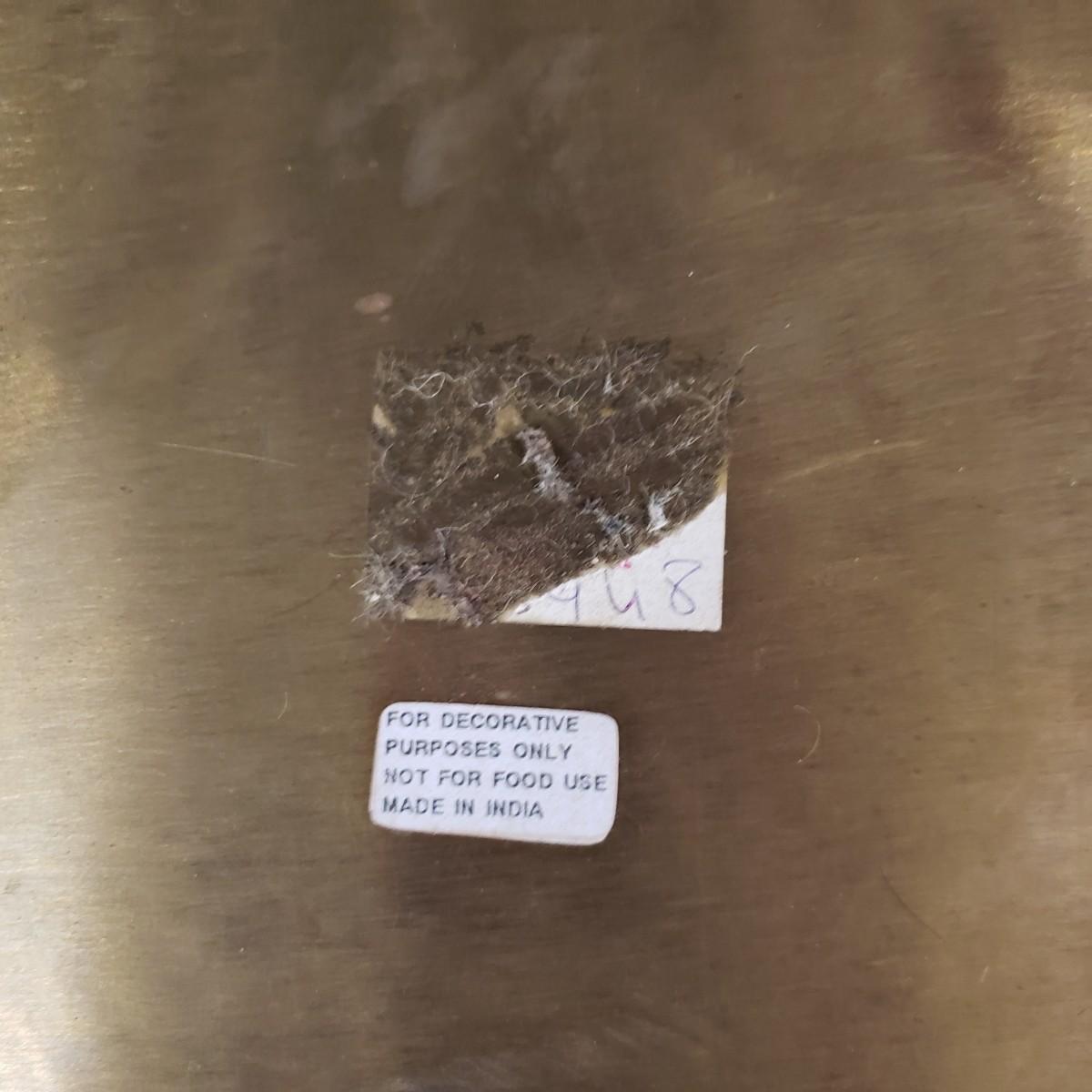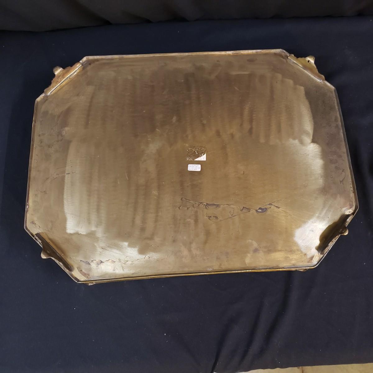 This heavy solid brass serving tray from India measures 18"x2"x3". There is one small blemish on the front as seen in the pictures. The tray could use a good polish, but otherwise in good condition. This piece is rather heavy and will affect shipping costs.