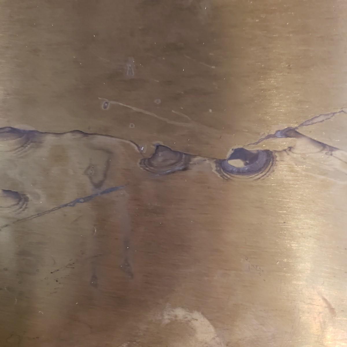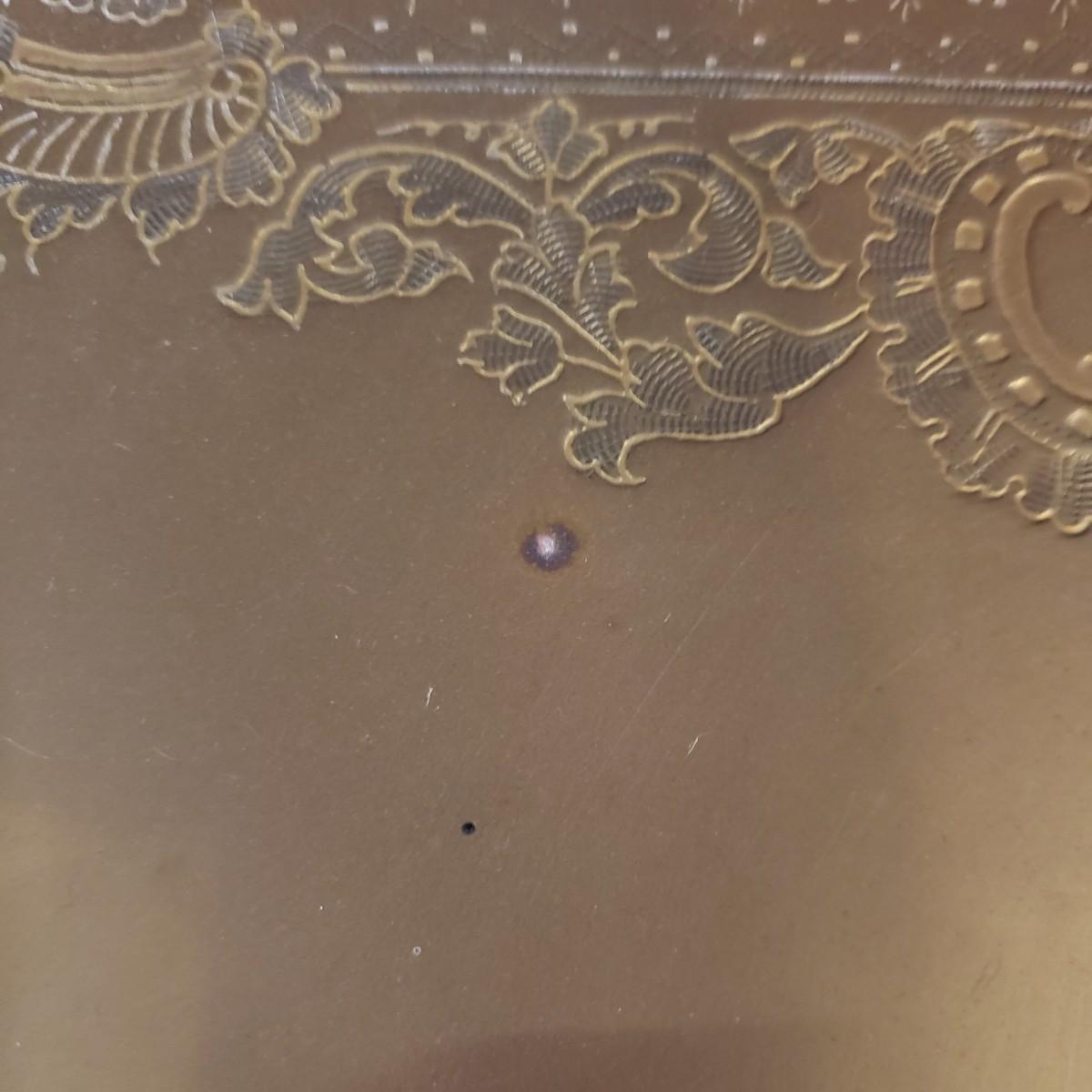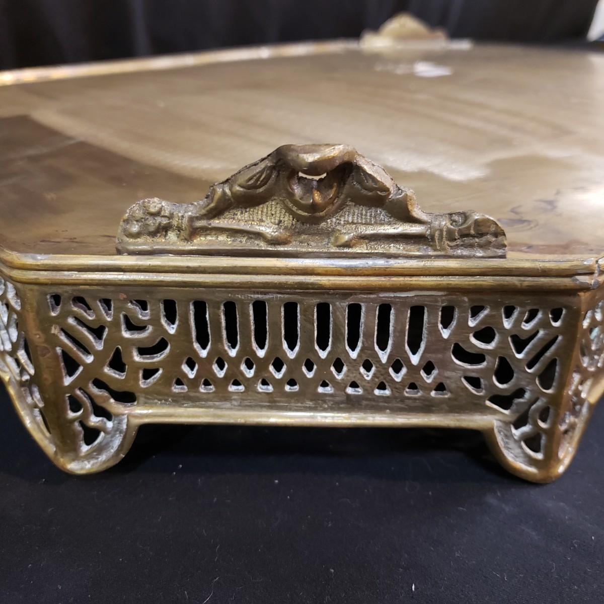 This heavy solid brass serving tray from India measures 18"x2"x3". There is one small blemish on the front as seen in the pictures. The tray could use a good polish, but otherwise in good condition. This piece is rather heavy and will affect shipping costs.