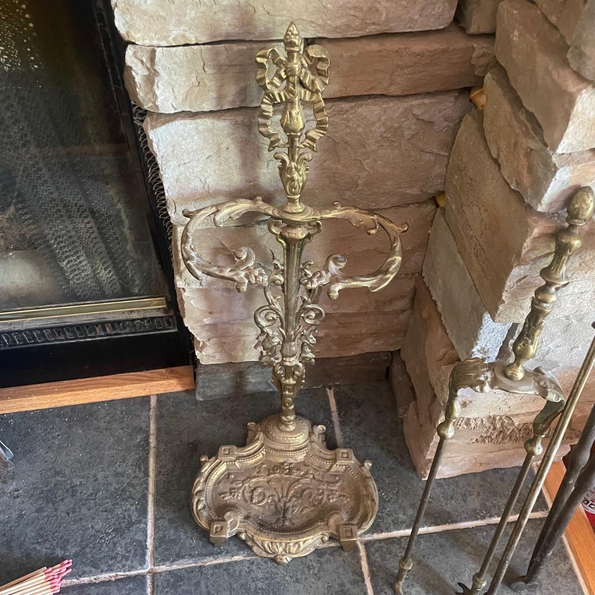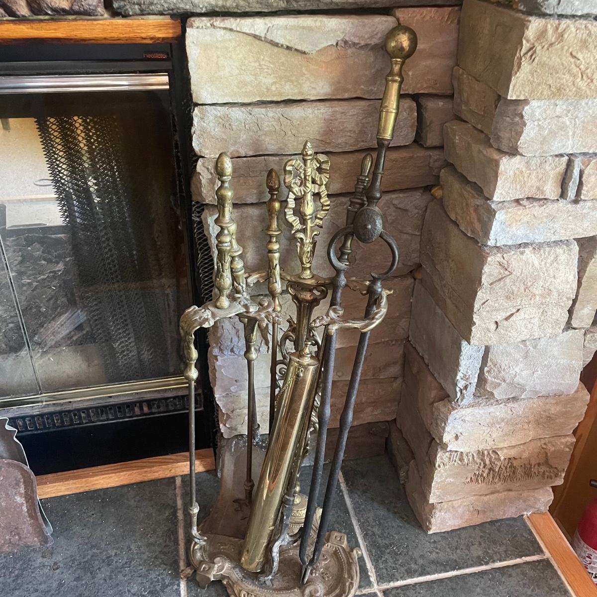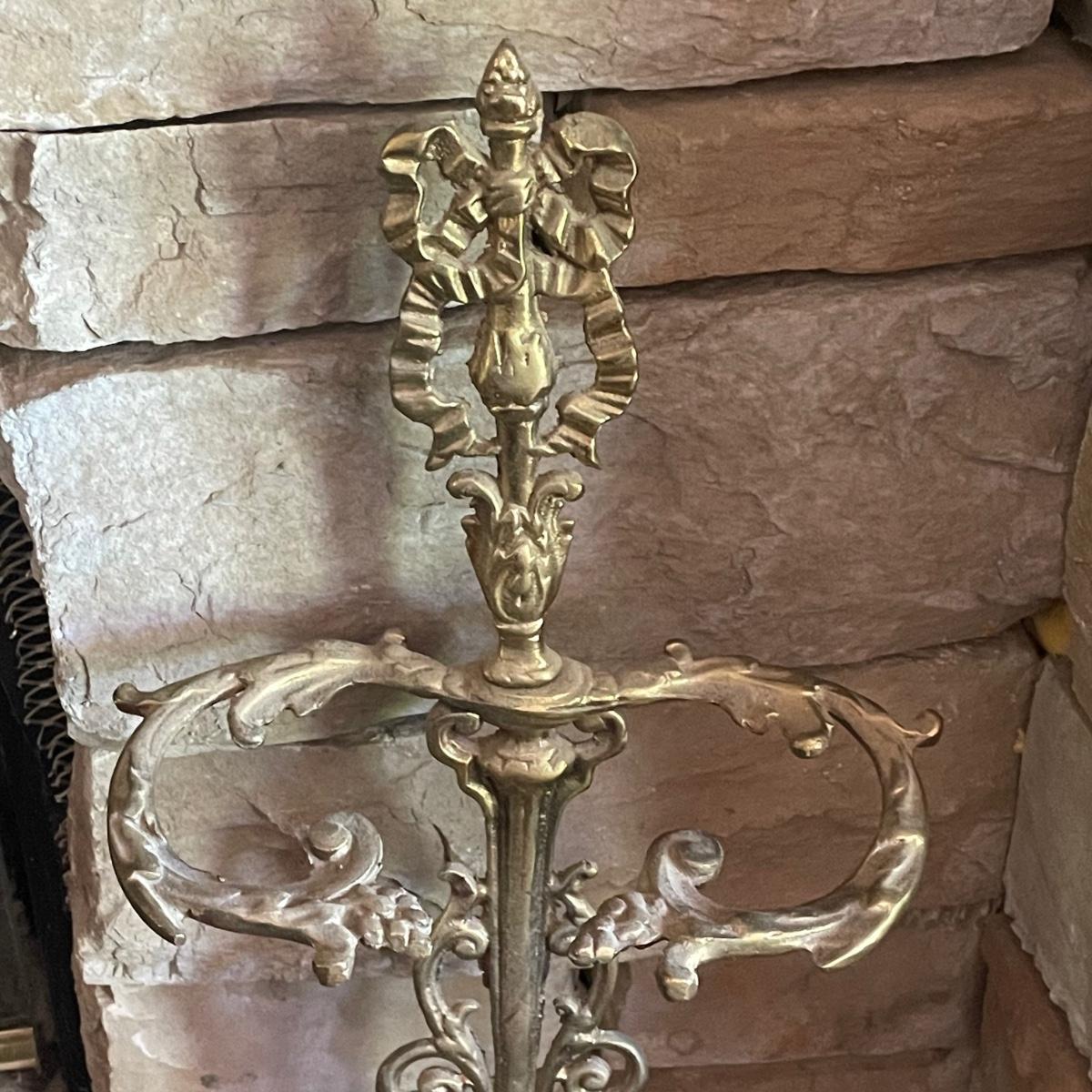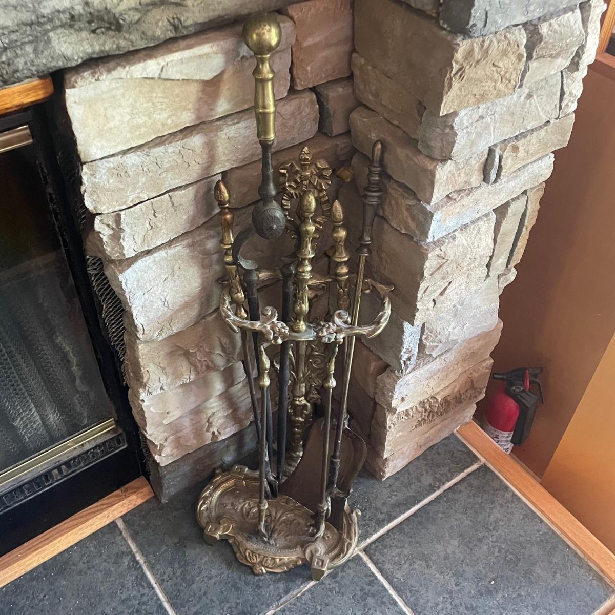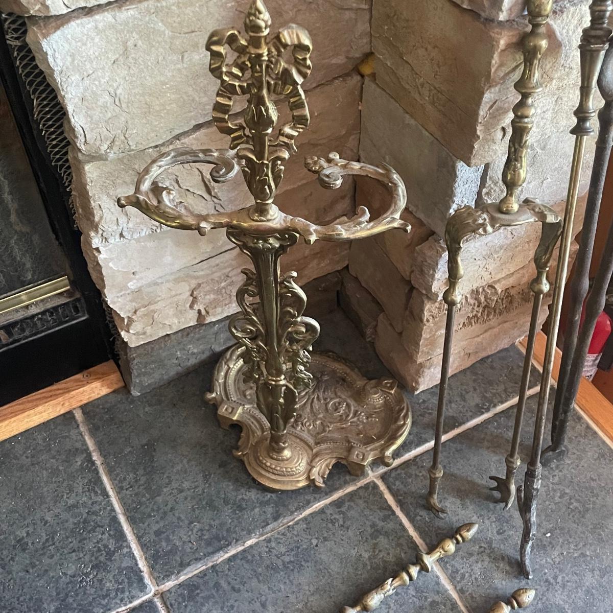 This 5 piece ornate brass set of fireplace tools comes with a stand that measures approximately 9” x 9” x 28”. More fireplace tools included, see images.