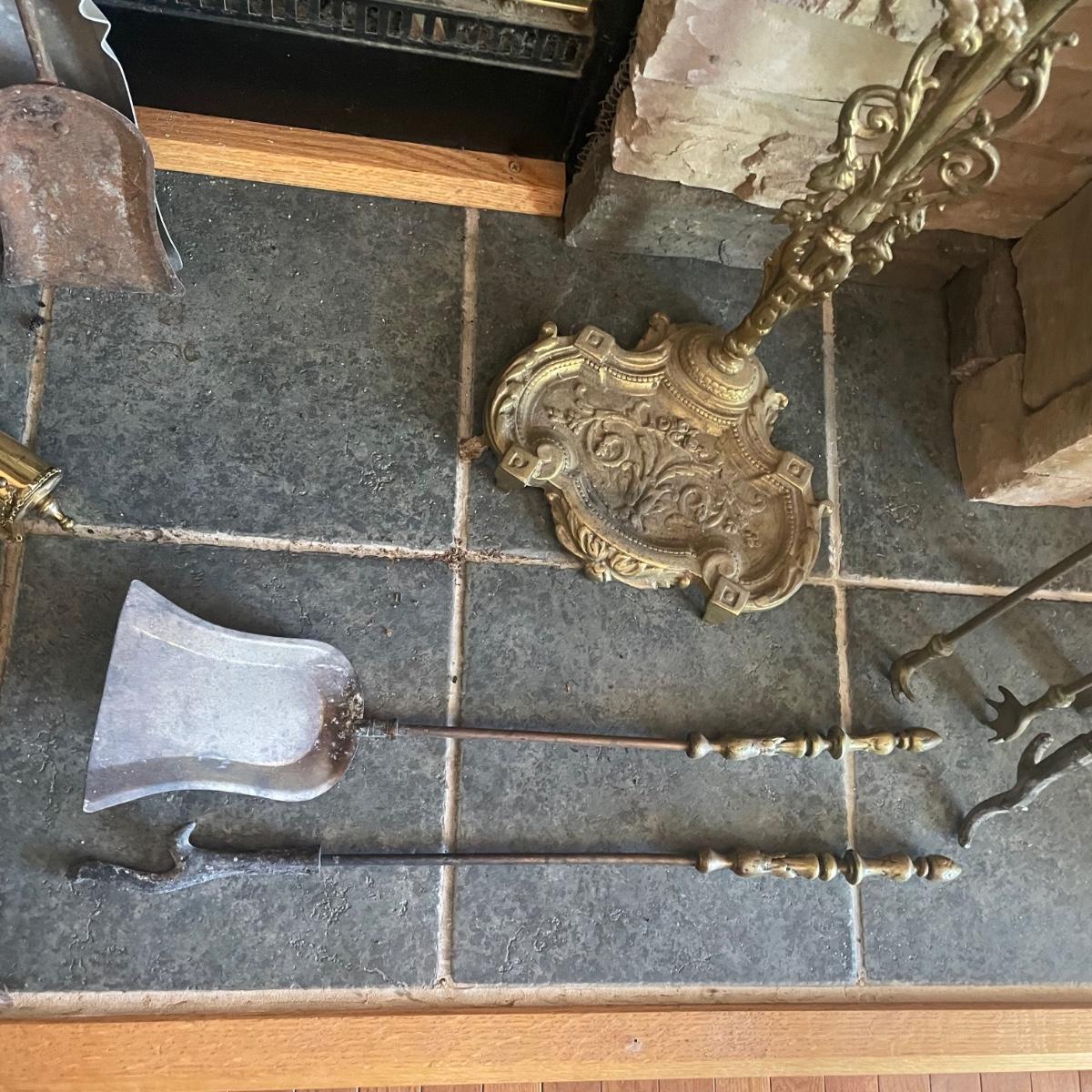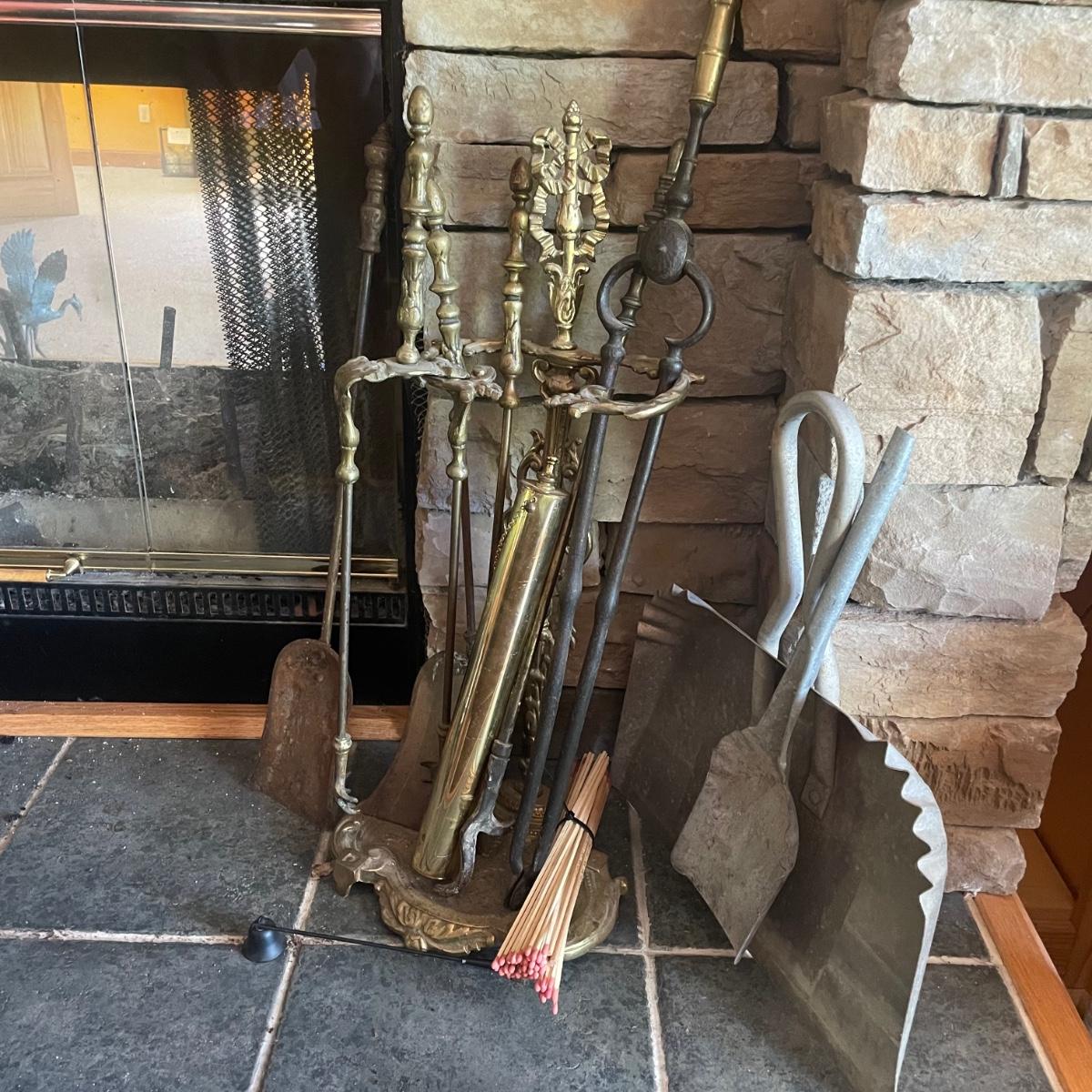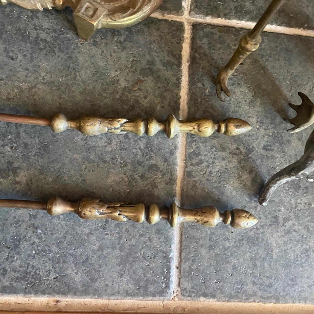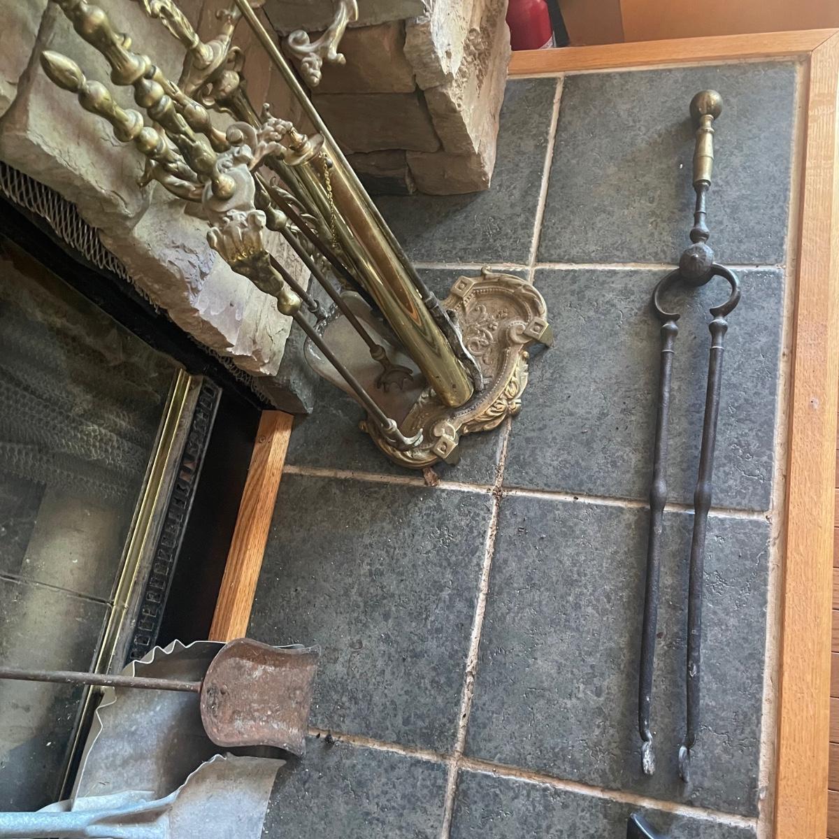 This 5 piece ornate brass set of fireplace tools comes with a stand that measures approximately 9” x 9” x 28”. More fireplace tools included, see images.