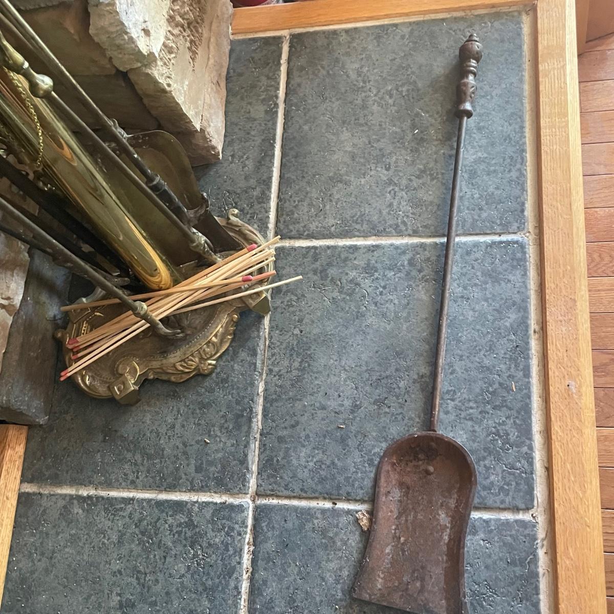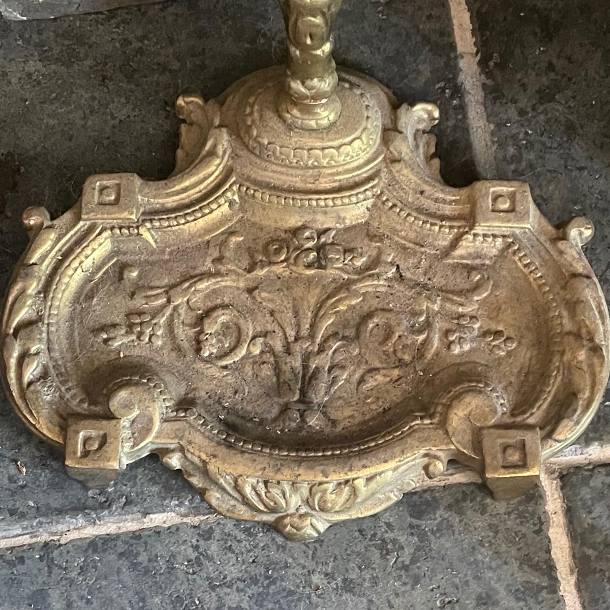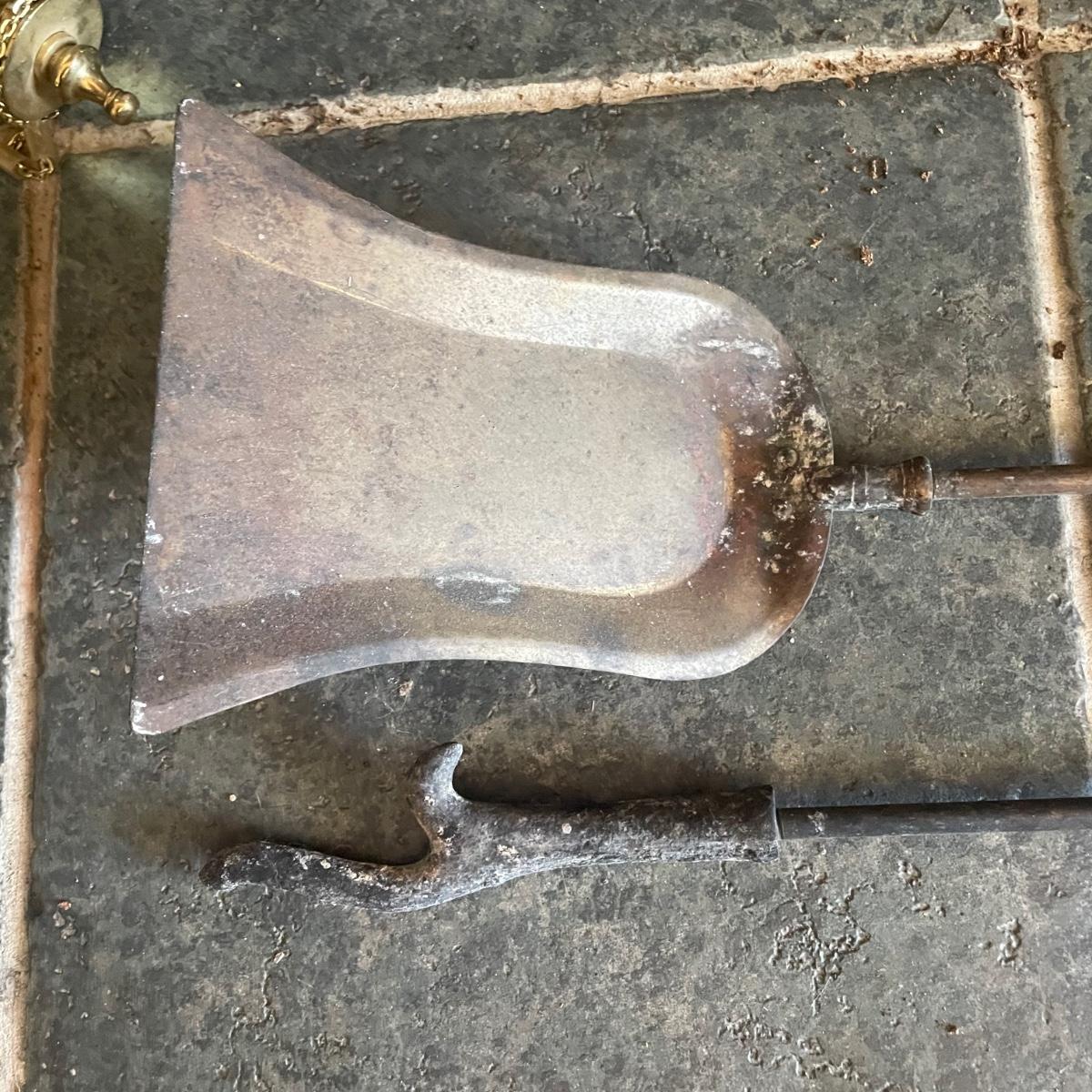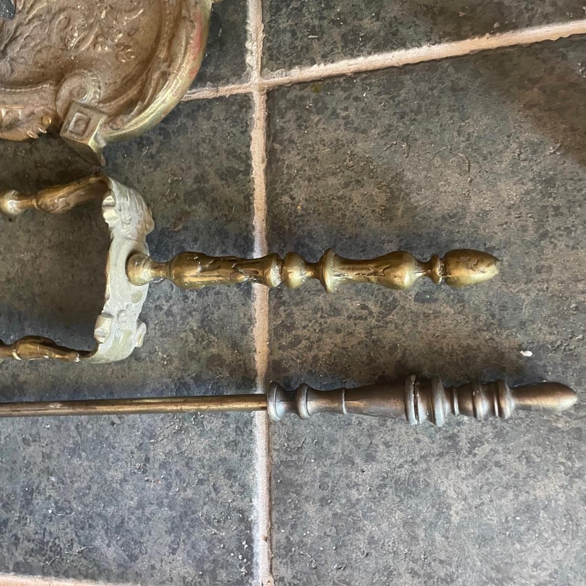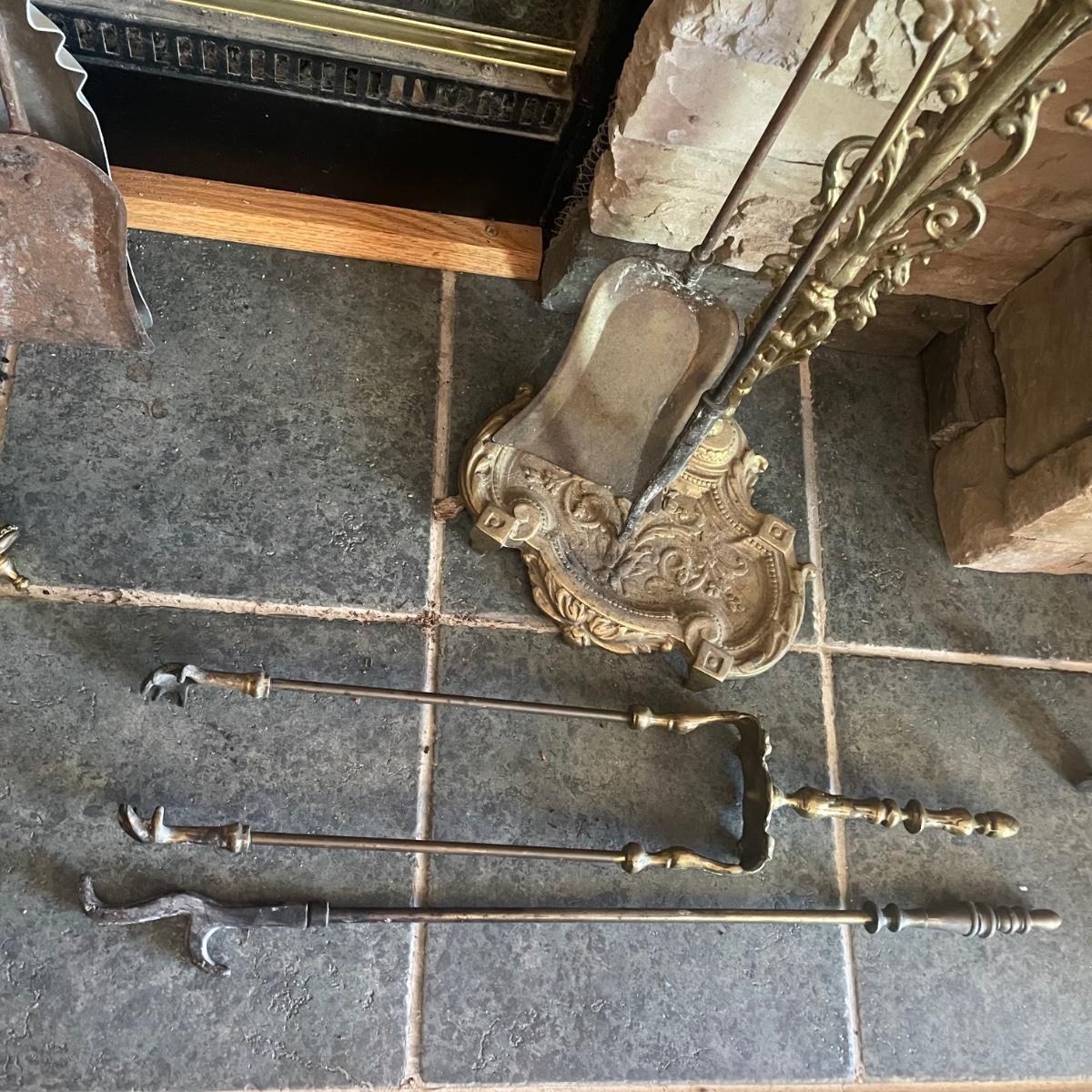 This 5 piece ornate brass set of fireplace tools comes with a stand that measures approximately 9” x 9” x 28”. More fireplace tools included, see images.