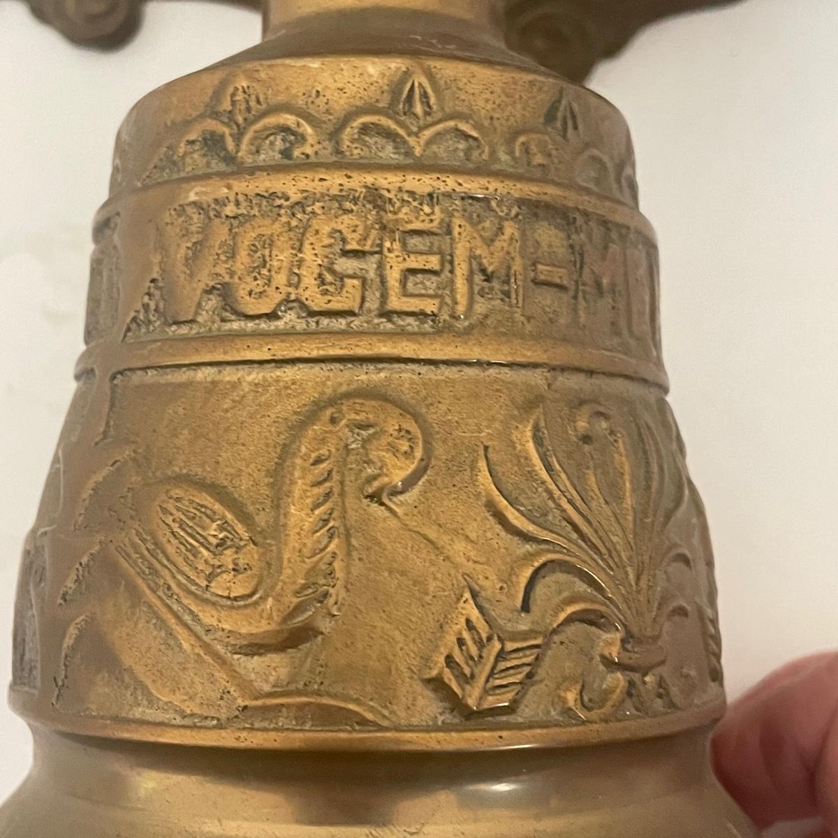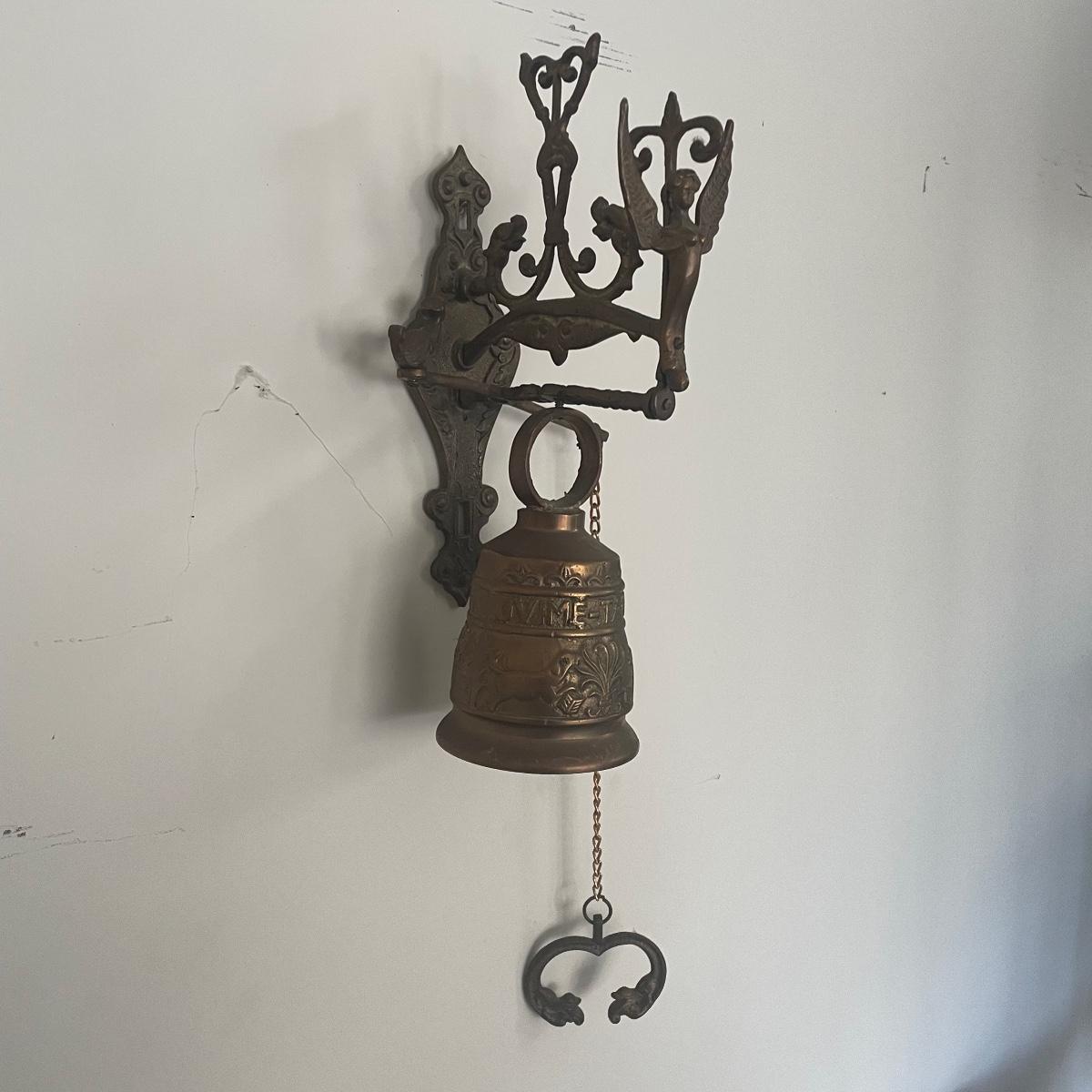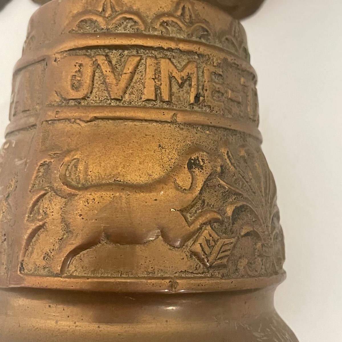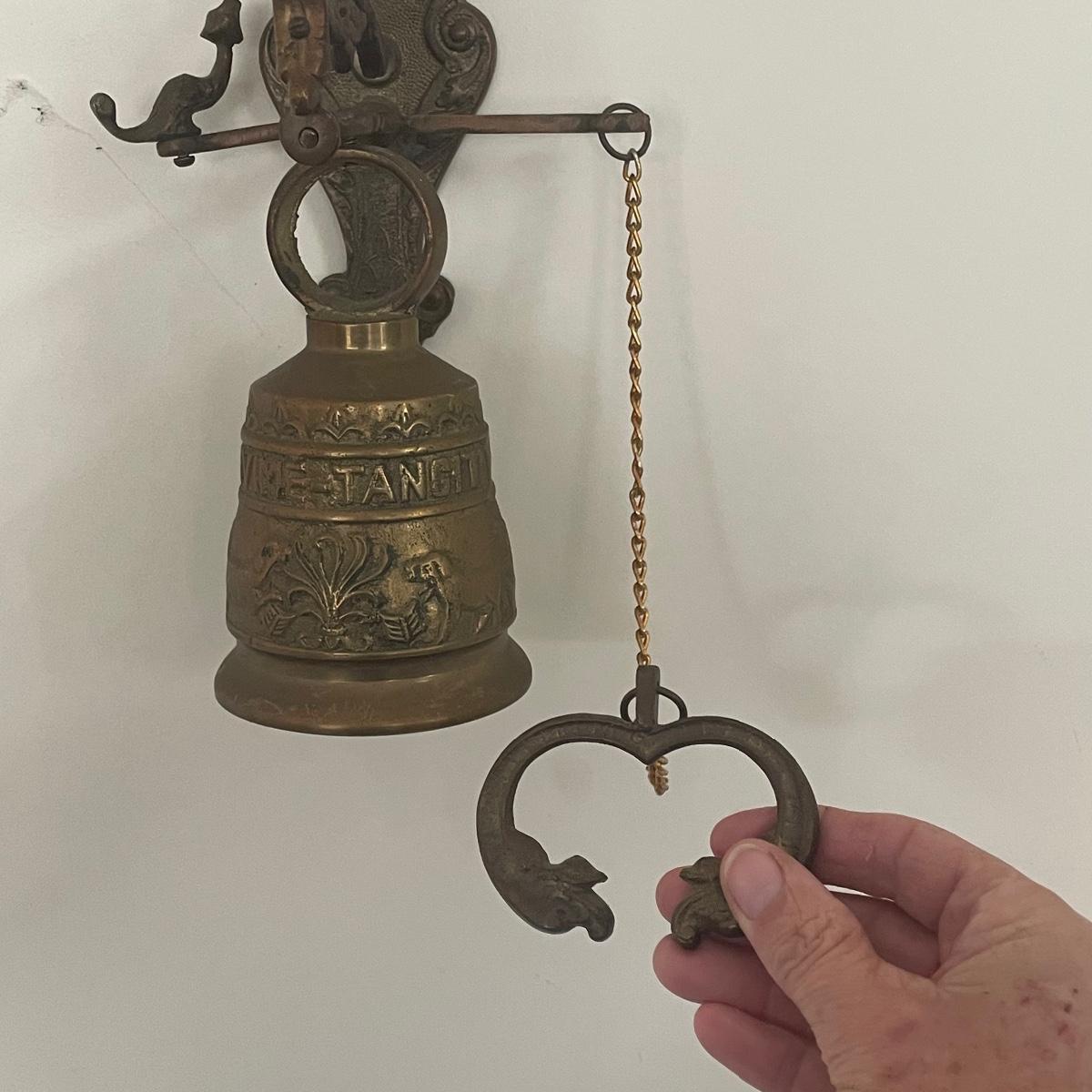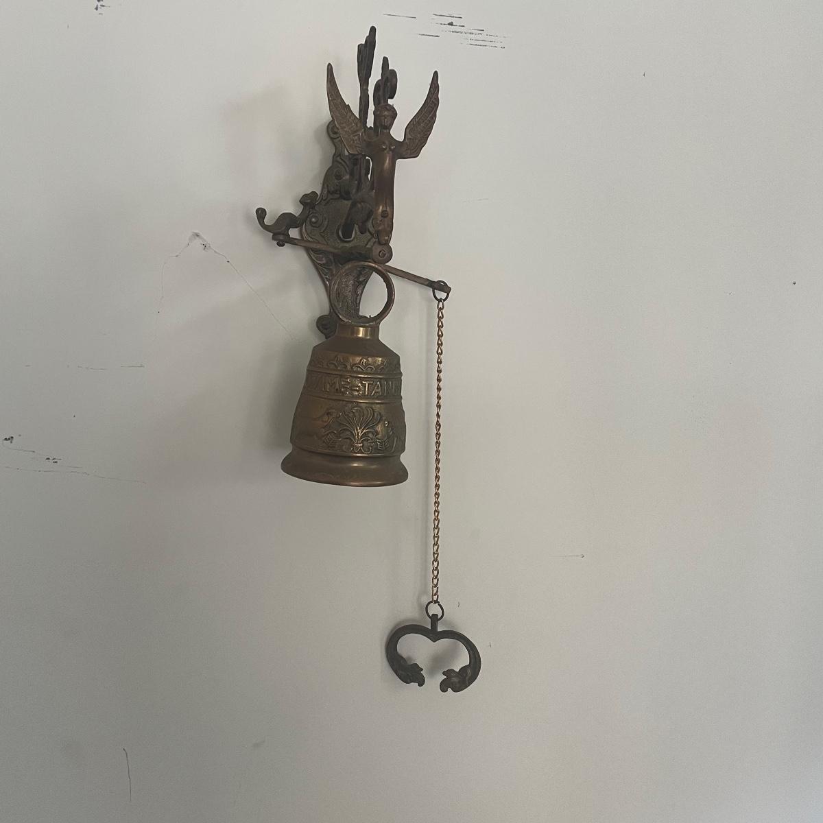 This solid brass bell has a wall mount with a chain attached to ring the bell. The bell has lots of details including Roman words and animals. Measures approximately 12” tall; the bell measures 4” d x 6.5” tall.