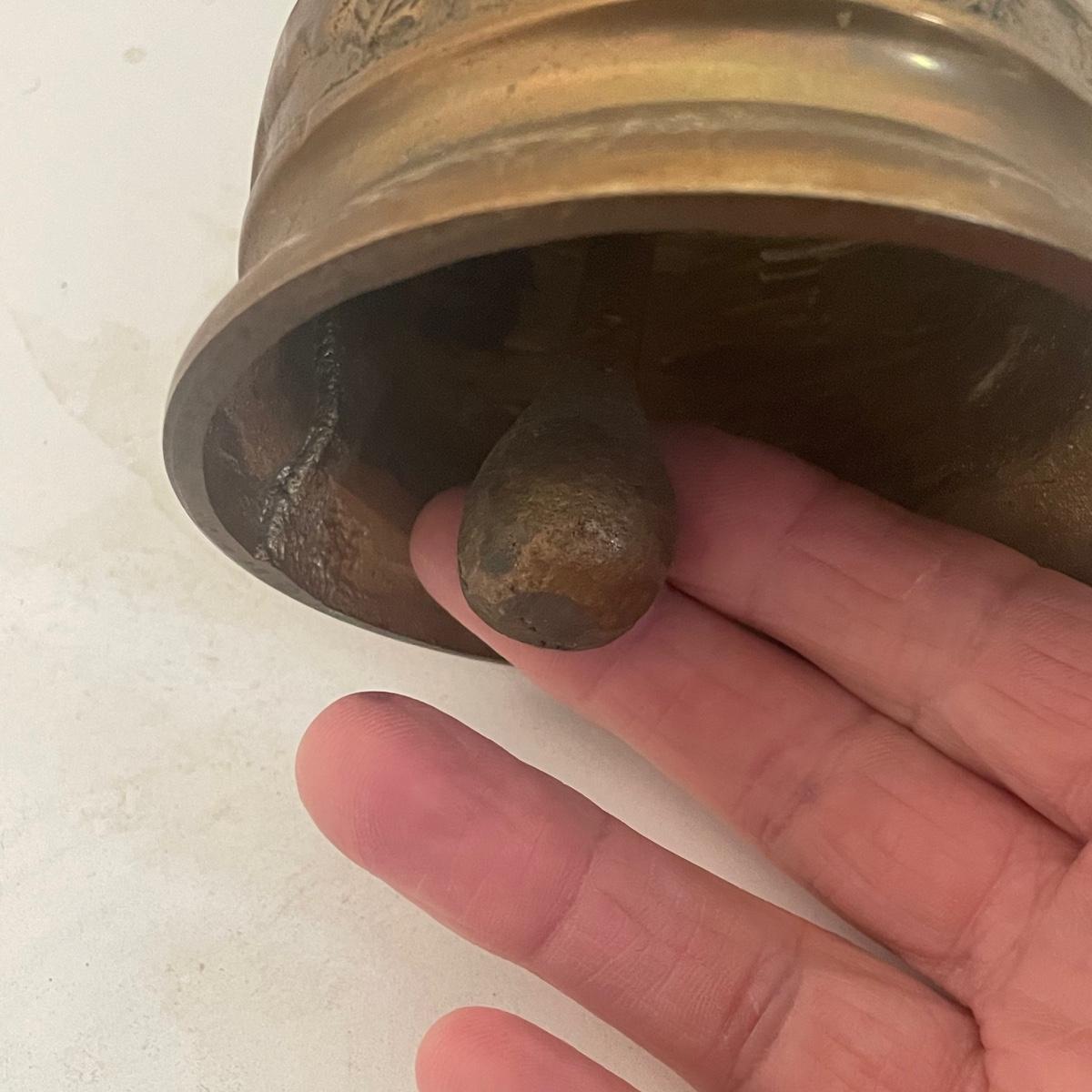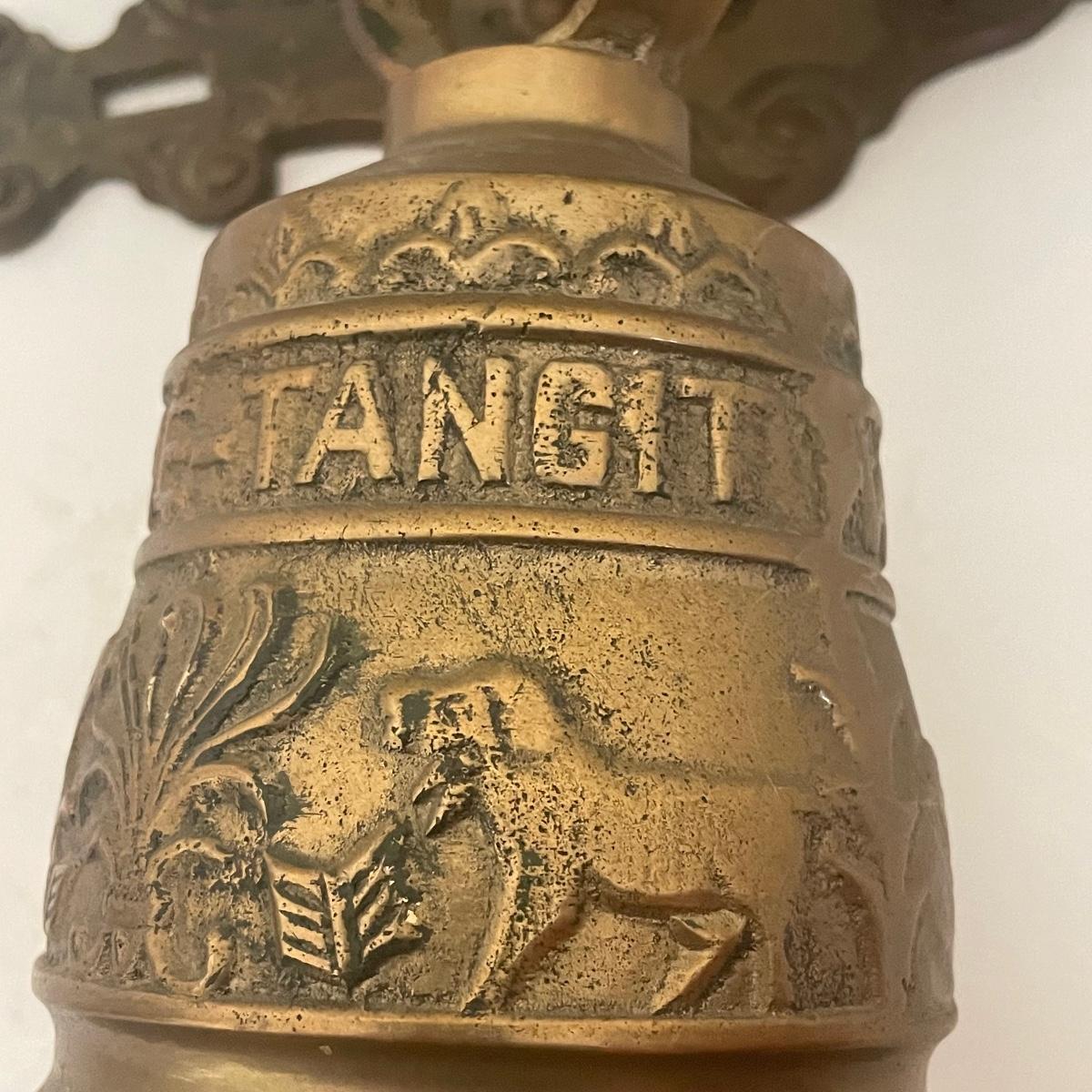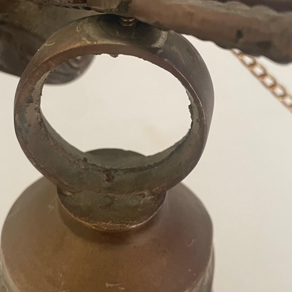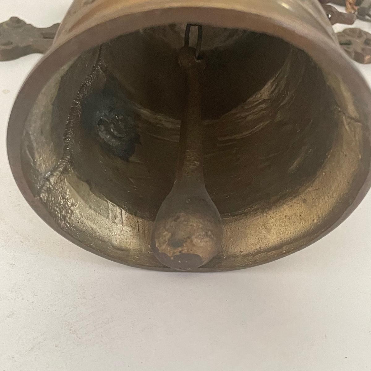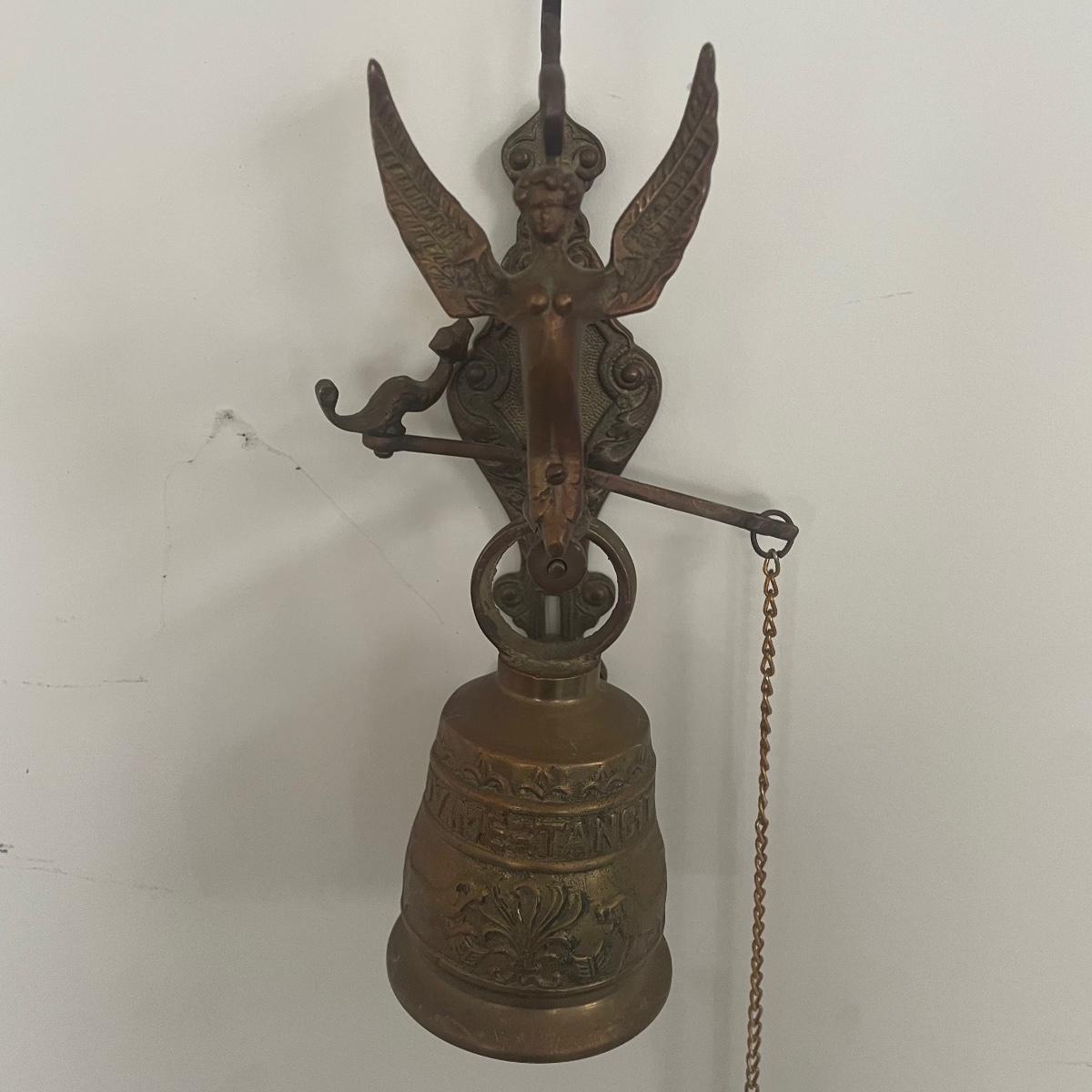 This solid brass bell has a wall mount with a chain attached to ring the bell. The bell has lots of details including Roman words and animals. Measures approximately 12” tall; the bell measures 4” d x 6.5” tall.