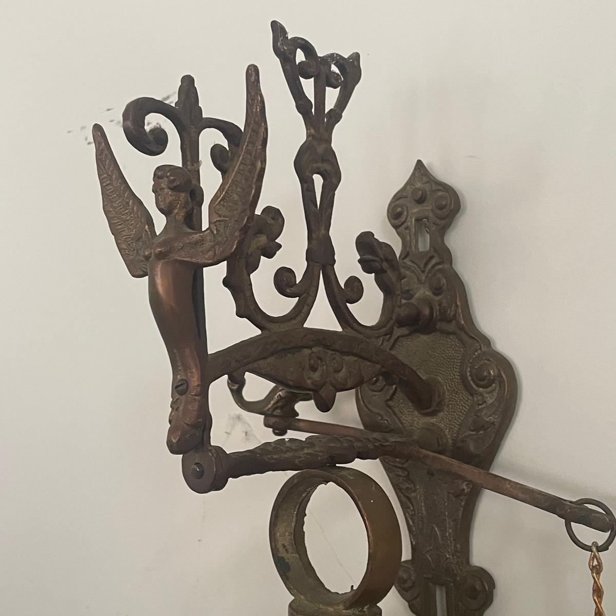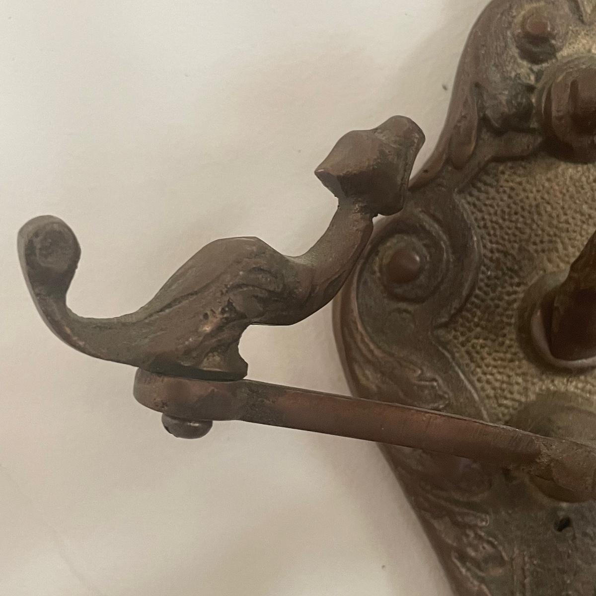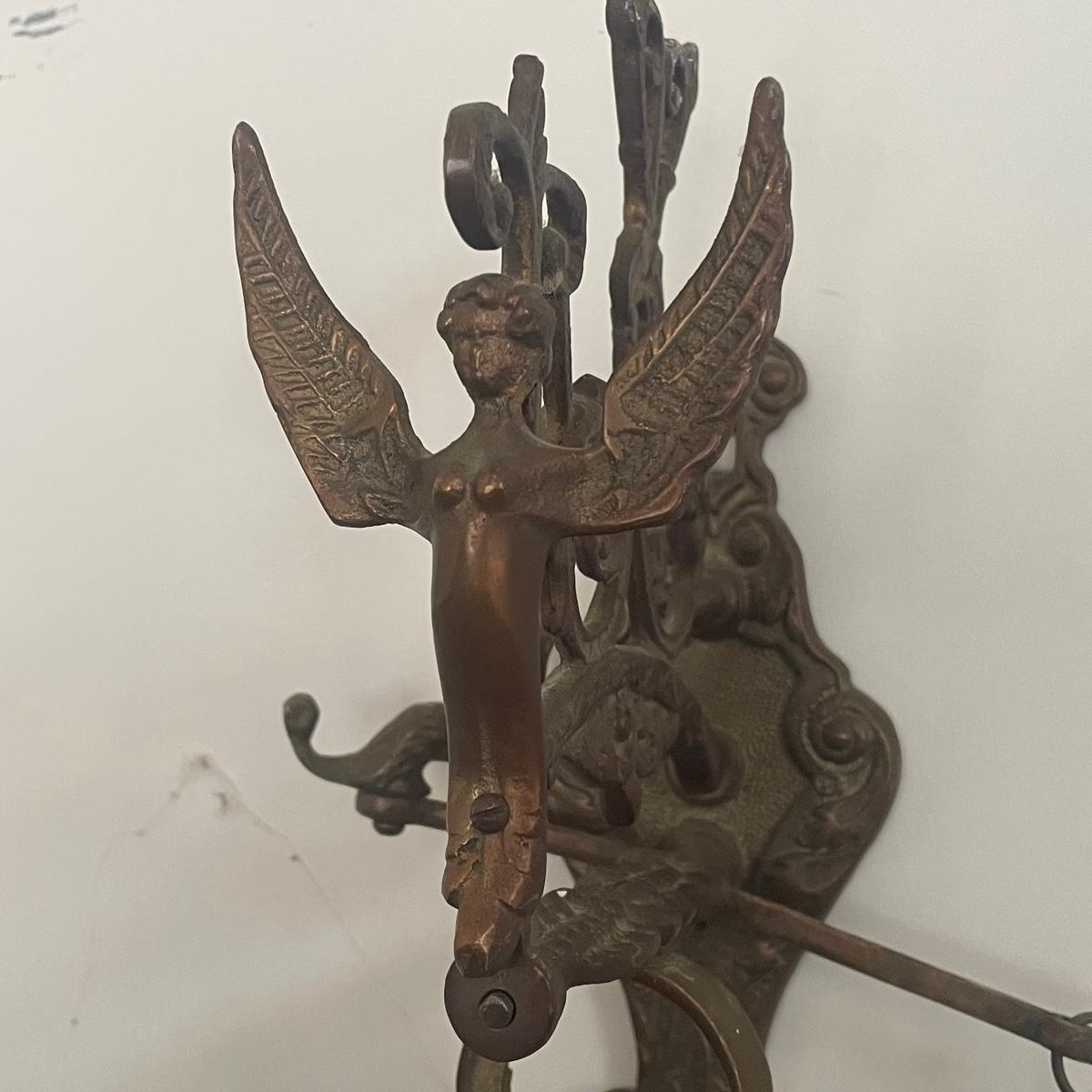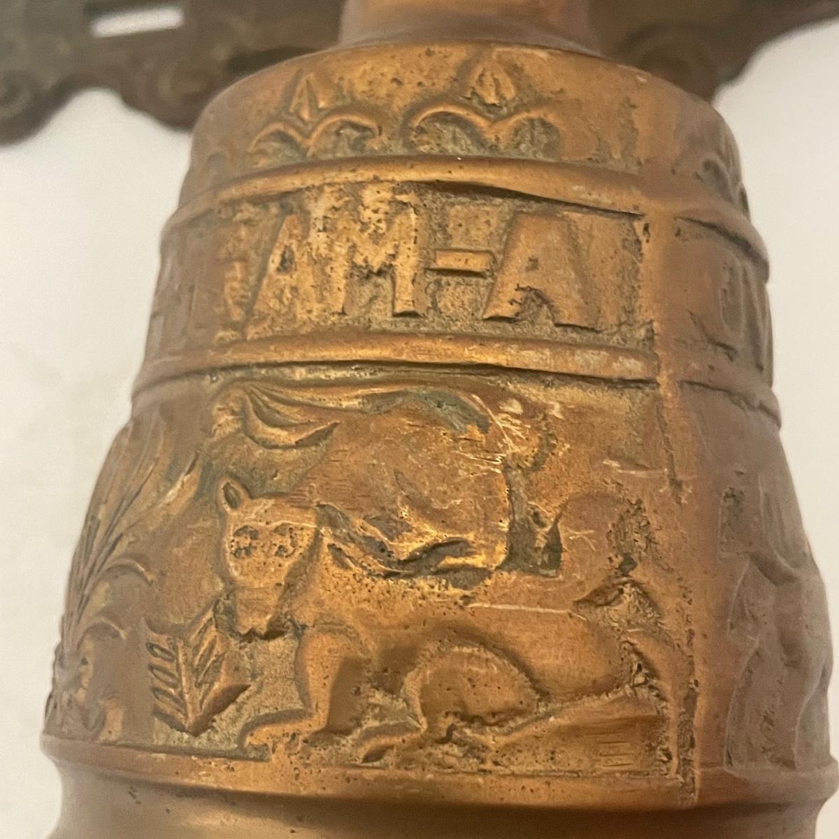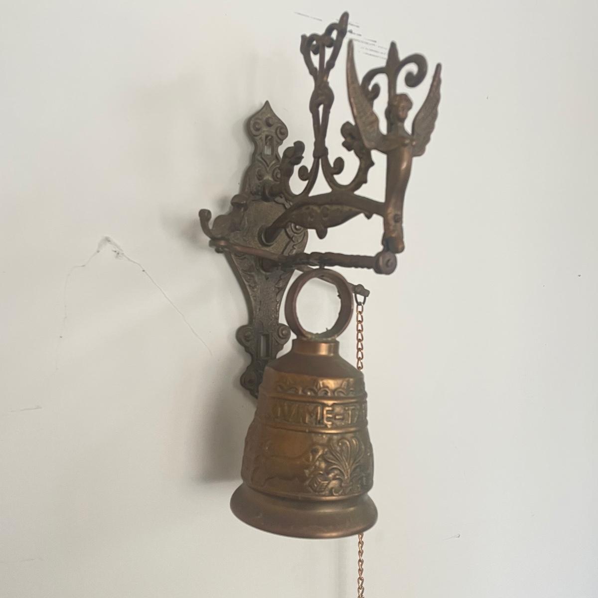 This solid brass bell has a wall mount with a chain attached to ring the bell. The bell has lots of details including Roman words and animals. Measures approximately 12” tall; the bell measures 4” d x 6.5” tall.
