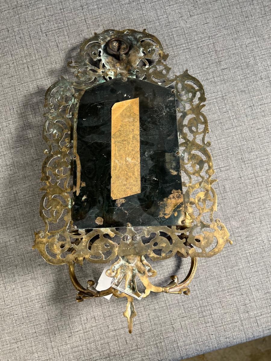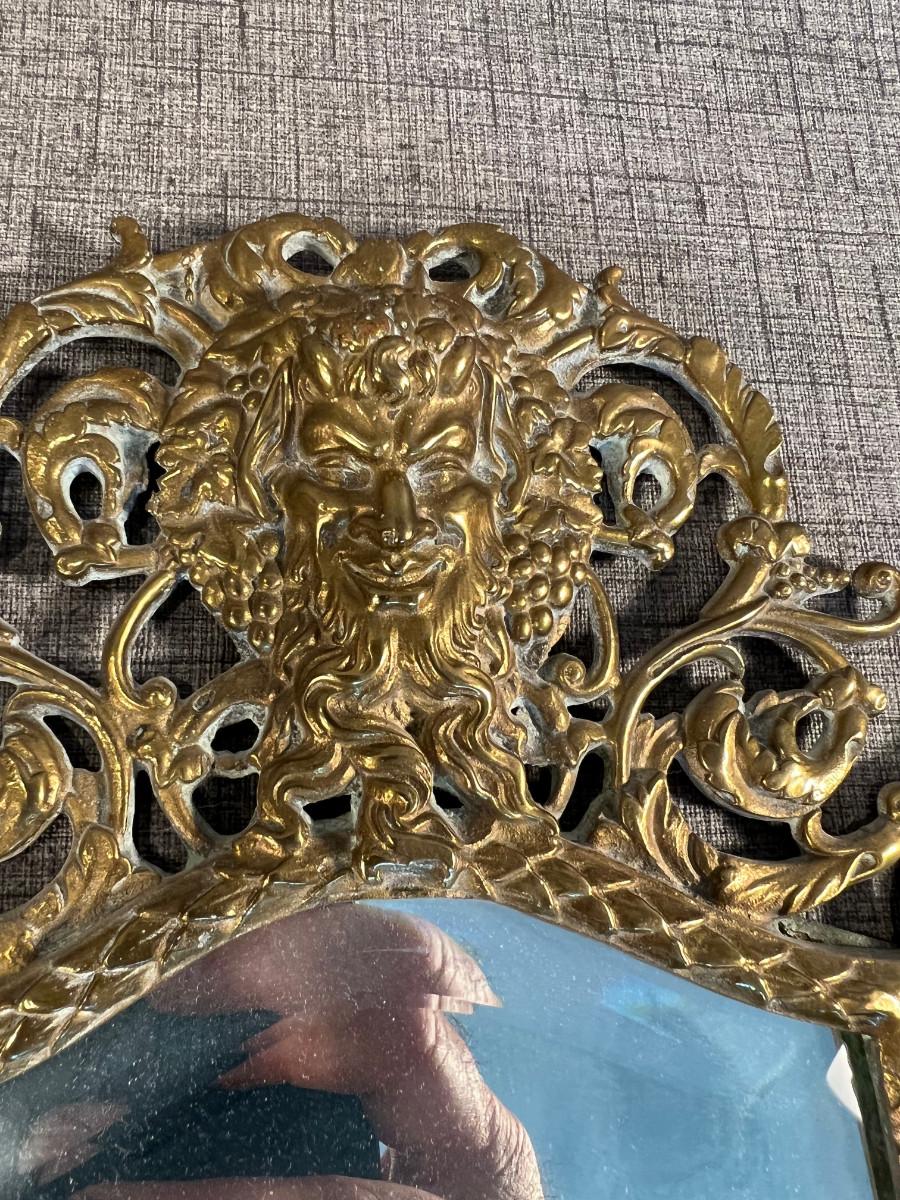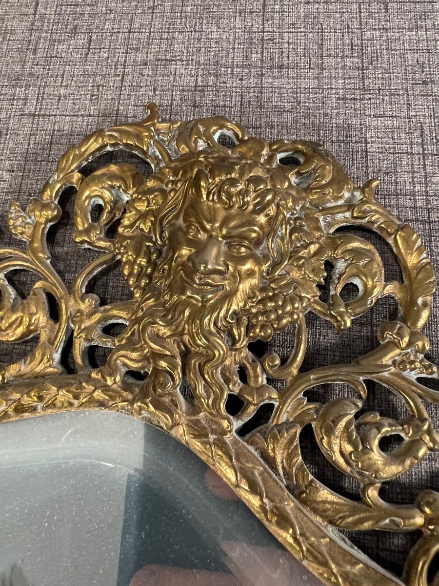 Solid Brass Mirror Candle Holder Sconces, Antique Greek God "PAN". Excellent condition, measures 17" by 10" wide. Beveled glass mirror, quite old. I believe the face depicted in the casting is the Greek God Pan.