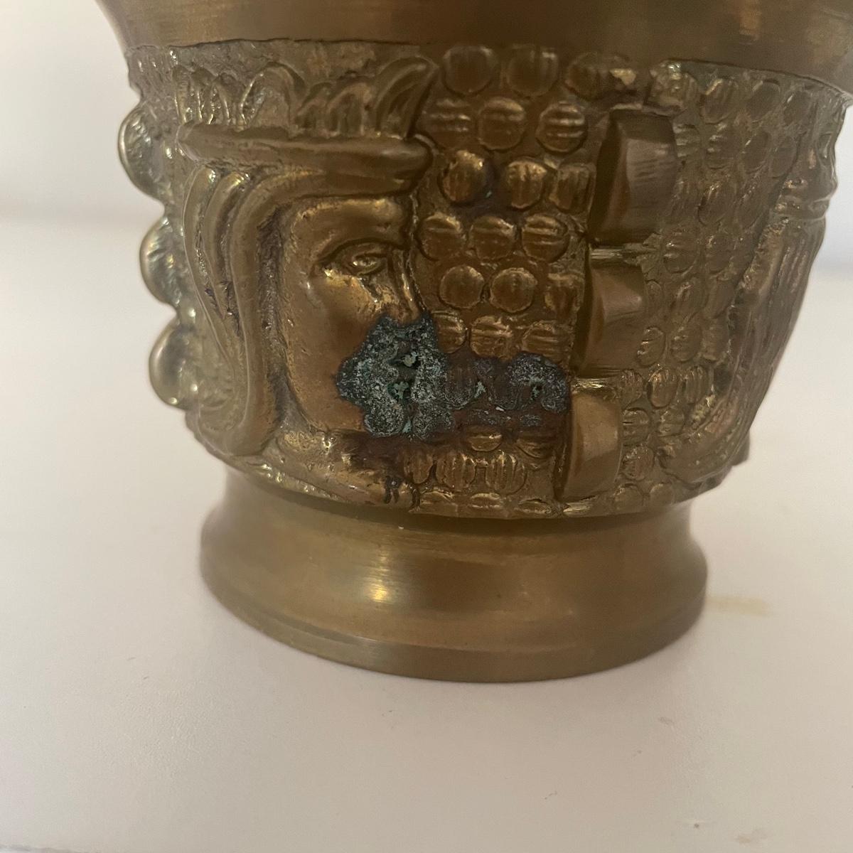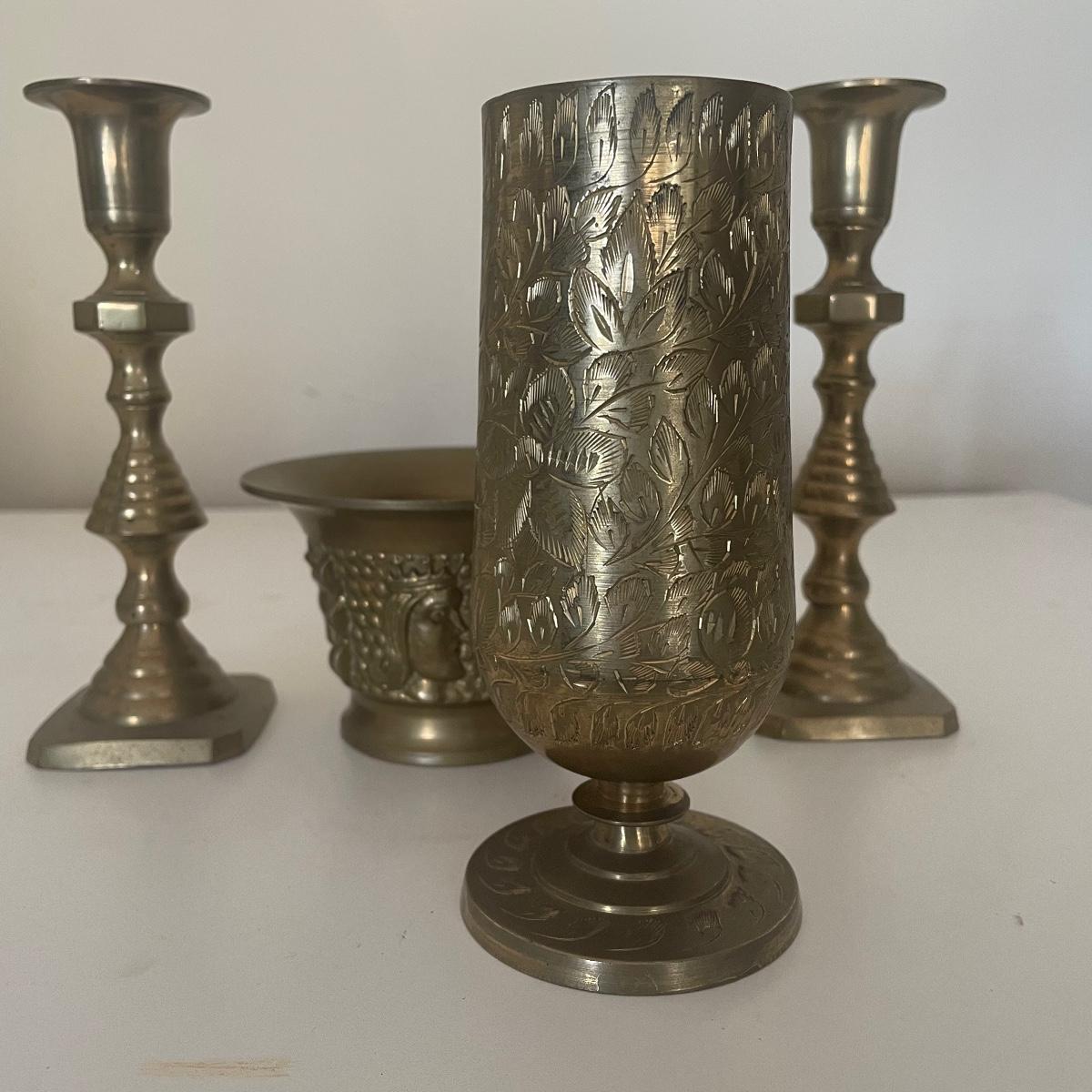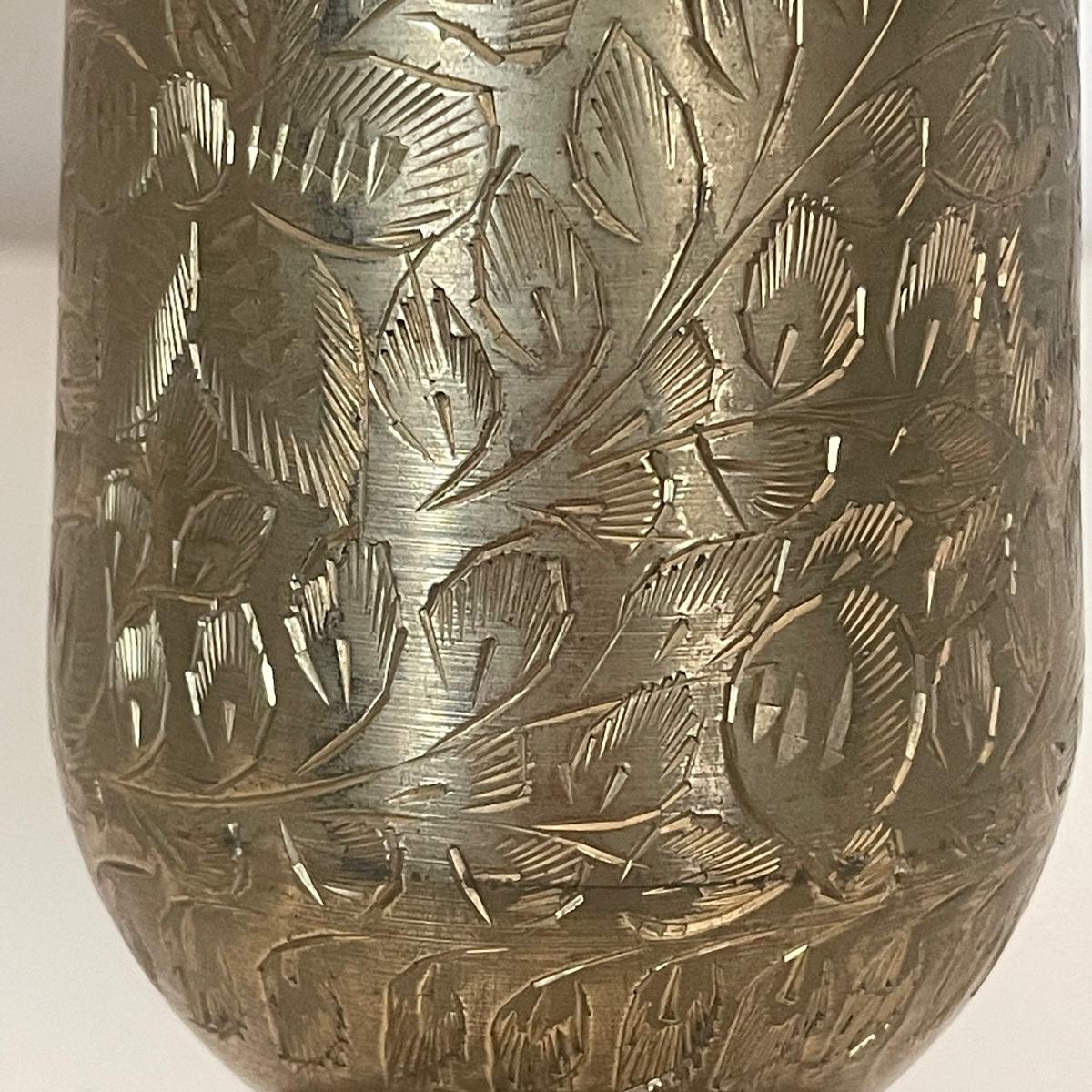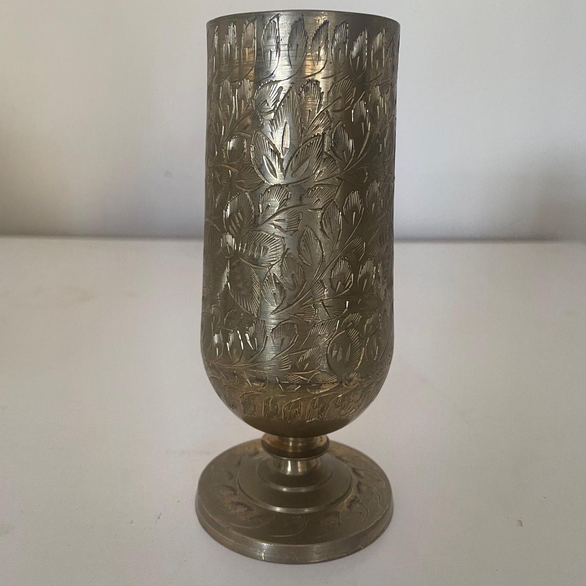 Five solid brass pieces in this lot. The goblet has a beautiful etched floral design and measures 2” d x 6”. All items are in good condition with just one spot of oxidation on the outside of the bowl and two small spots on the inside.