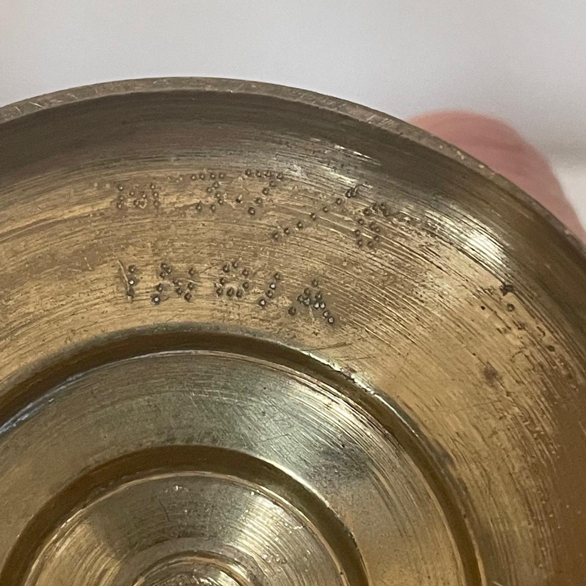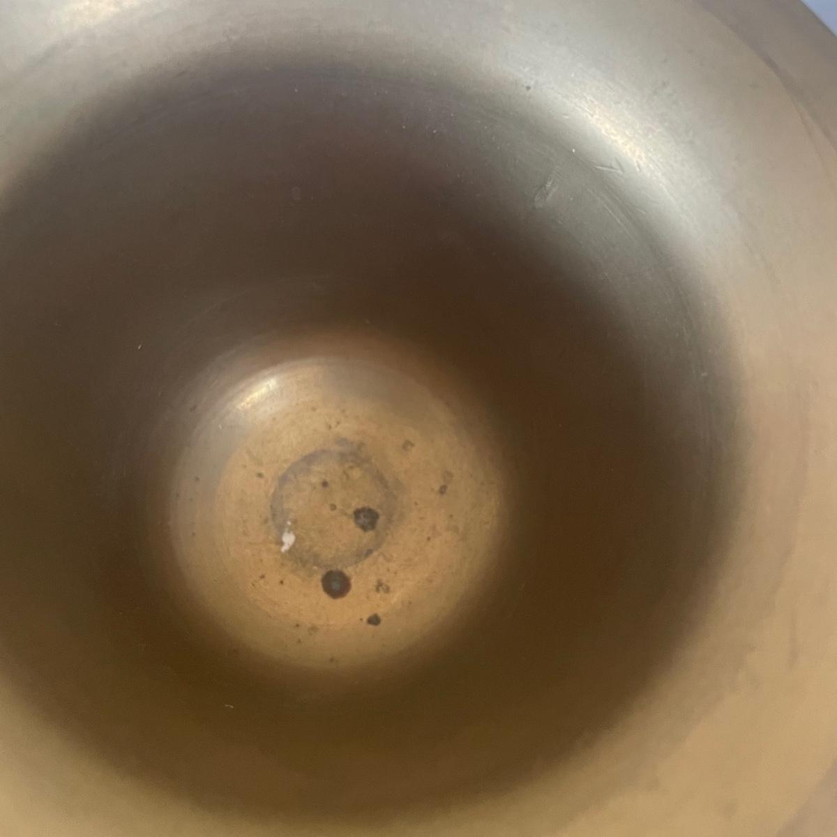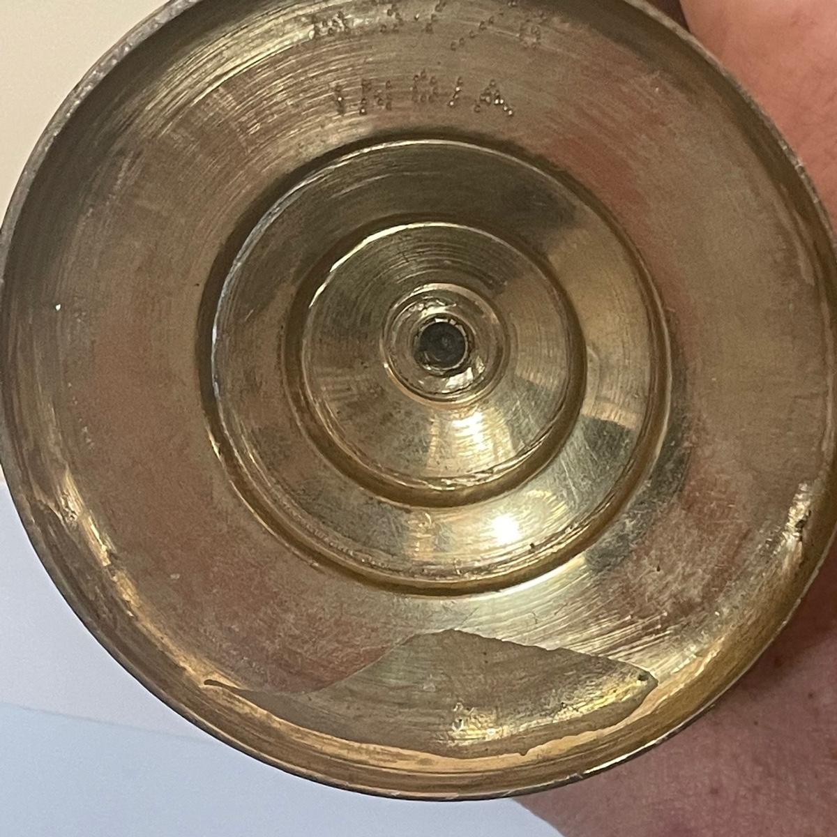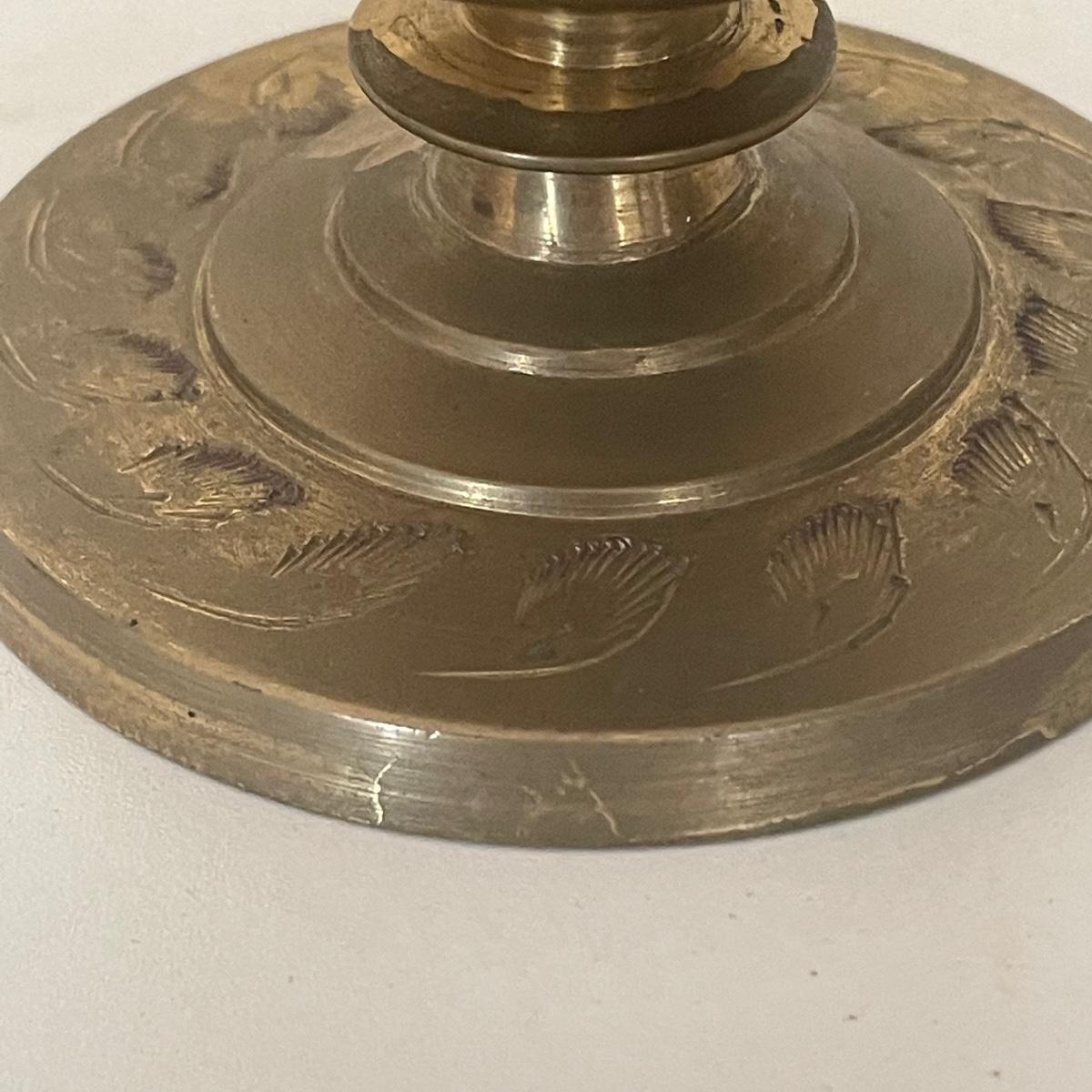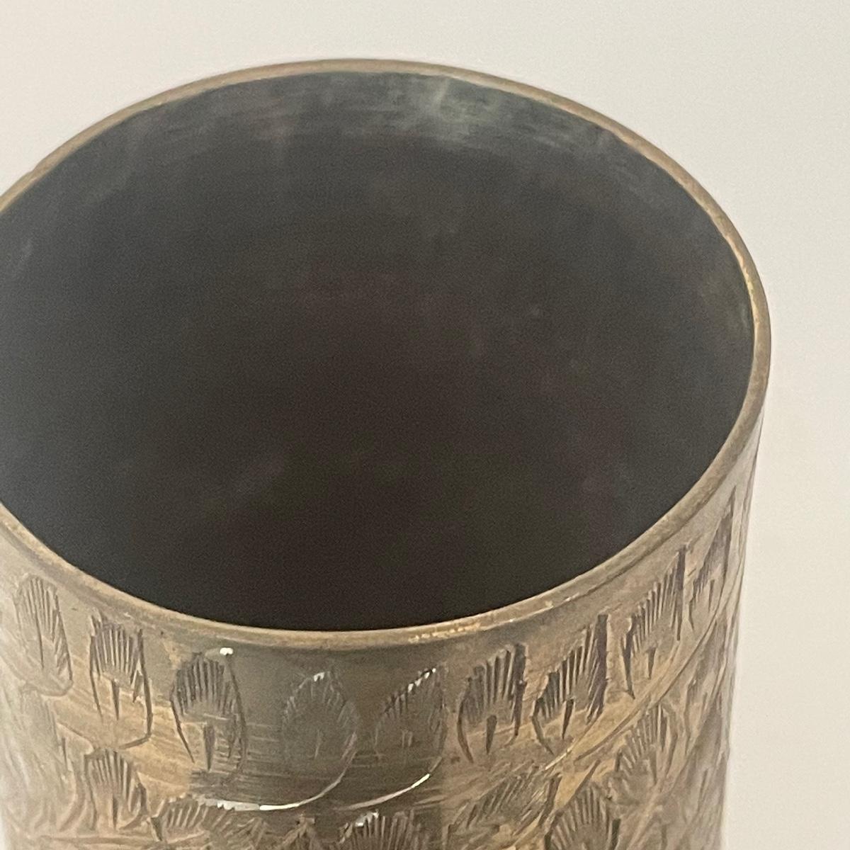 Five solid brass pieces in this lot. The goblet has a beautiful etched floral design and measures 2” d x 6”. All items are in good condition with just one spot of oxidation on the outside of the bowl and two small spots on the inside.