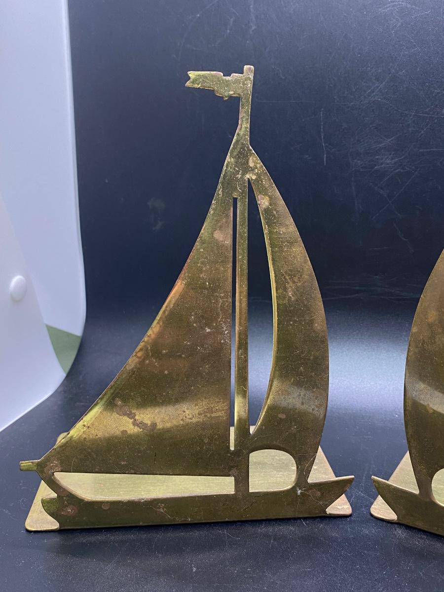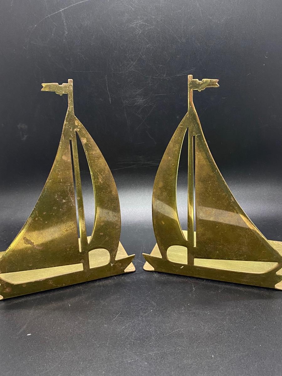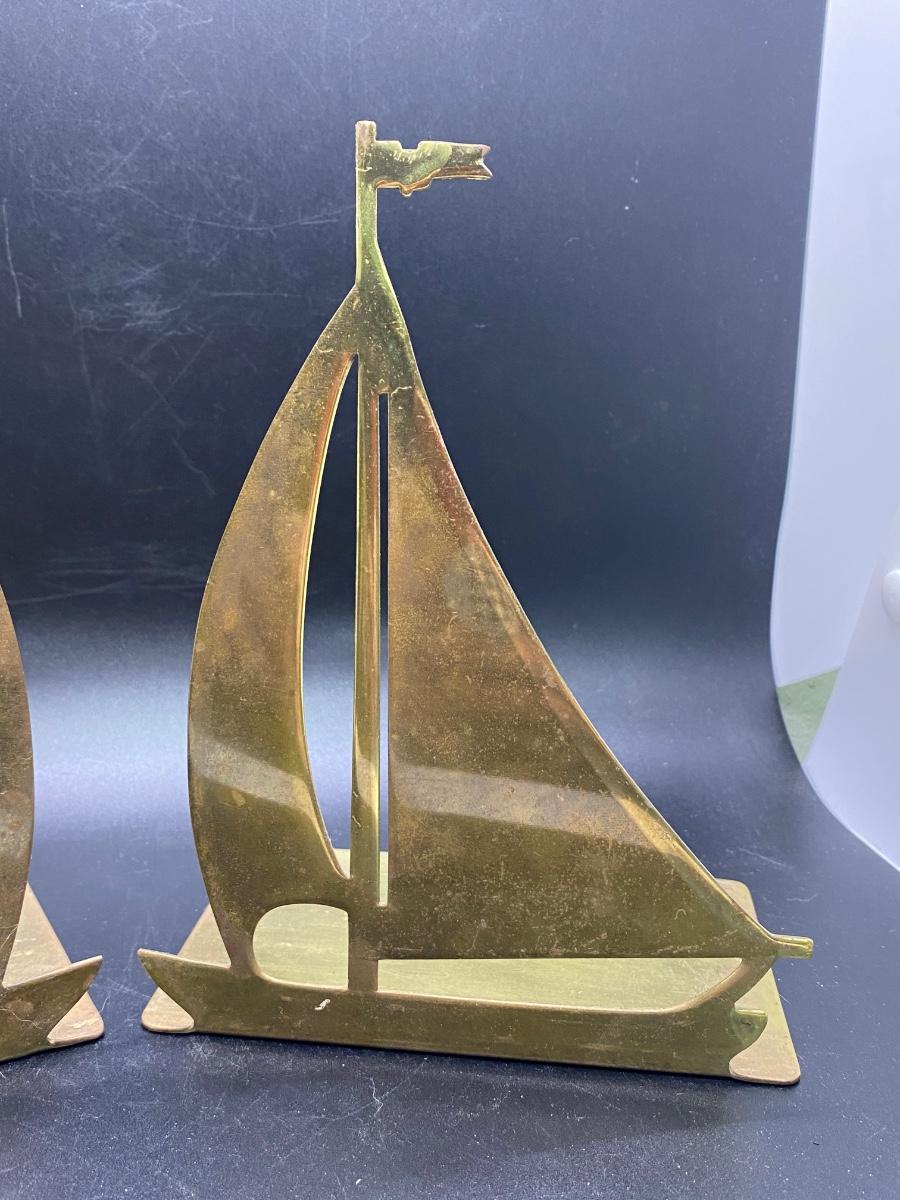 Solid brass sailboat bookends. A little wear from use and age.
