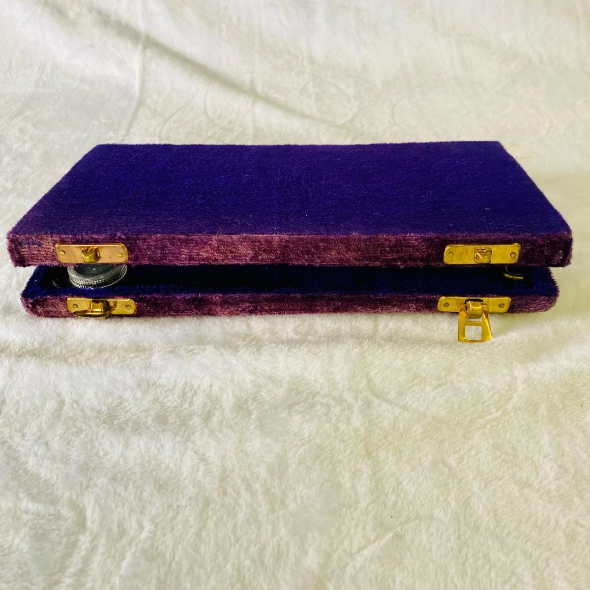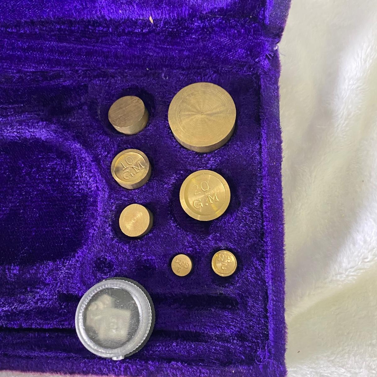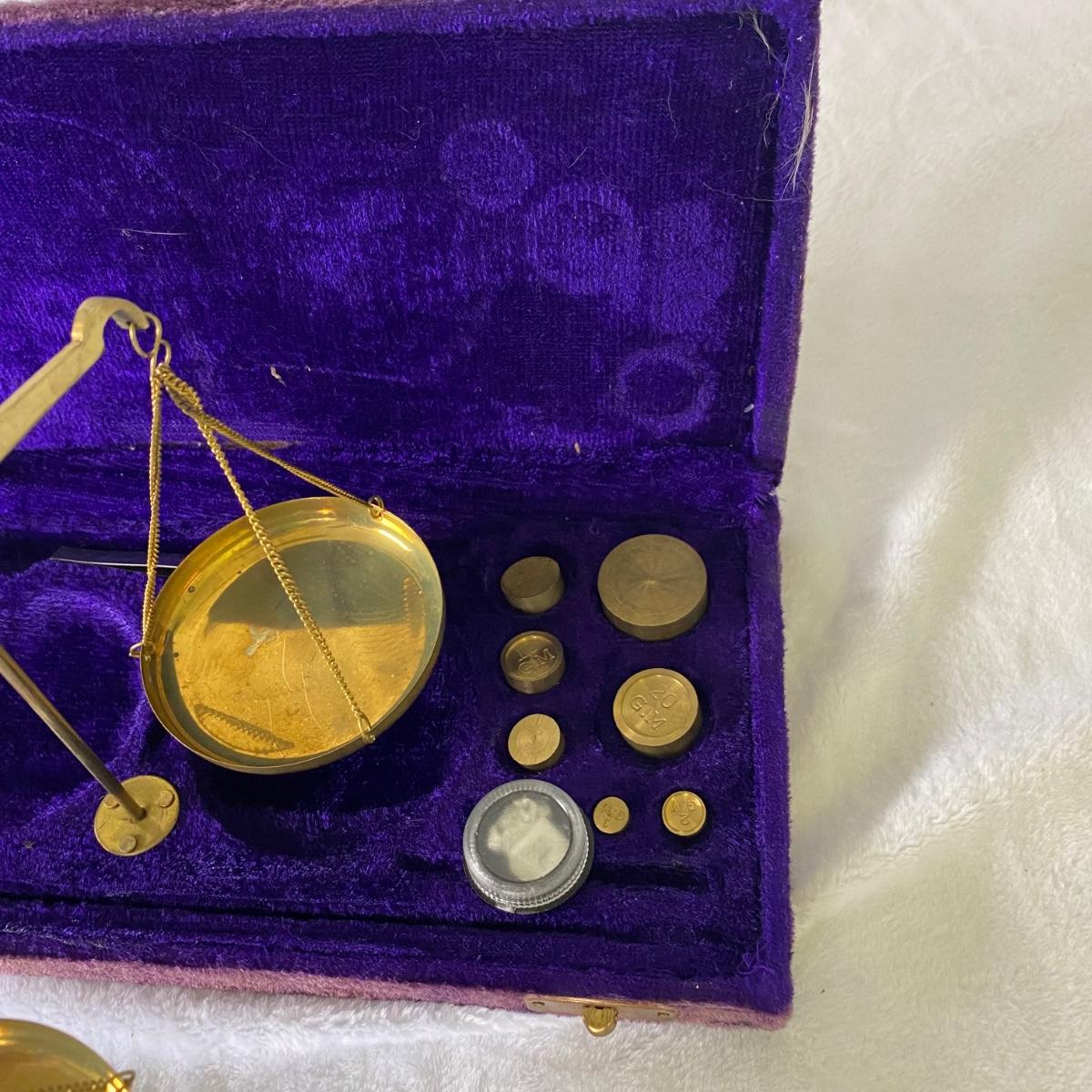 Vintage solid brass scale set in purple velvet box. Box measures 9.5”L x 5”W x 1”H.