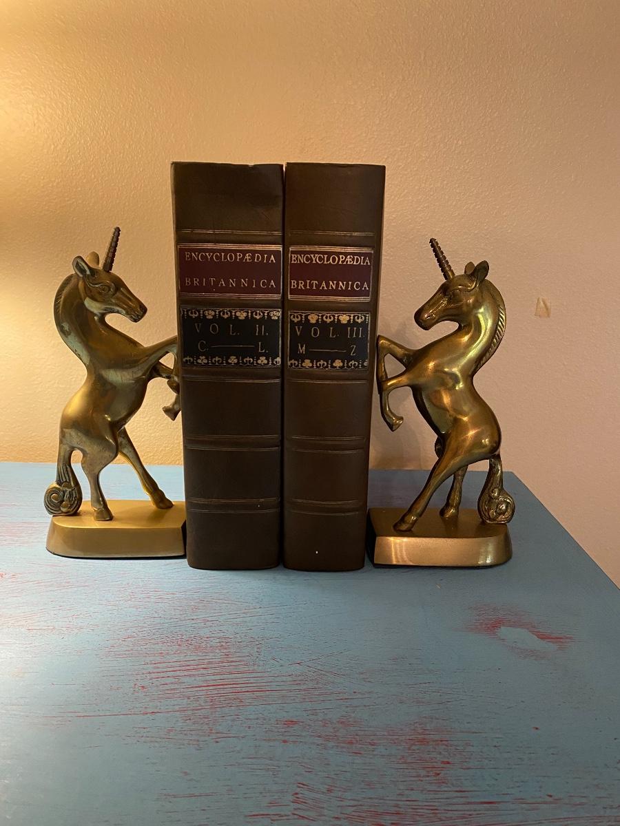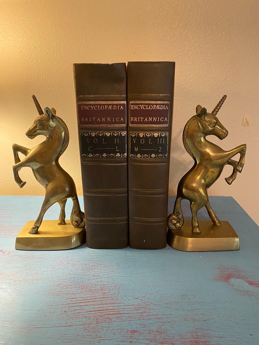 Solid brass vintage unicorn bookends, with felt bottoms. Approx 8” tall