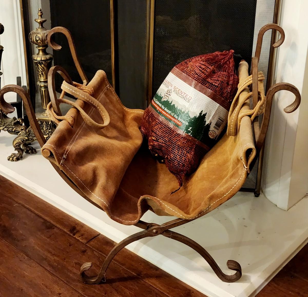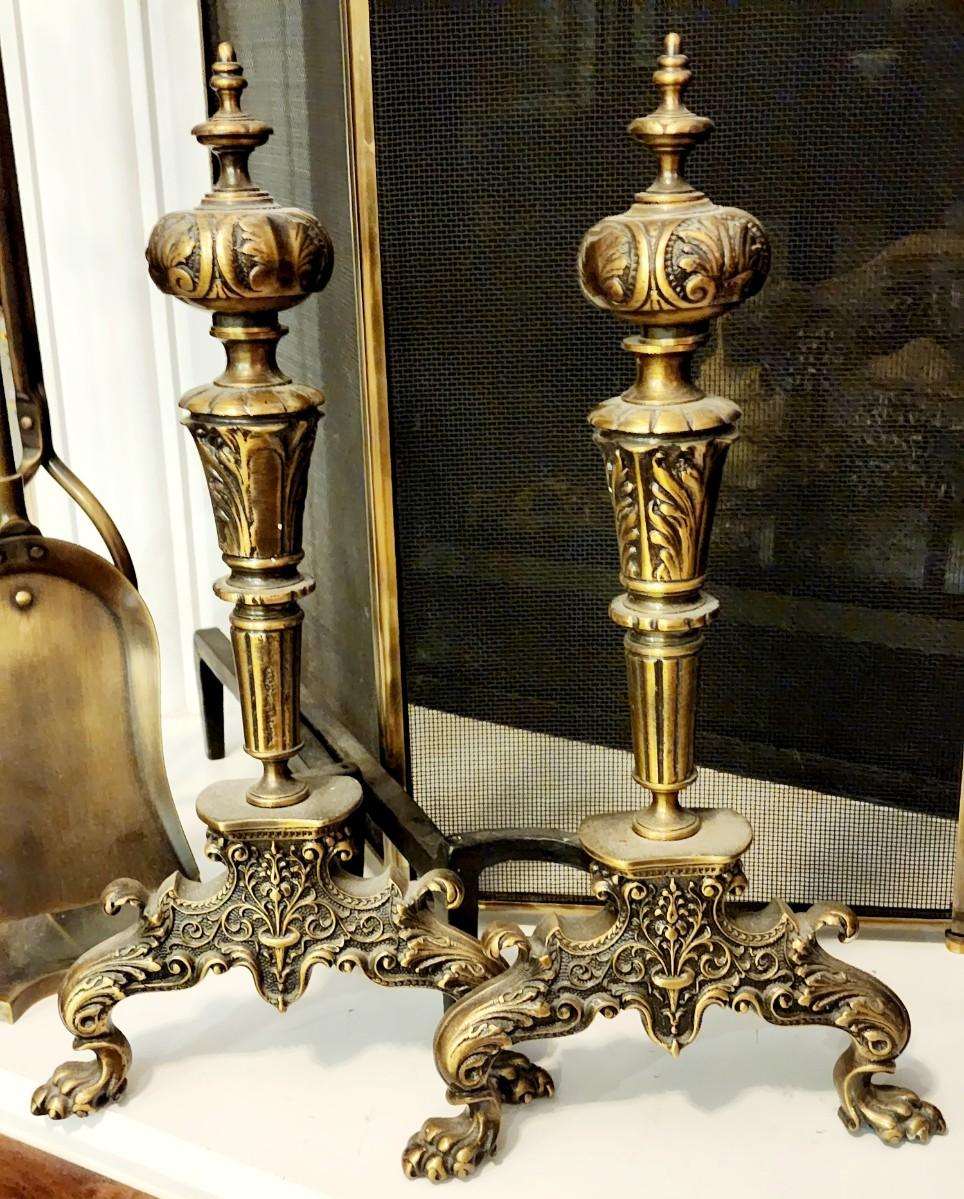 Fireplace screen, iron and bronze fireplace shovel, broom, poker and tongs in stand, ornate bronze andirons and iron and leather firewood caddy. All like new and beautiful.