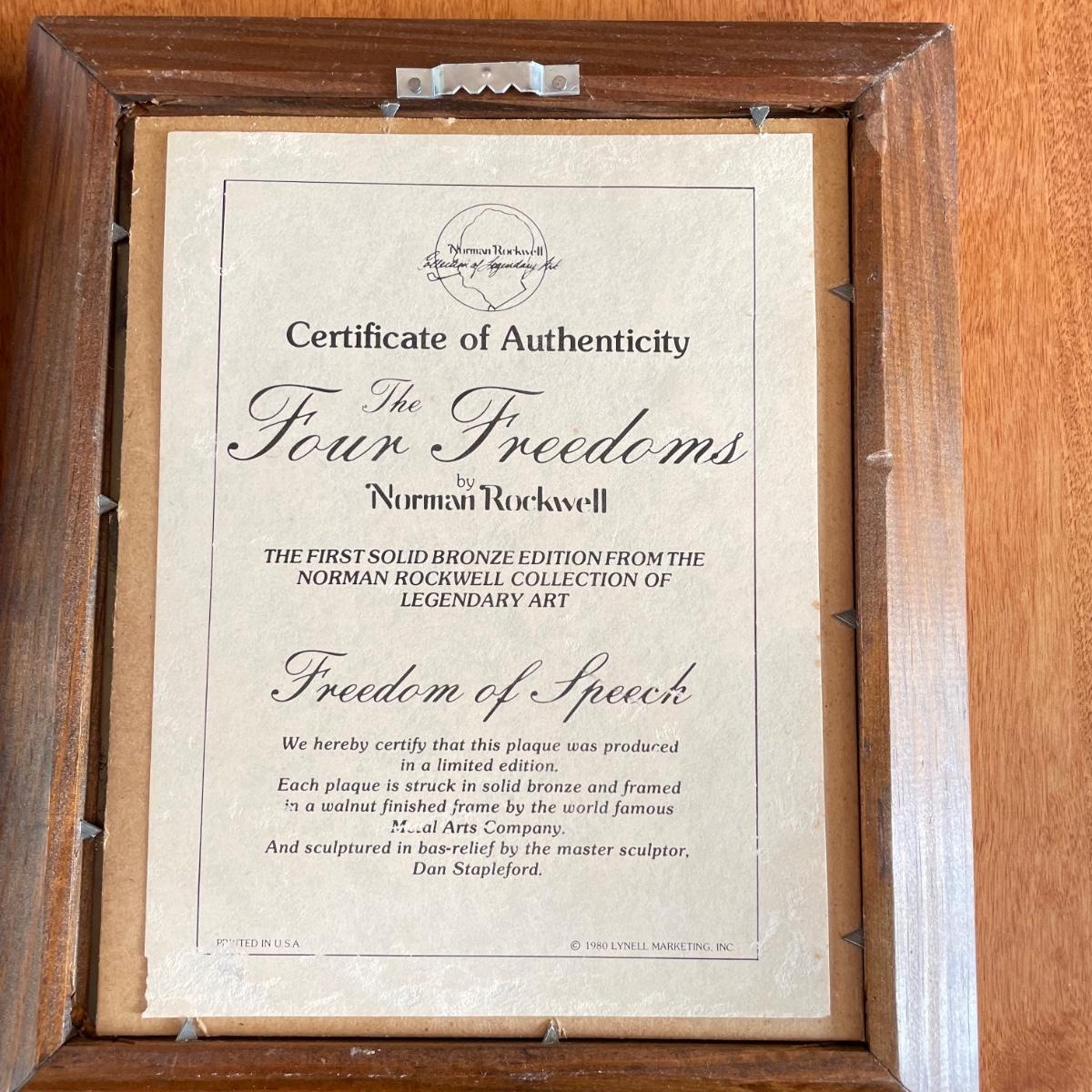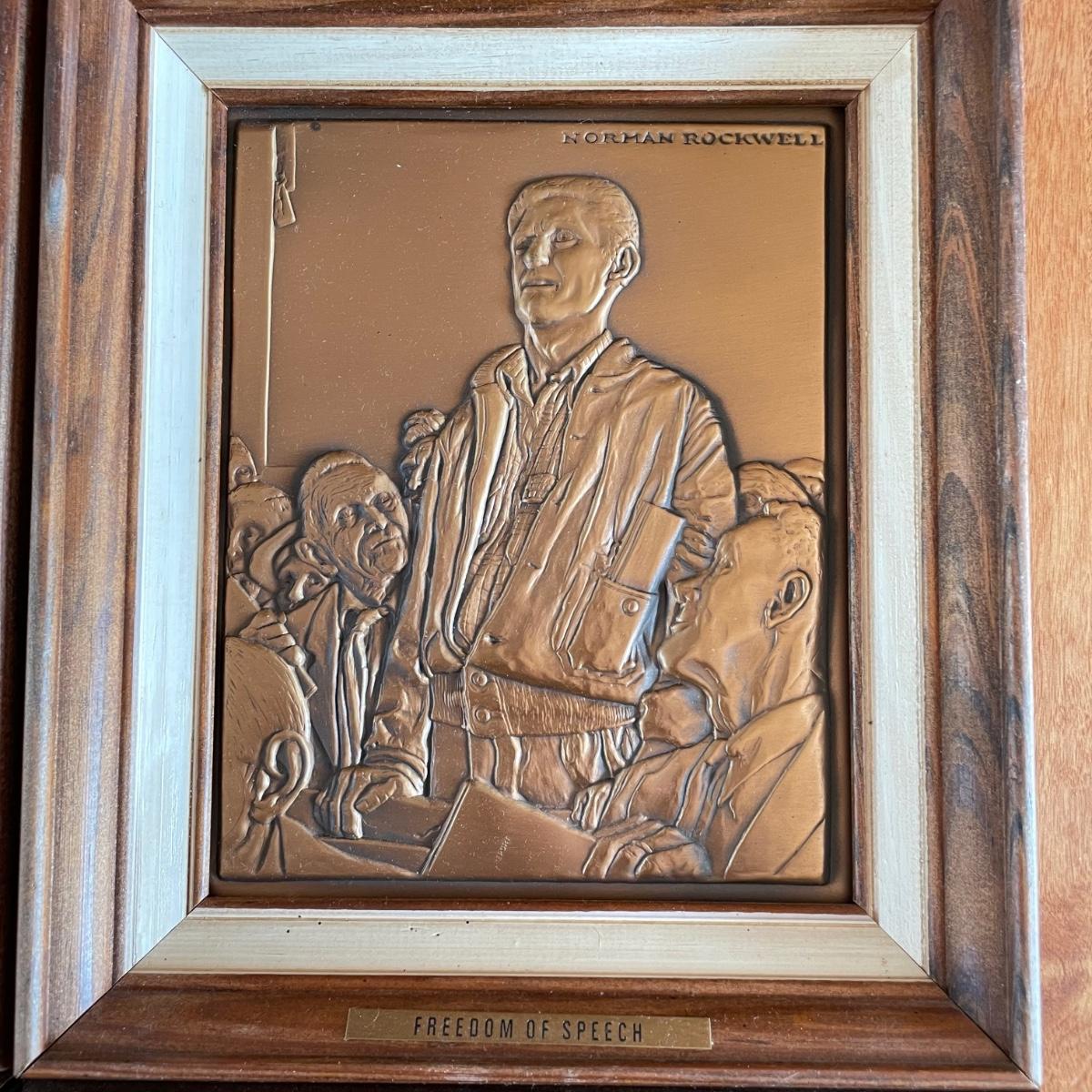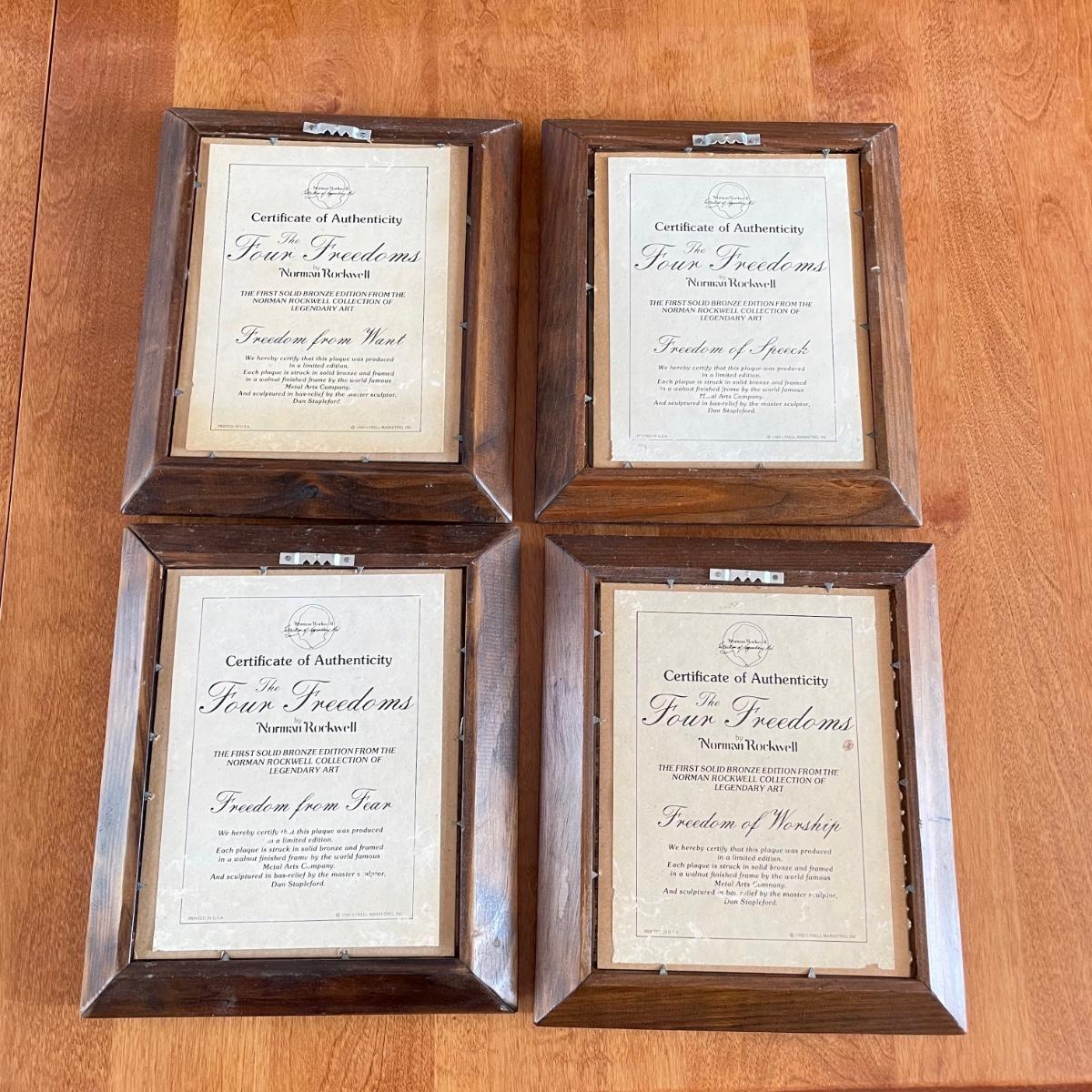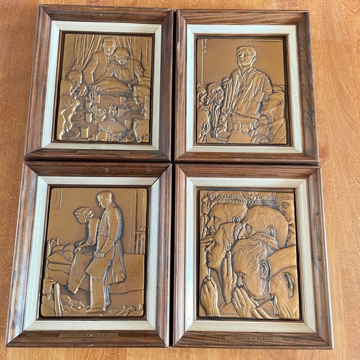 A full set of four solid bronze art by Norman Rockwell. Each has a matching wood frame and an unprotected COA on the backside. The Freedom From Fear plate has one corner of its frame separating slightly. Frames each measure 8.5” x 10”. See images. Shipping available.