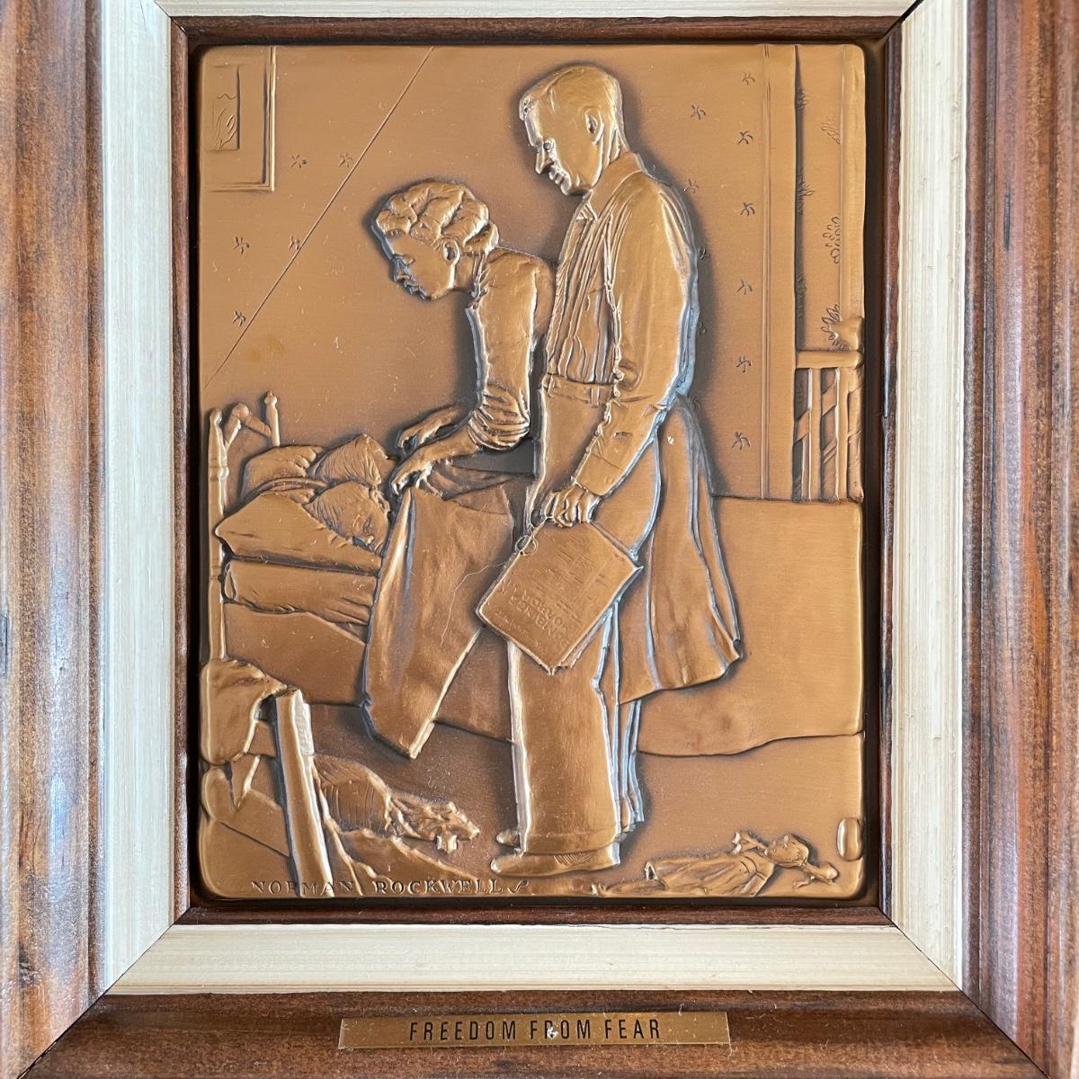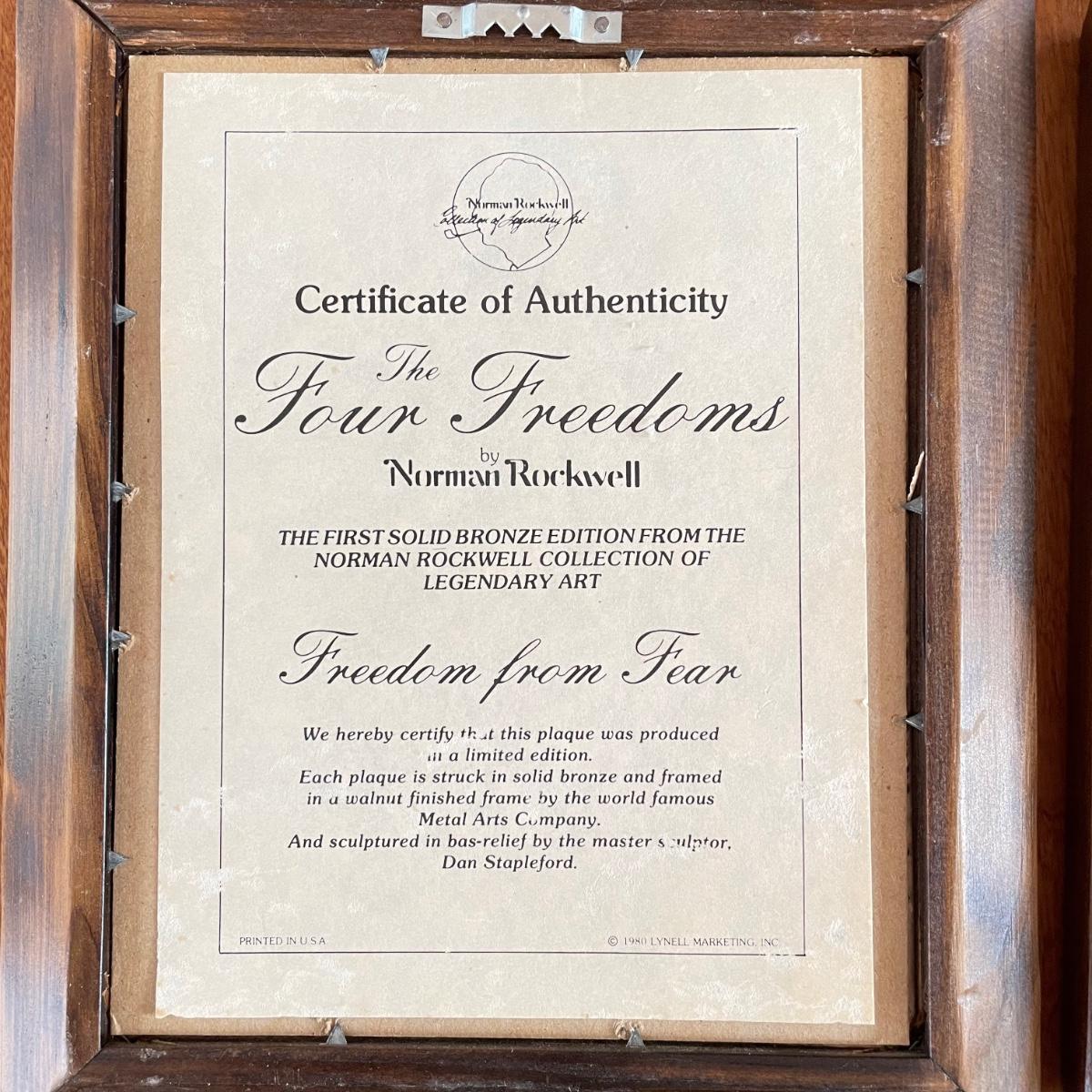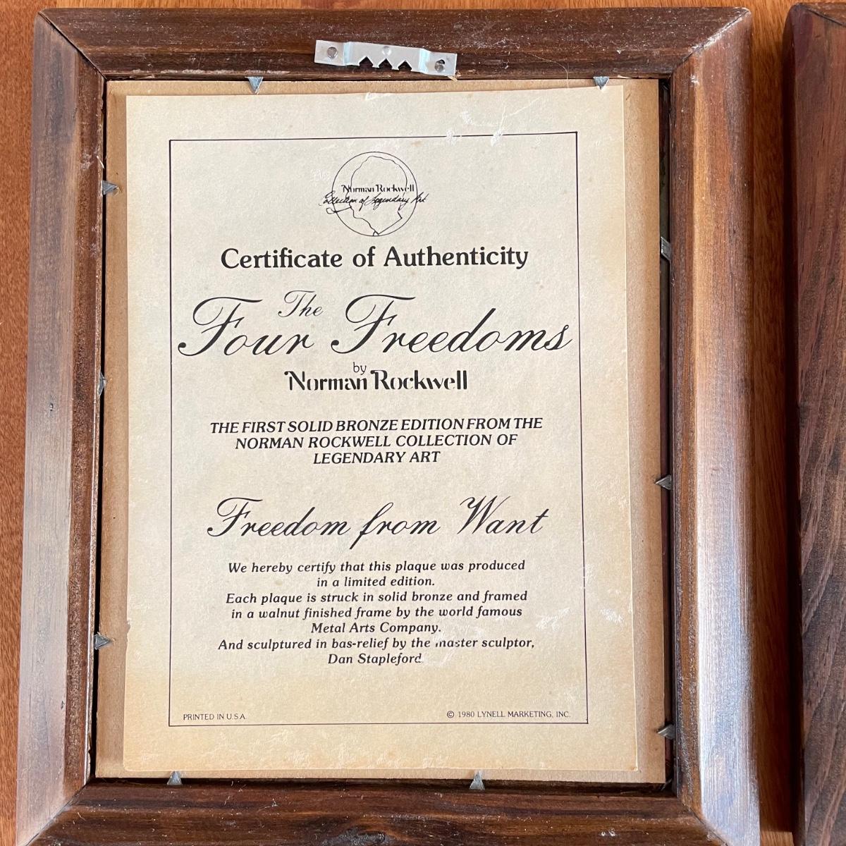 A full set of four solid bronze art by Norman Rockwell. Each has a matching wood frame and an unprotected COA on the backside. The Freedom From Fear plate has one corner of its frame separating slightly. Frames each measure 8.5” x 10”. See images. Shipping available.