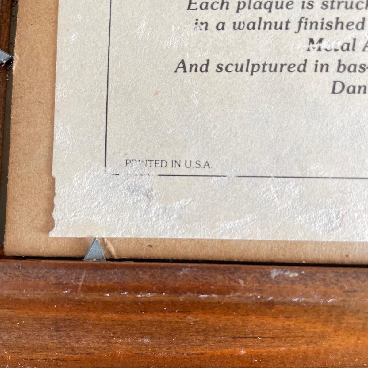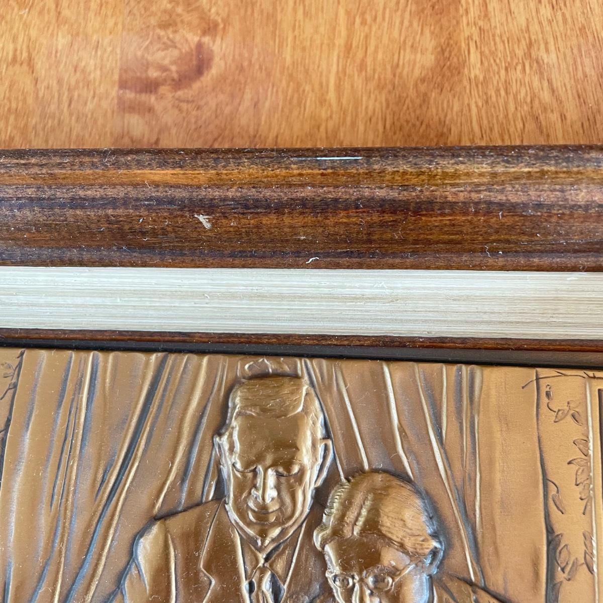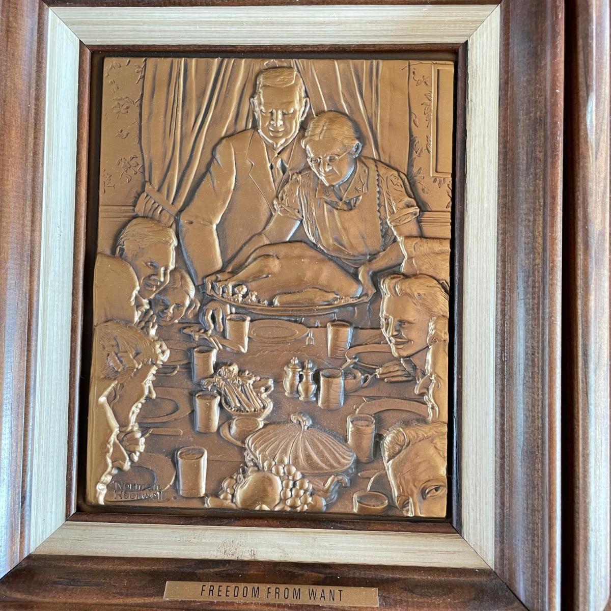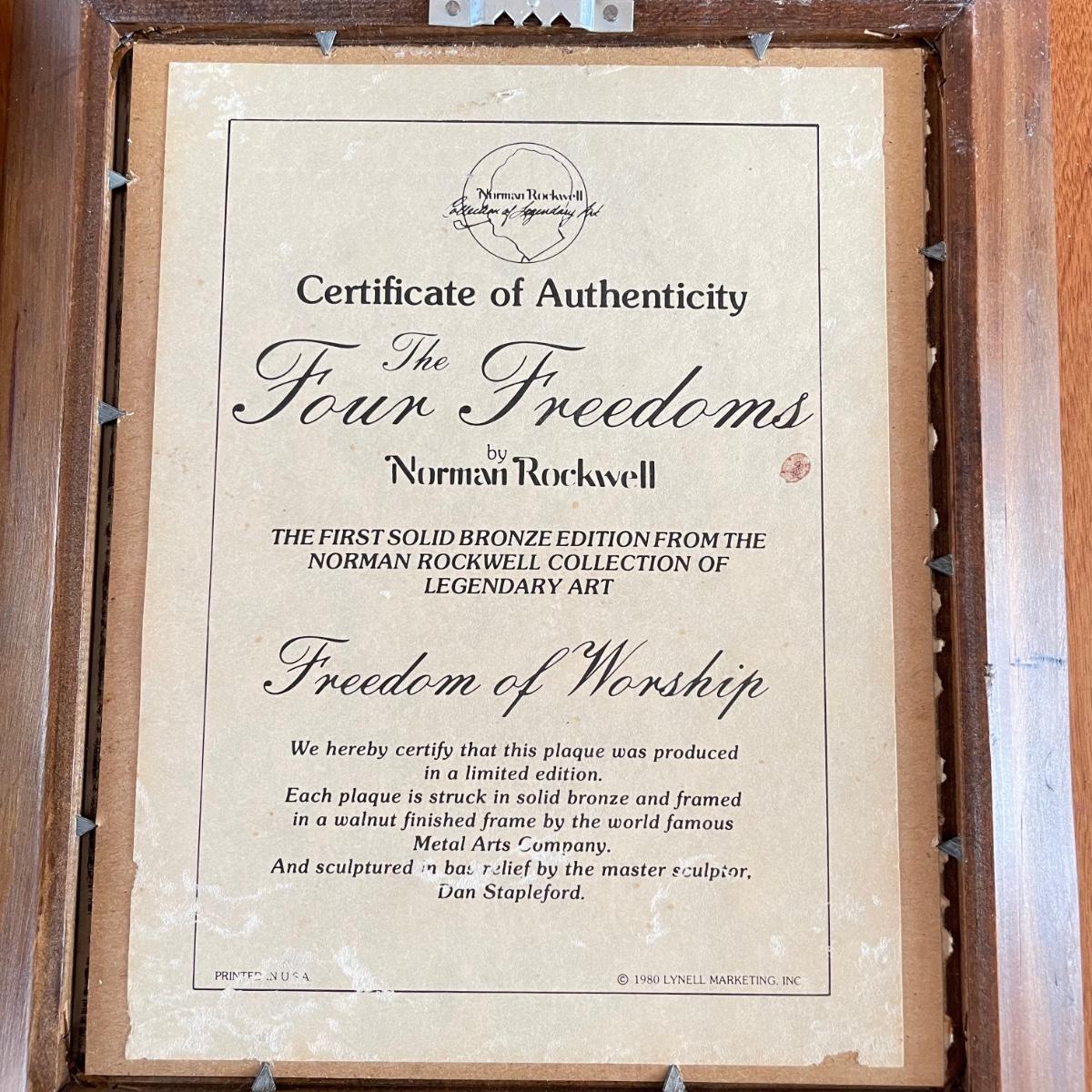 A full set of four solid bronze art by Norman Rockwell. Each has a matching wood frame and an unprotected COA on the backside. The Freedom From Fear plate has one corner of its frame separating slightly. Frames each measure 8.5” x 10”. See images. Shipping available.