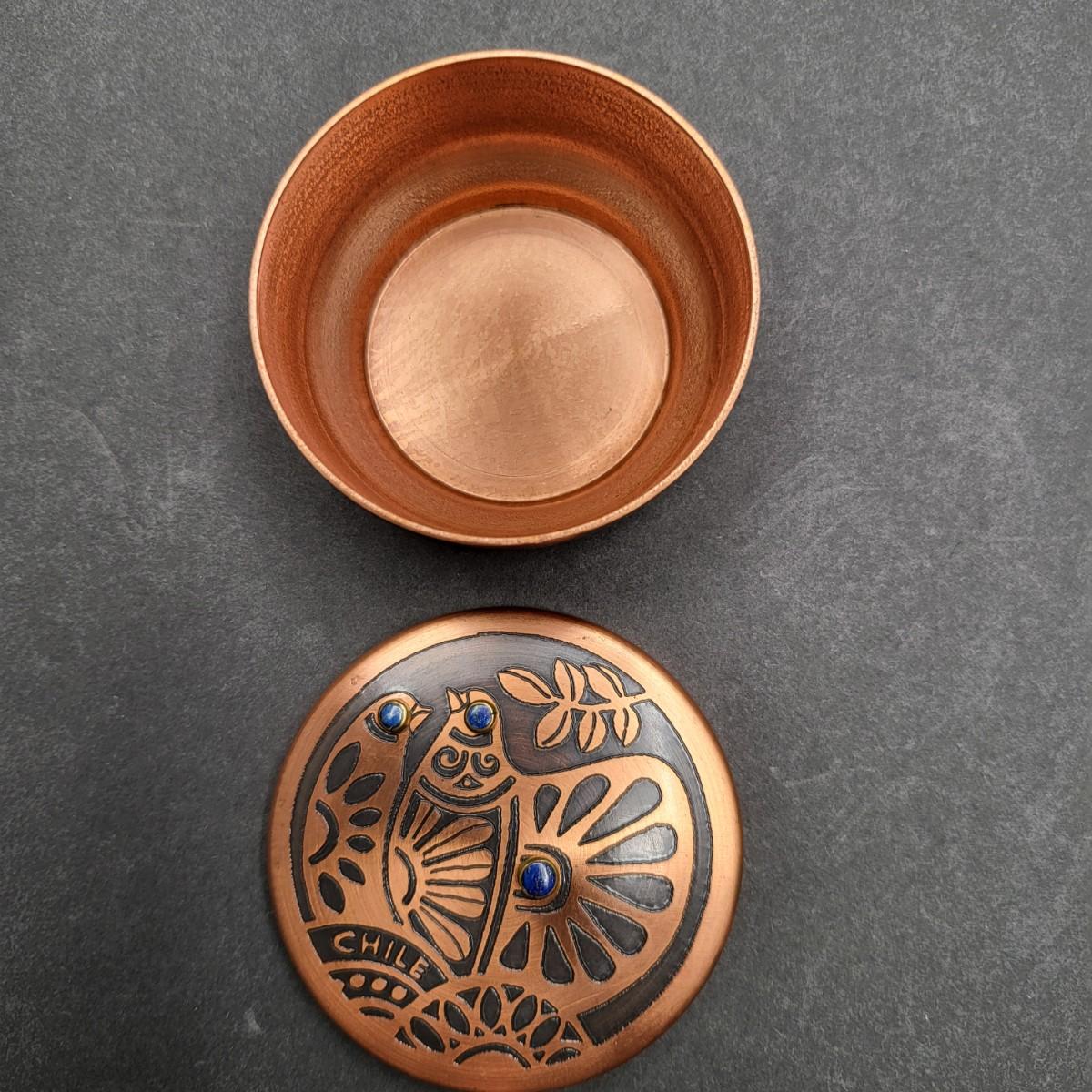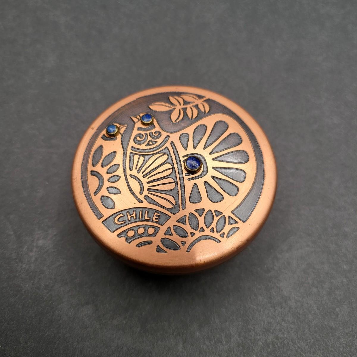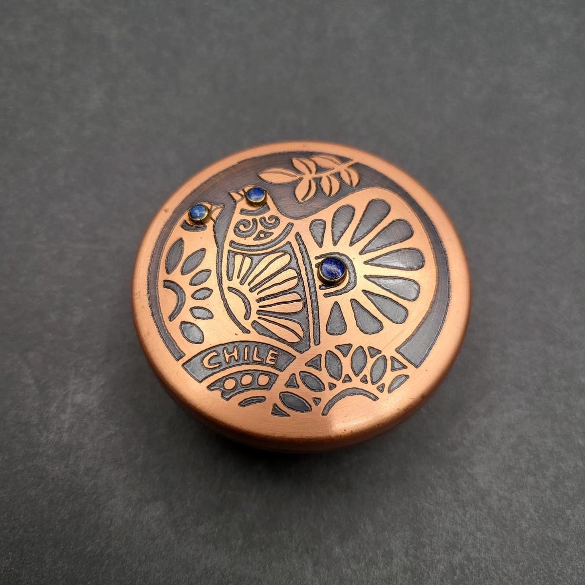 2.25" round x 1" tall, copper trinket box, bird/doves etched and accents of blue lapis lazuli stones. Made in Chile.