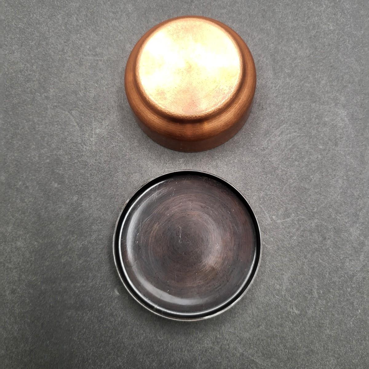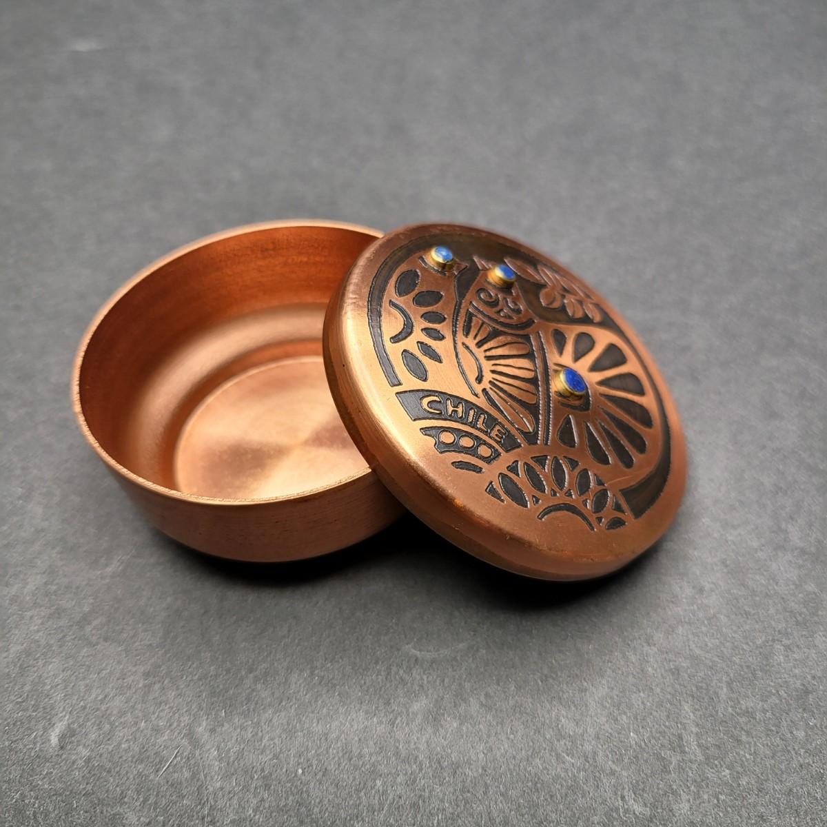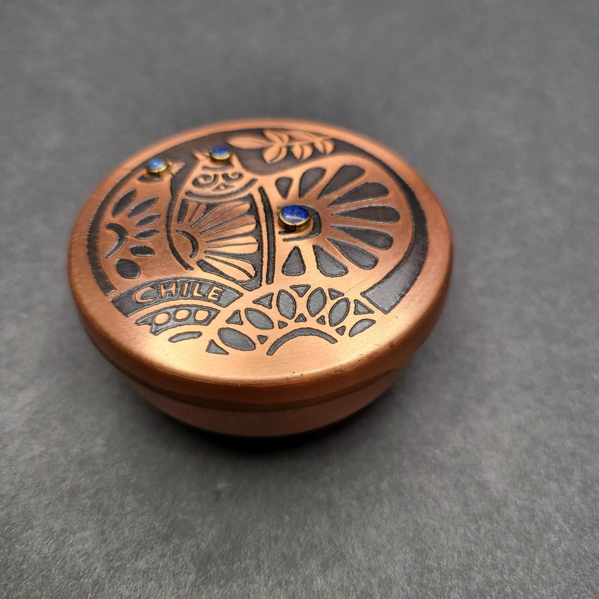 2.25" round x 1" tall, copper trinket box, bird/doves etched and accents of blue lapis lazuli stones. Made in Chile.