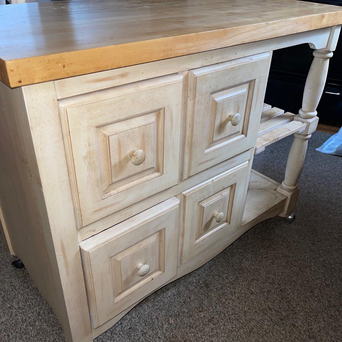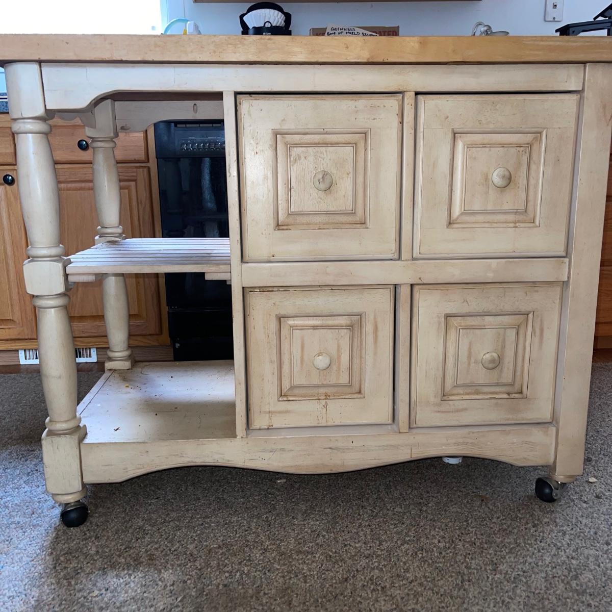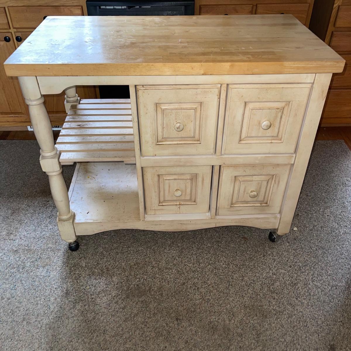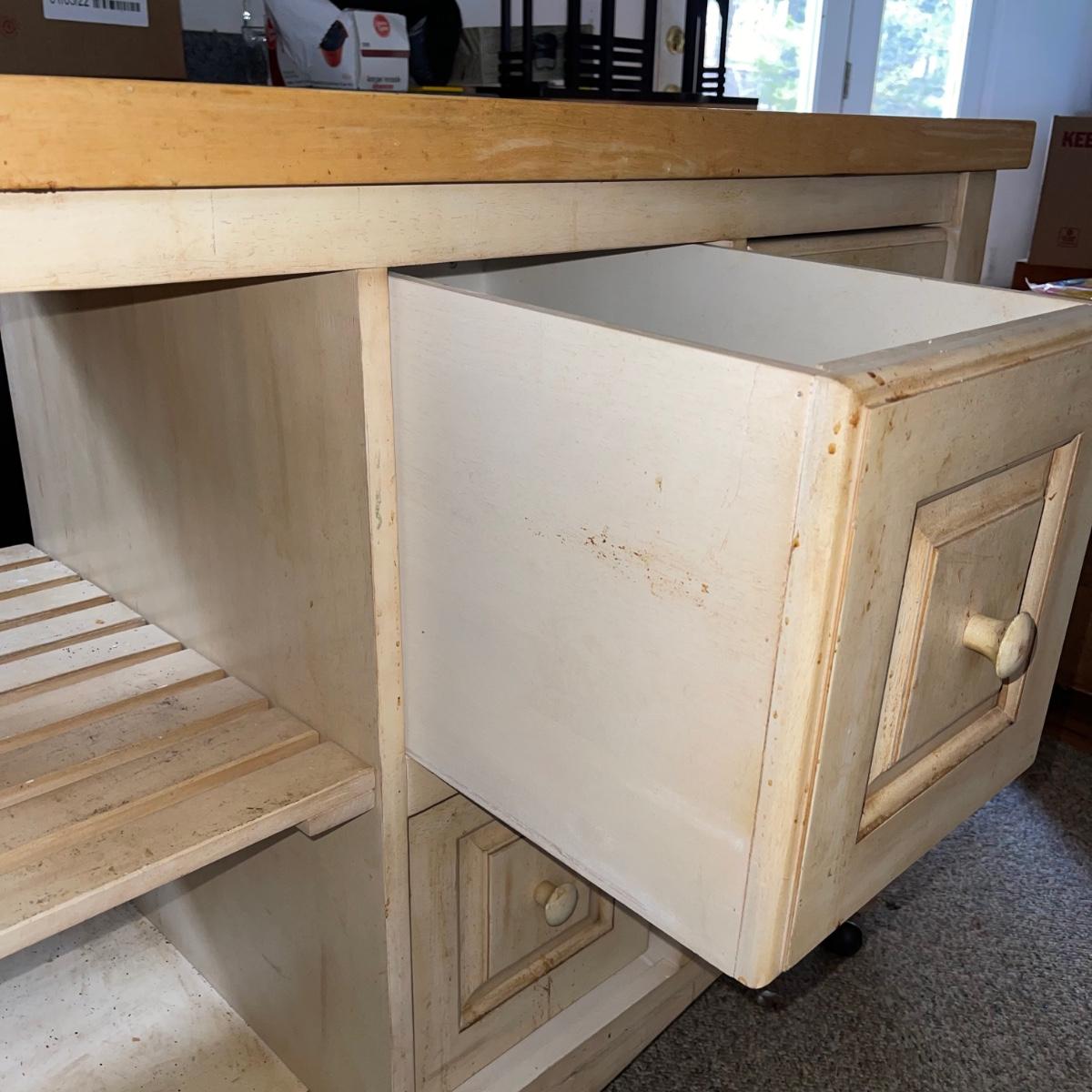This kitchen island is 44 inches long, 24 inches wide, and 35.5 inches tall. It has a glossy butcher block style top, two shelves on one end, and four large drawers. The body of the island is a very light tan color. There are handles on either side of each drawer so they can be accessed from either side of the island. The drawer sides are 11 inches tall, the interior of the drawers are 11 inches x 20 inches. A lot of deep storage space. It is also on wheels so it’s easy to move around. As you can see from photos. One wheel is broken. Local pickup only.