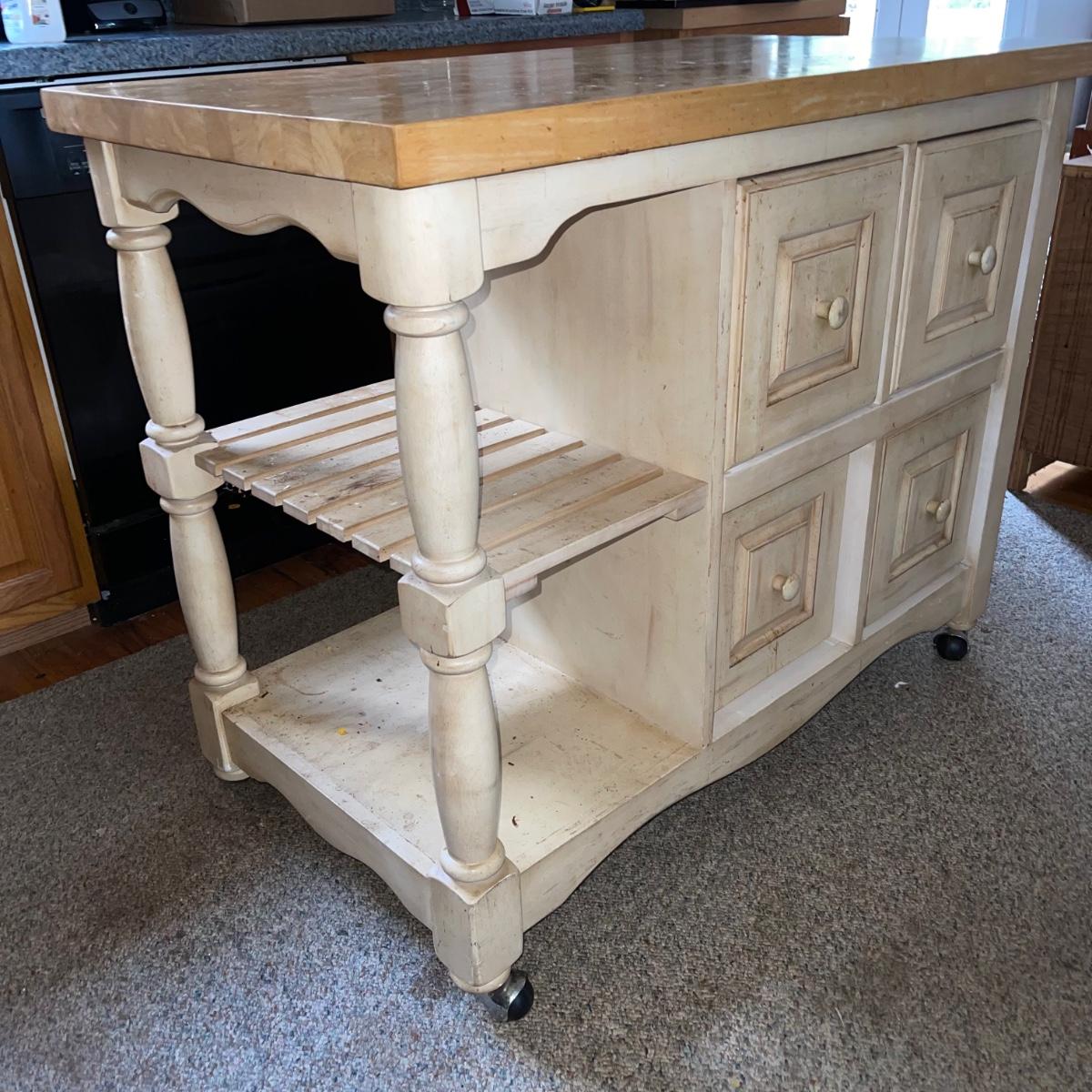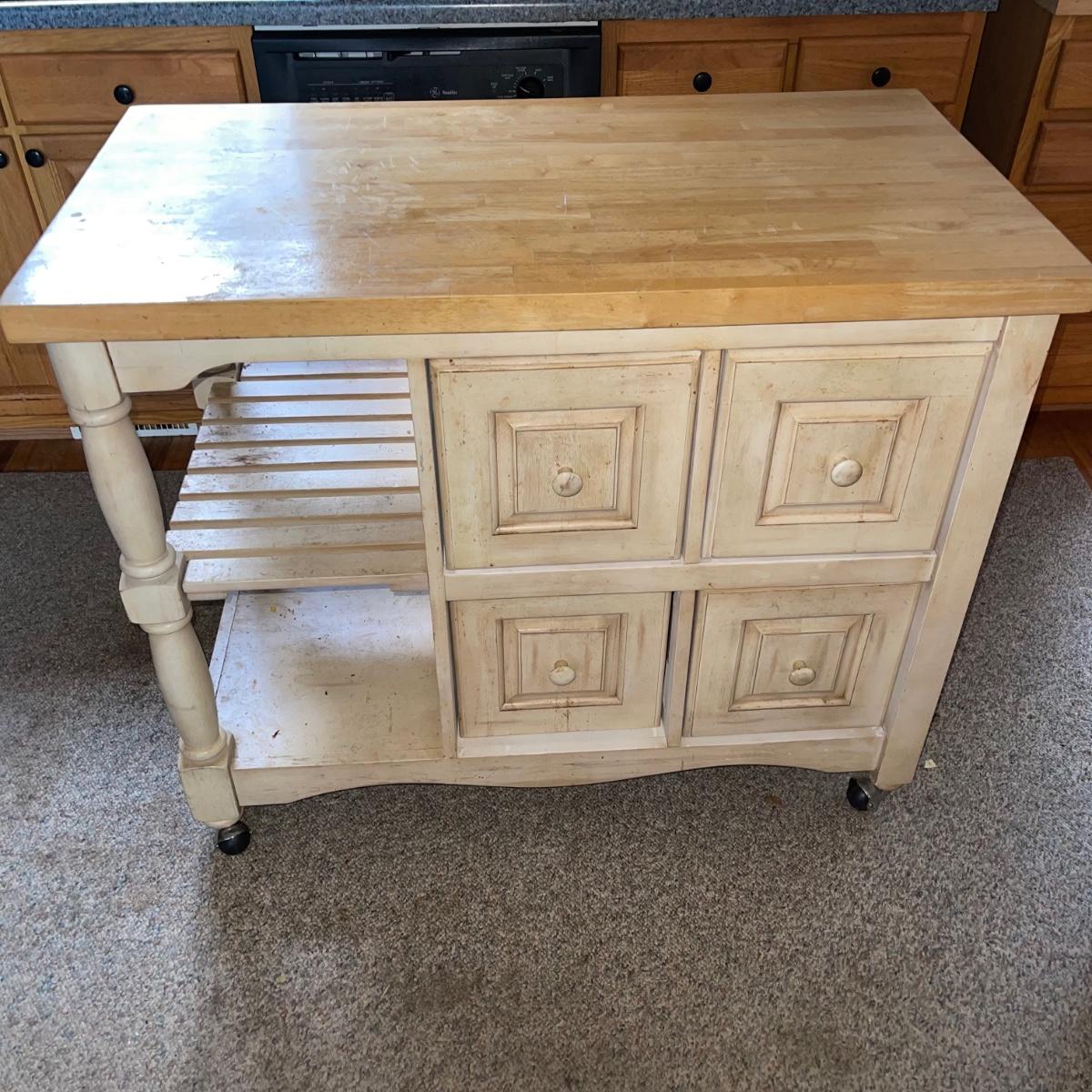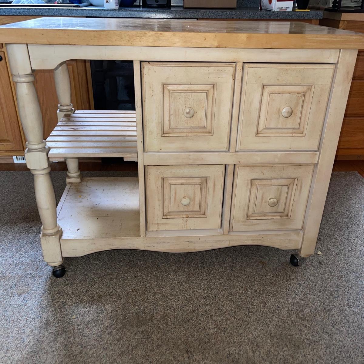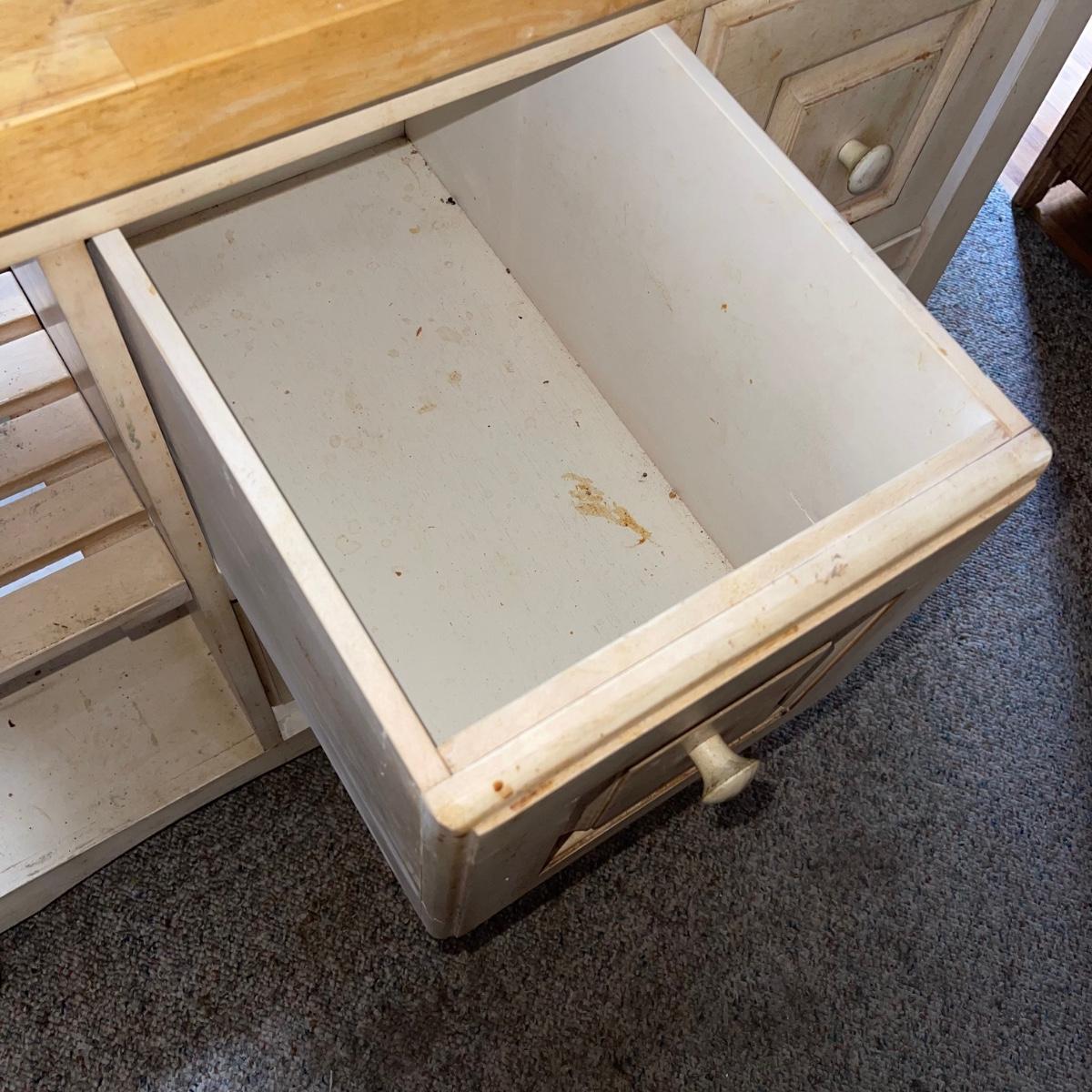 This kitchen island is 44 inches long, 24 inches wide, and 35.5 inches tall. It has a glossy butcher block style top, two shelves on one end, and four large drawers. The body of the island is a very light tan color. There are handles on either side of each drawer so they can be accessed from either side of the island. The drawer sides are 11 inches tall, the interior of the drawers are 11 inches x 20 inches. A lot of deep storage space. It is also on wheels so it’s easy to move around. As you can see from photos. One wheel is broken. Local pickup only.