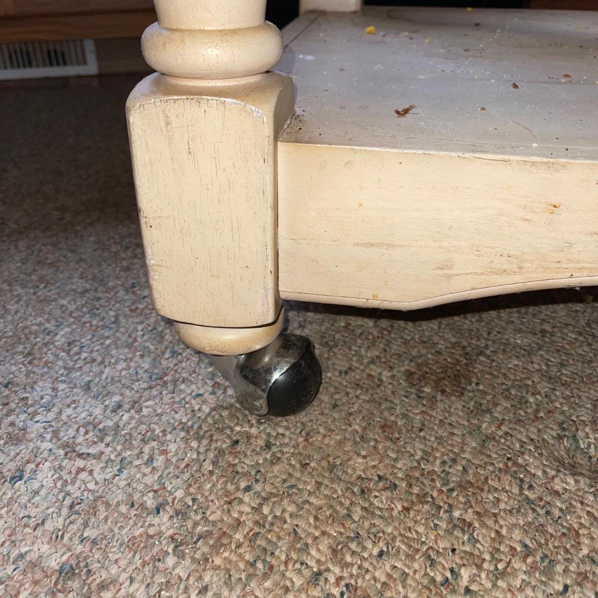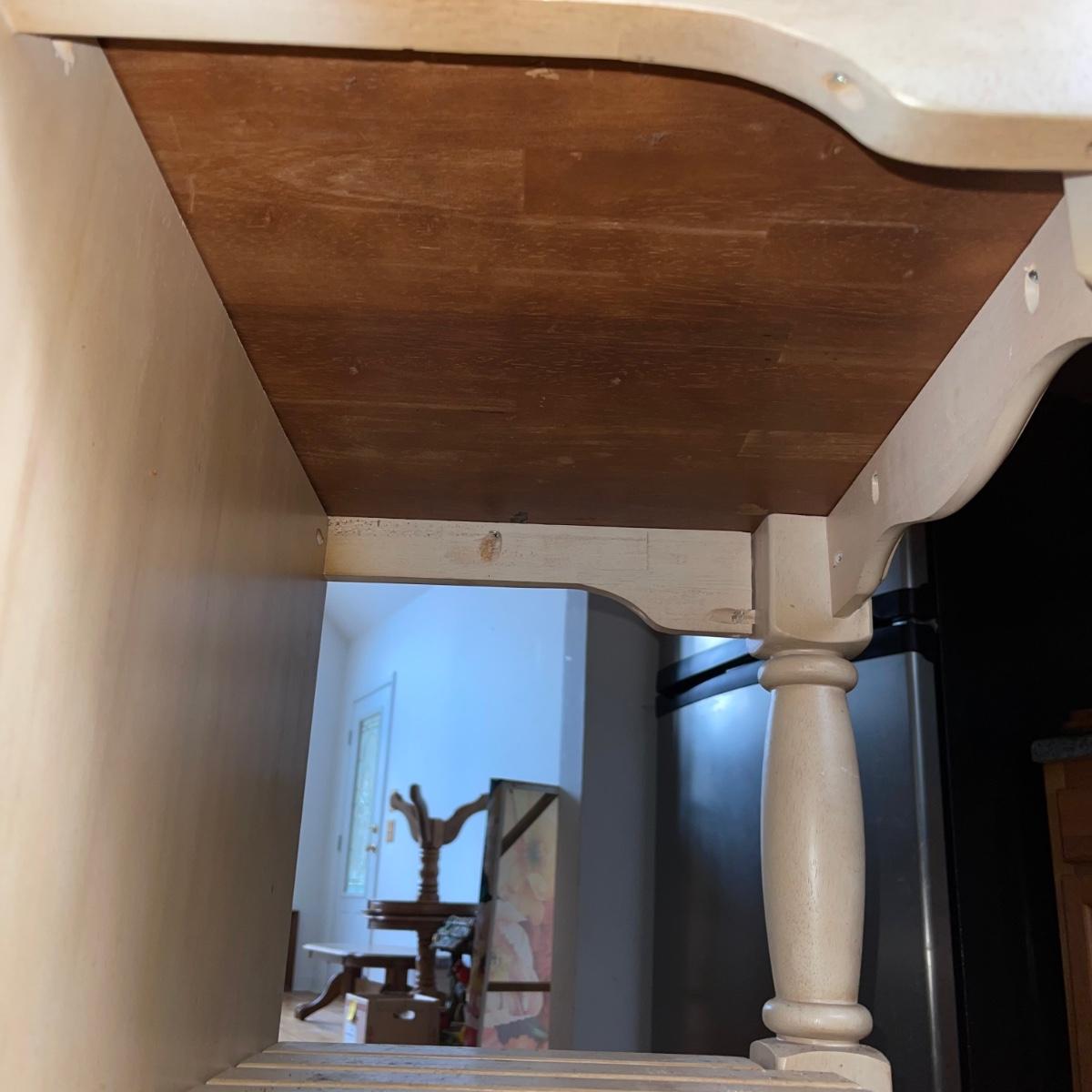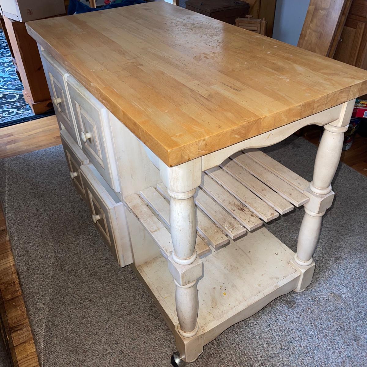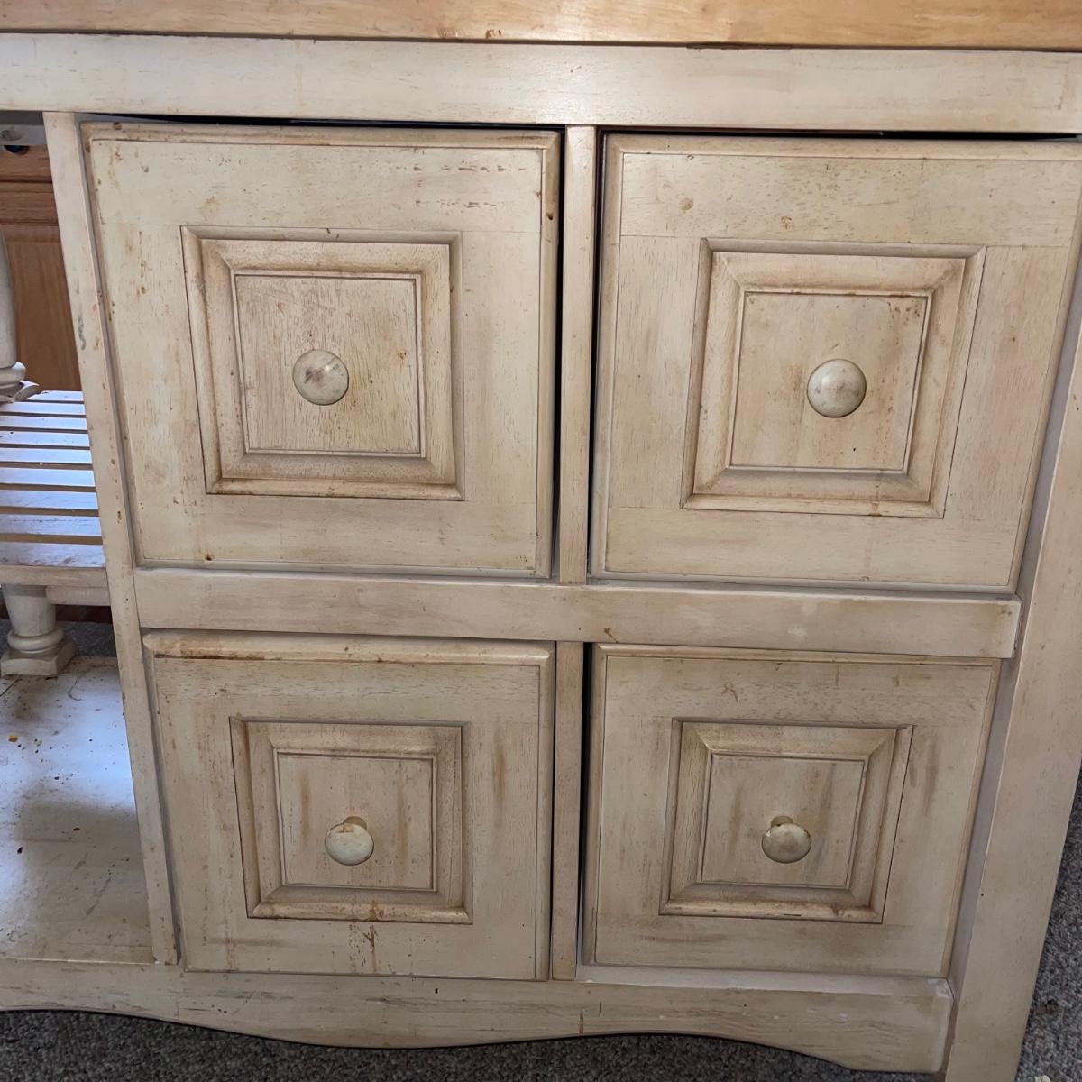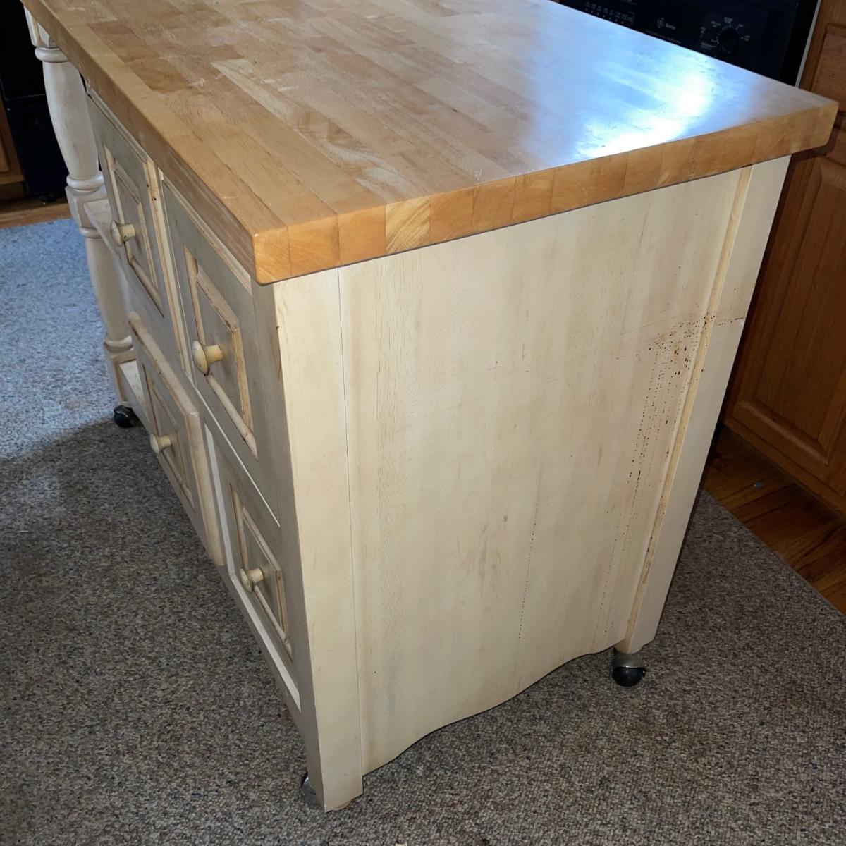 This kitchen island is 44 inches long, 24 inches wide, and 35.5 inches tall. It has a glossy butcher block style top, two shelves on one end, and four large drawers. The body of the island is a very light tan color. There are handles on either side of each drawer so they can be accessed from either side of the island. The drawer sides are 11 inches tall, the interior of the drawers are 11 inches x 20 inches. A lot of deep storage space. It is also on wheels so it’s easy to move around. As you can see from photos. One wheel is broken. Local pickup only.