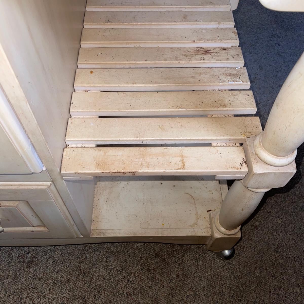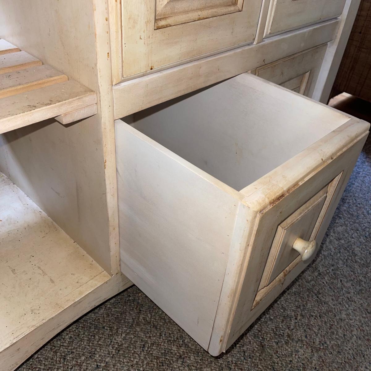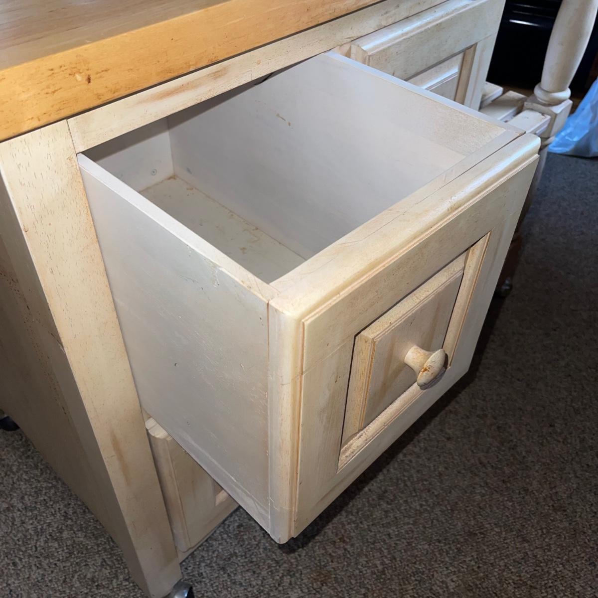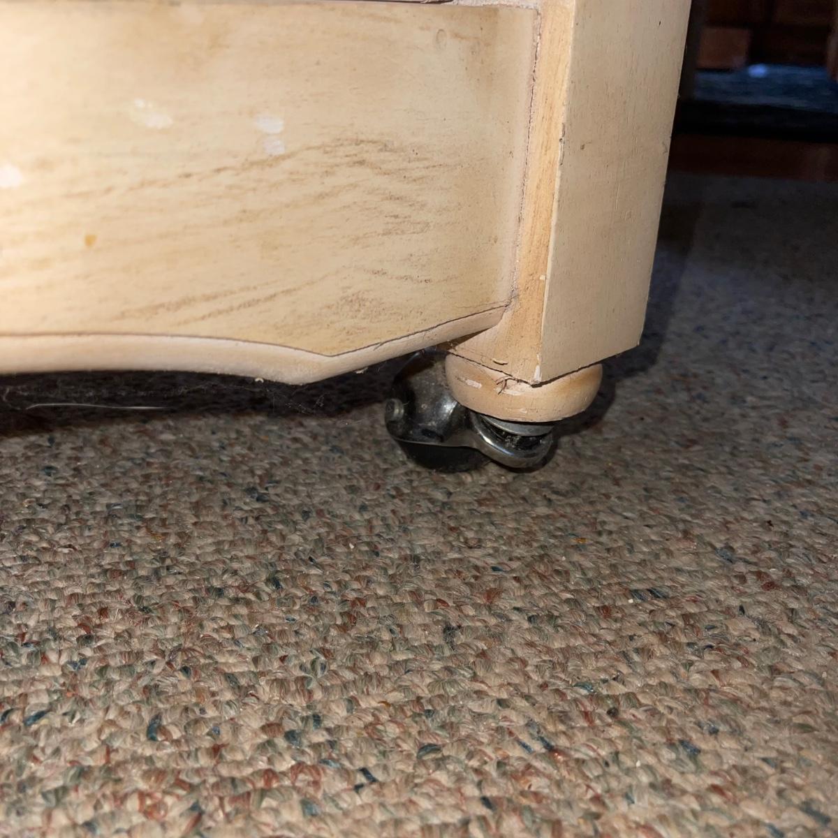 This kitchen island is 44 inches long, 24 inches wide, and 35.5 inches tall. It has a glossy butcher block style top, two shelves on one end, and four large drawers. The body of the island is a very light tan color. There are handles on either side of each drawer so they can be accessed from either side of the island. The drawer sides are 11 inches tall, the interior of the drawers are 11 inches x 20 inches. A lot of deep storage space. It is also on wheels so it’s easy to move around. As you can see from photos. One wheel is broken. Local pickup only.