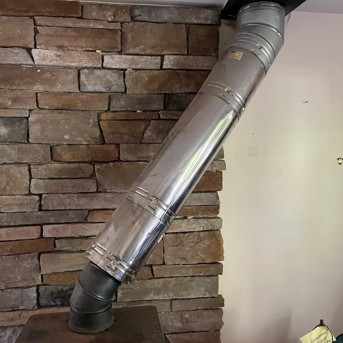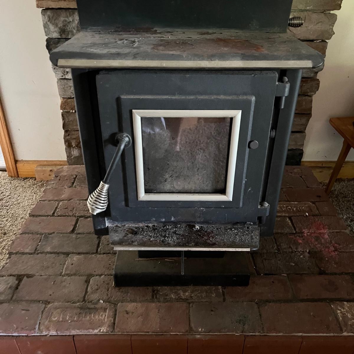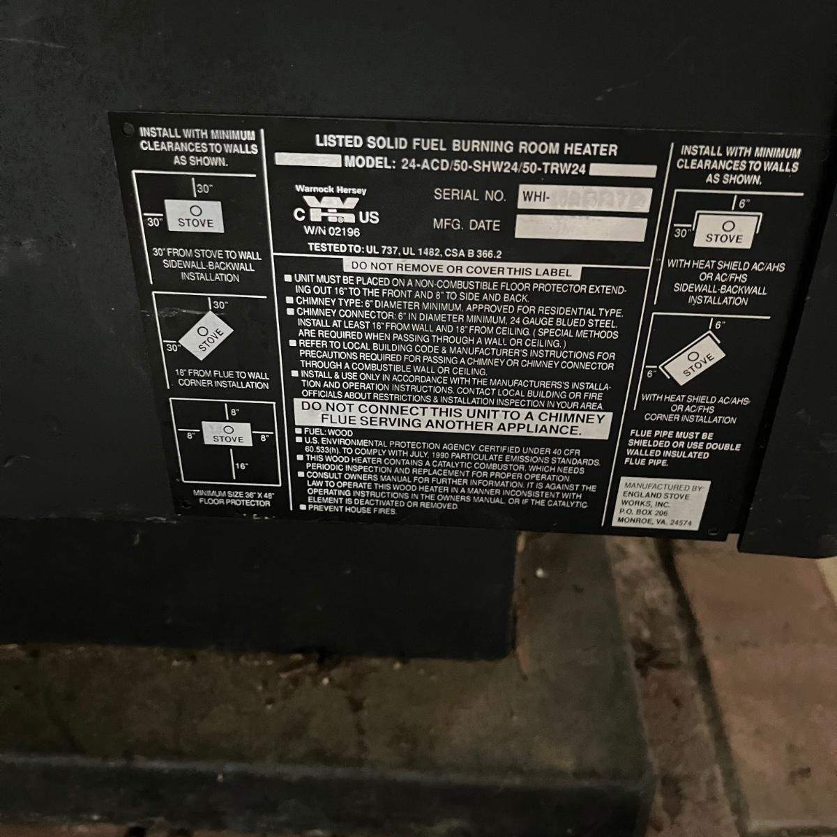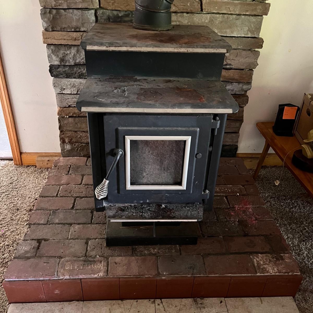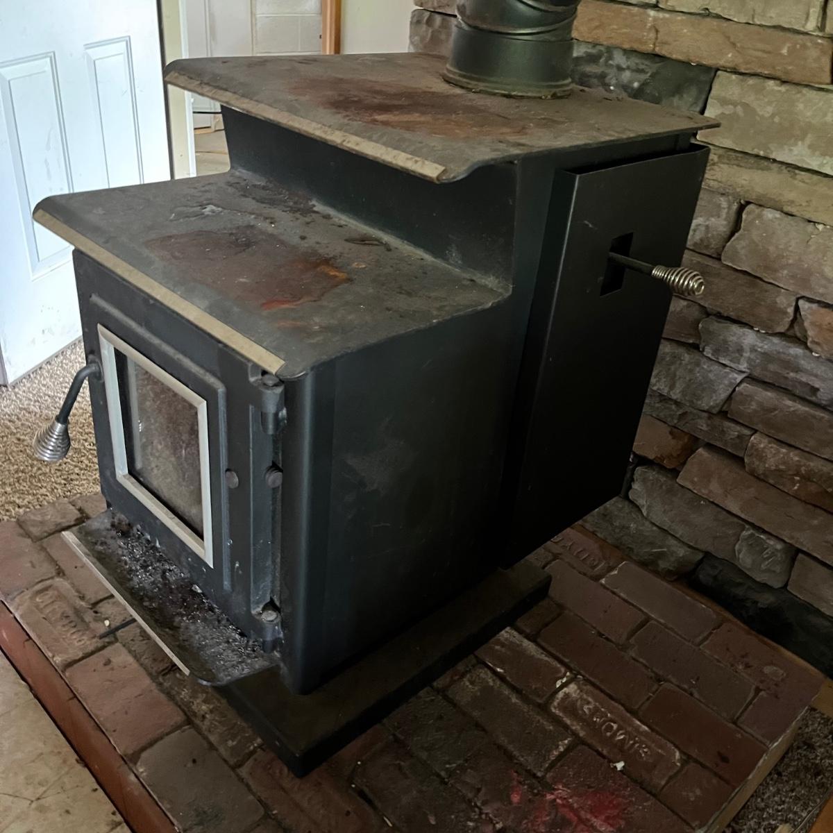 Lot includes a solid fuel burning room heater manufactured by England Stove Works. Also includes the pipe.
