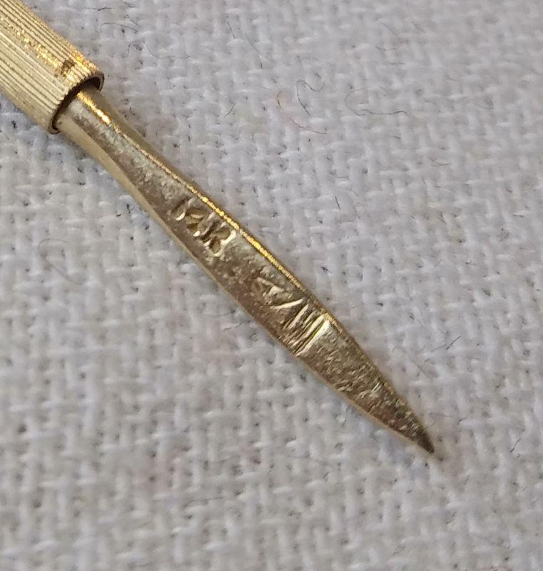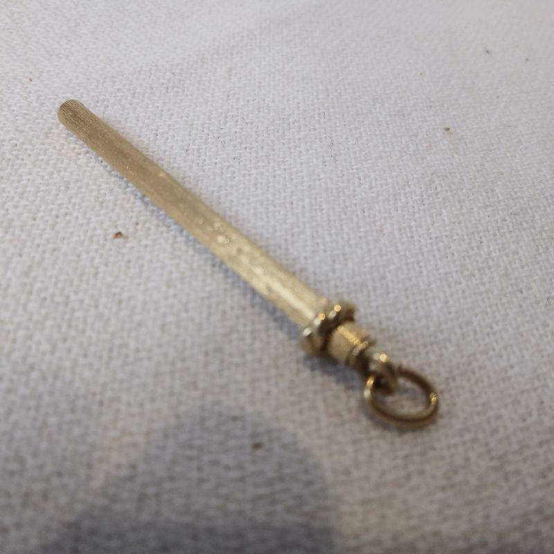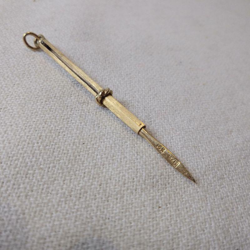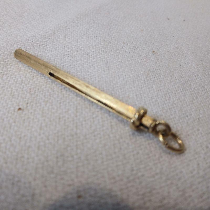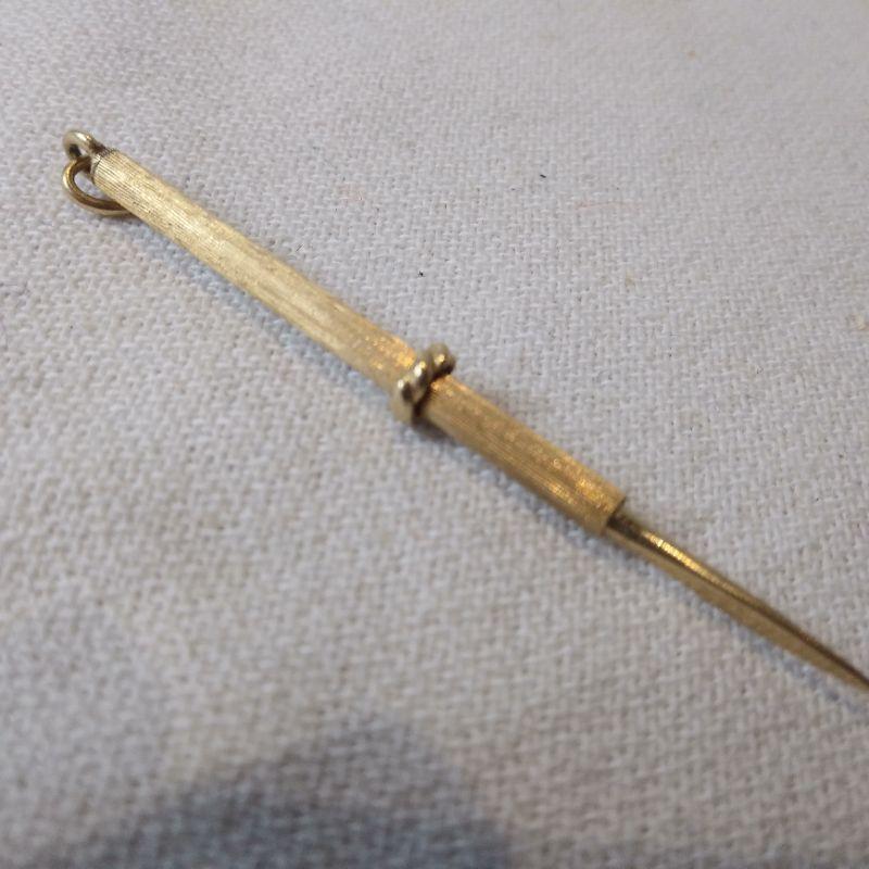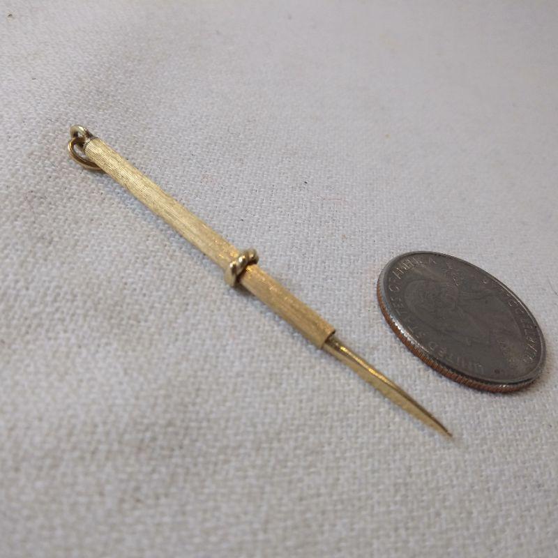 For that special someone who has everything! A solid gold 14K retractable toothpick. It has a loop on the end to attach to a necklace or key chain. Weights at .077 ozt. It measures 1 3/4-inches long closed - 2 1/2-inches extended. Where will you find another? Starting Bid/Reserve is $80.