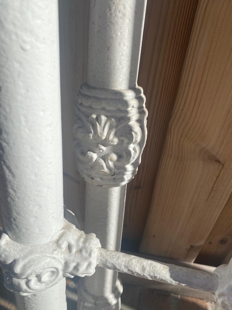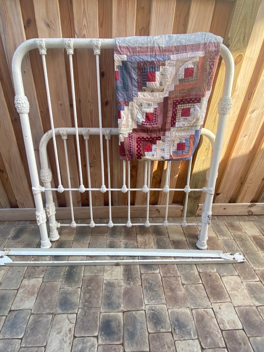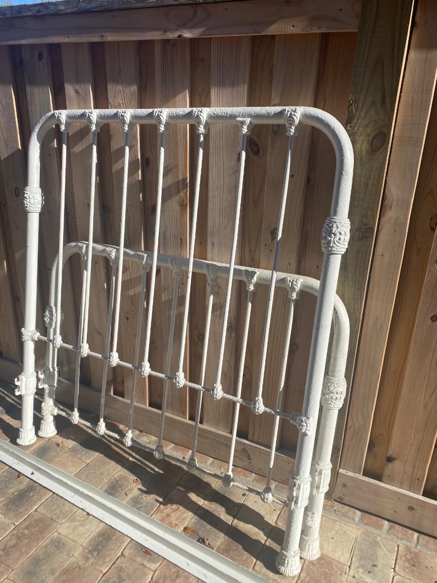 Solid Iron Bed 75 years old painted cream, full size, headboard 59.5"H 54"W foot board 38"H