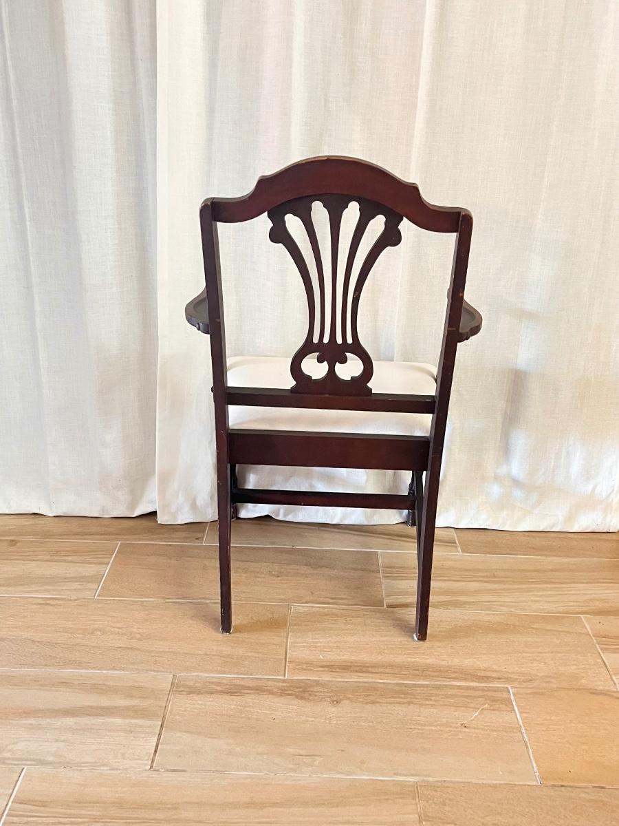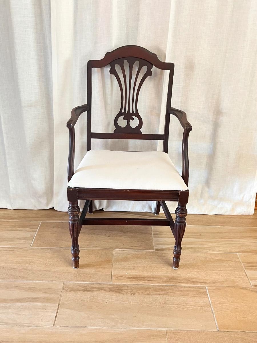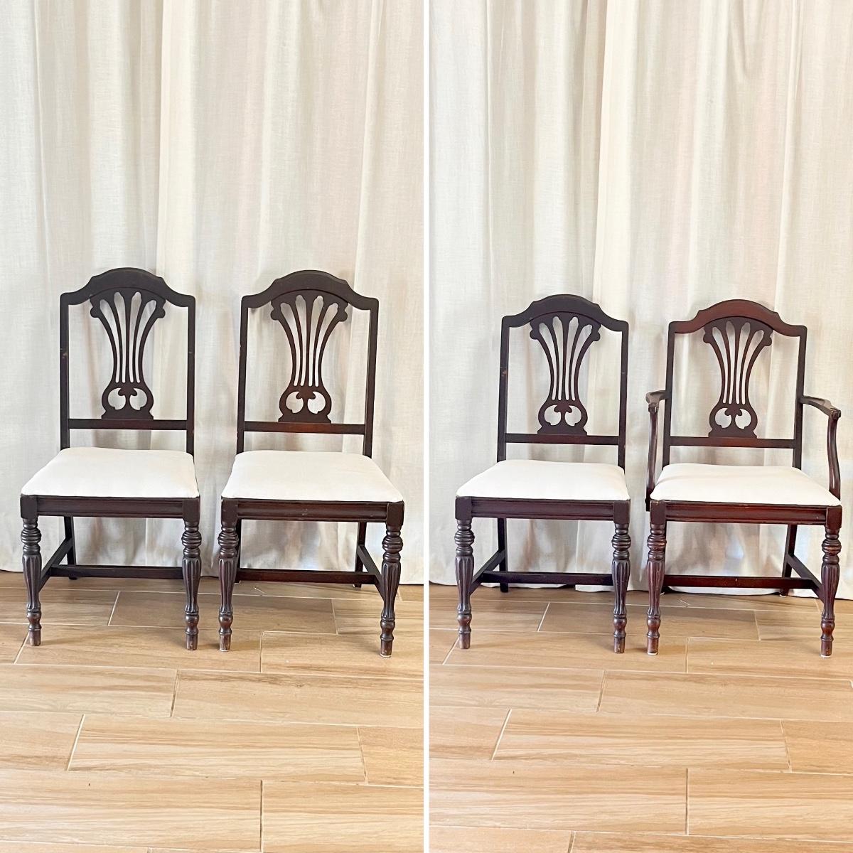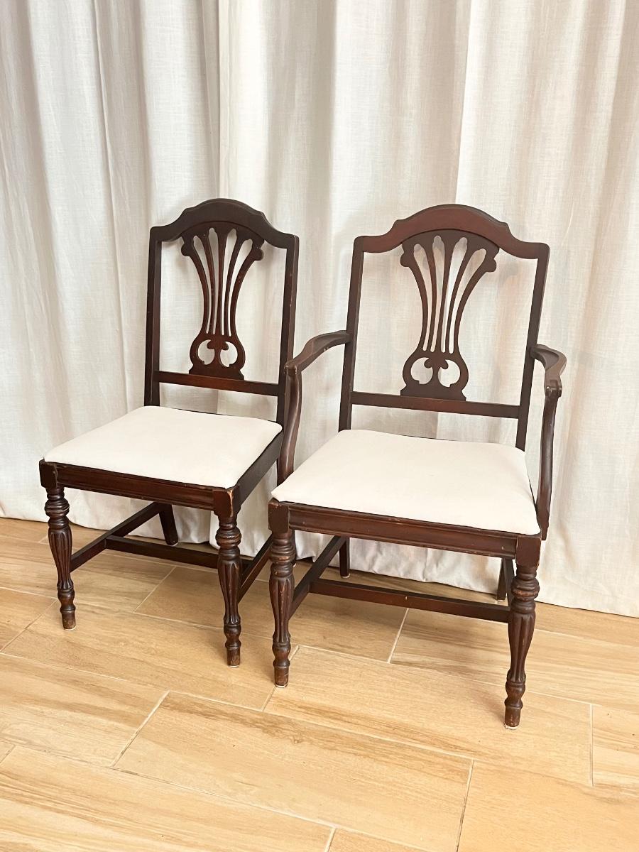 Includes = (3) Regular Chairs 38” H x 19” W x 19” D ~ (1) Armchair 38” H x 22” W x 19” D ~ No brand name ~ These chairs are project pieces & have minor scratches & wear they will need a little TLC as seen in photos.