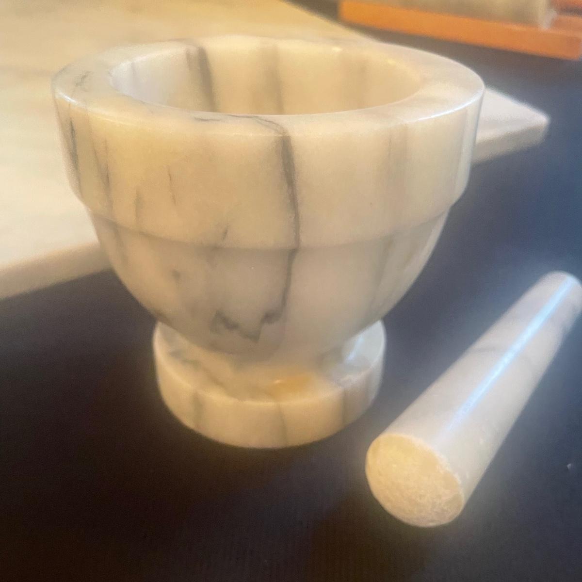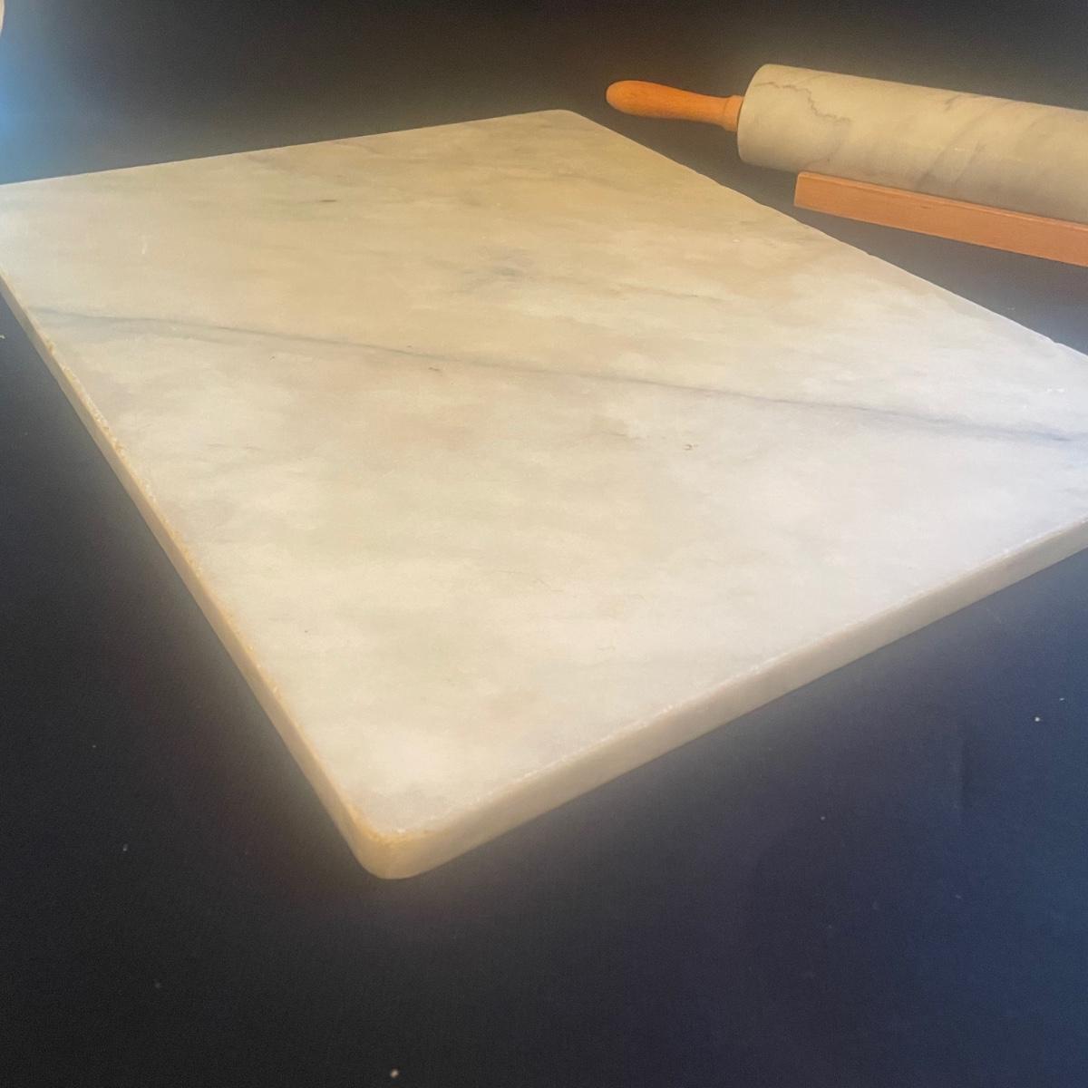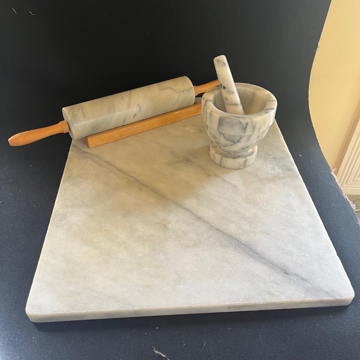 All these solid marble items are in good condition; chopping board and mortar show minor wear and tear, see images. It appears to be a matched set but only the wooden base for the rolling pin has manufacturers mark that reads Cooks Club.