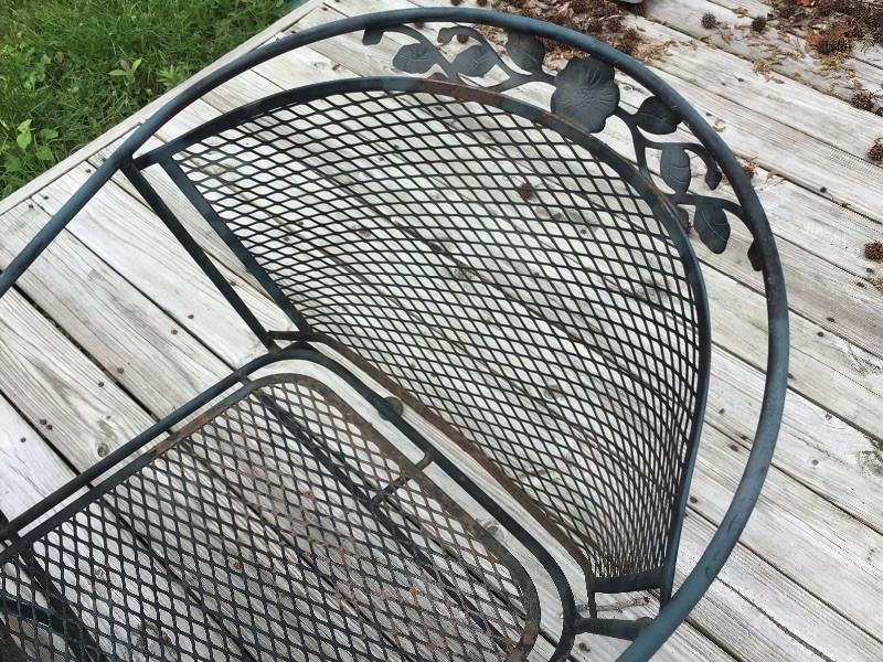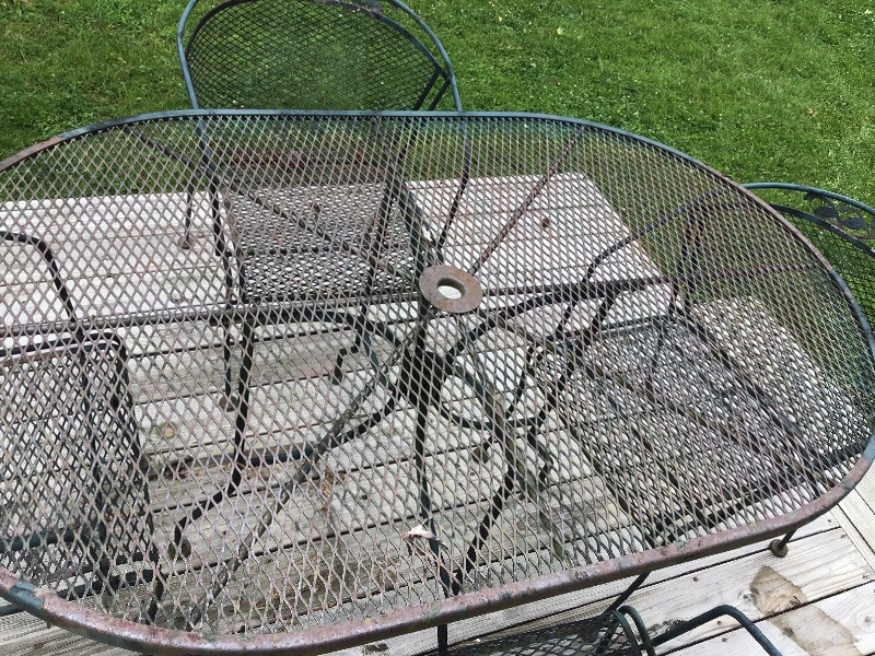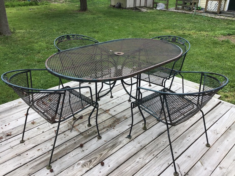 OUTDOOR GREEN ROD IRON TABLE WITH FOUR CHAIRS.