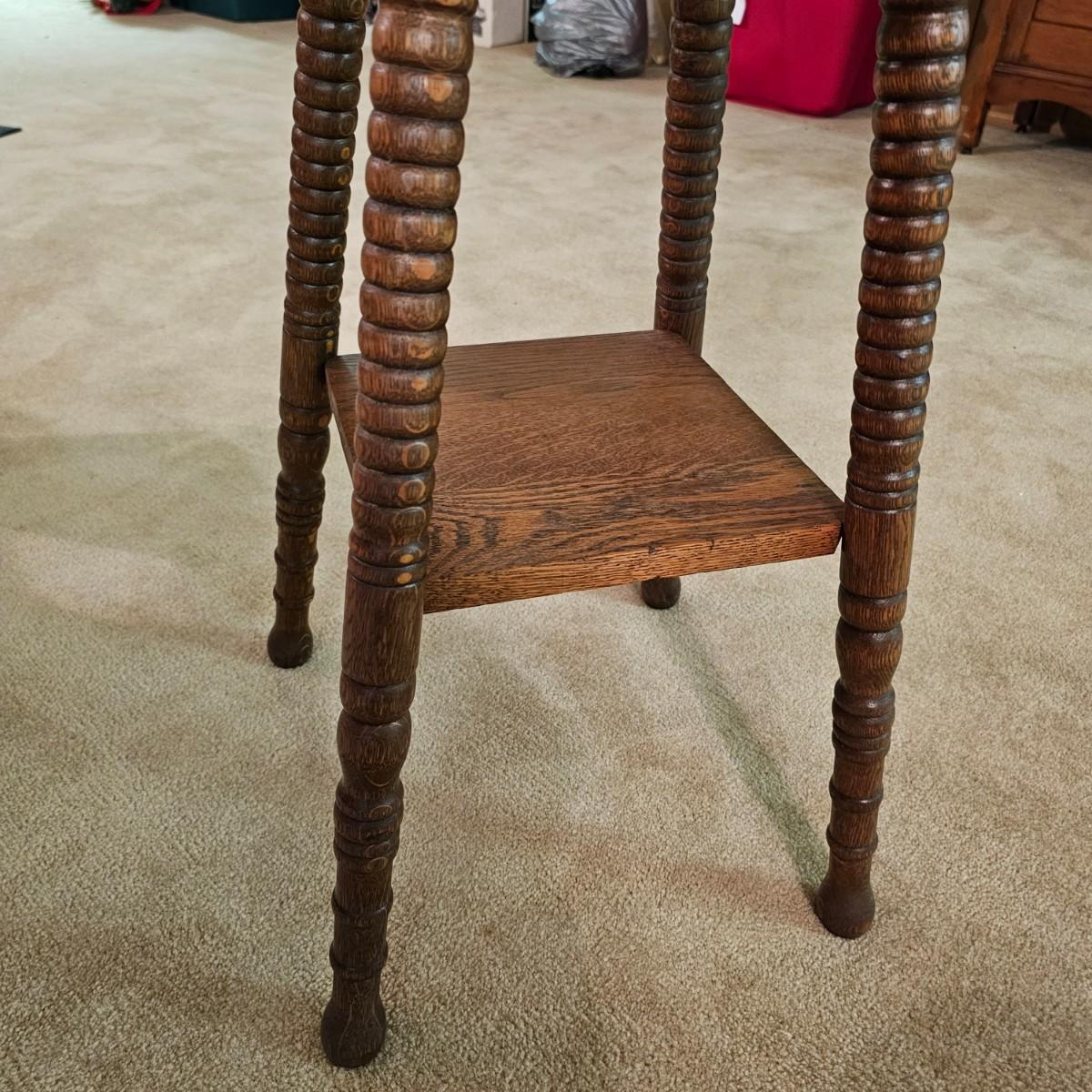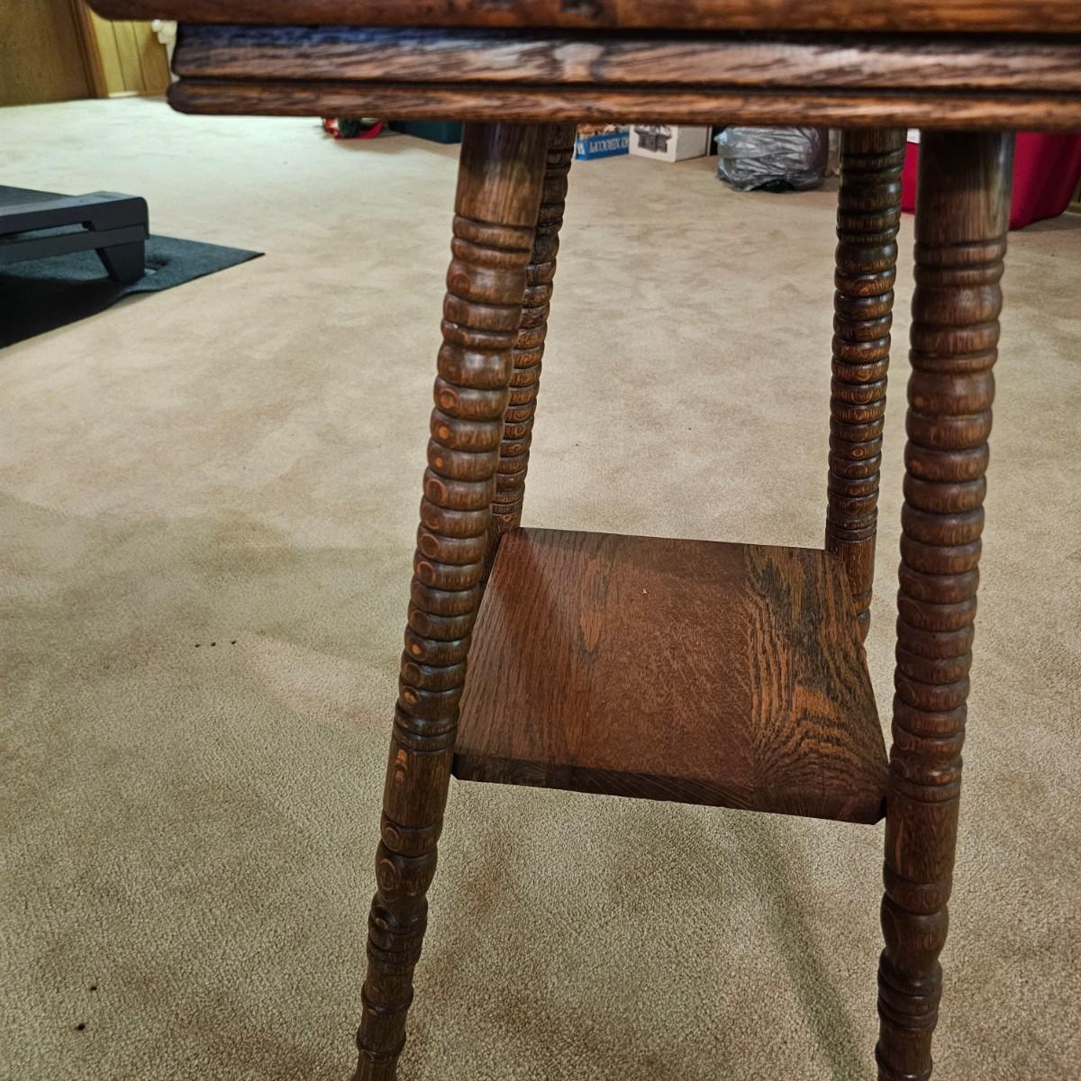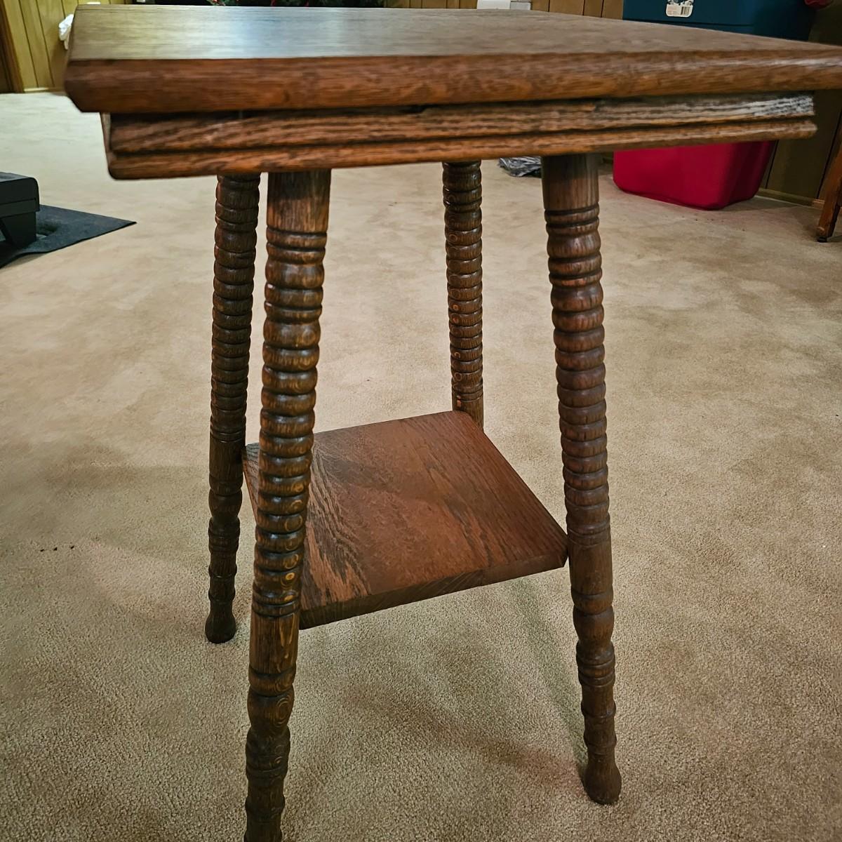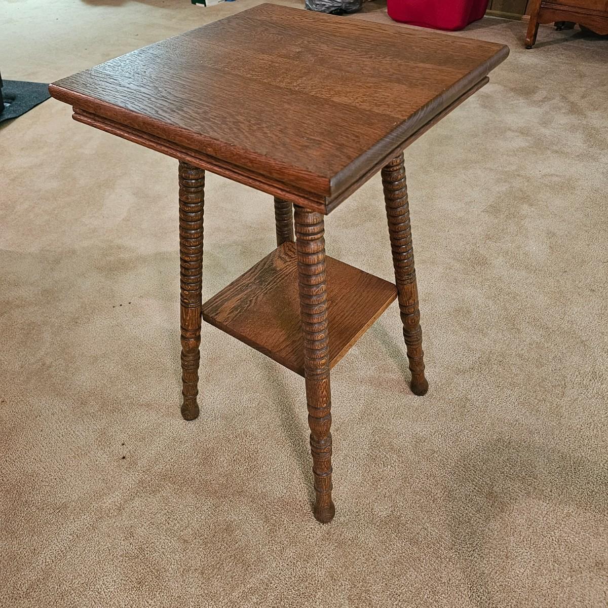 A compact square solid oak table with four spindle style legs. Table has some detail around top, small shelf underneath. Piece measures 16" x 16" x 28"H. Under shelf is 12" off ground. See photos for details. Local pickup only.