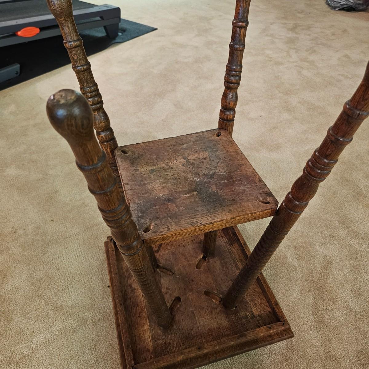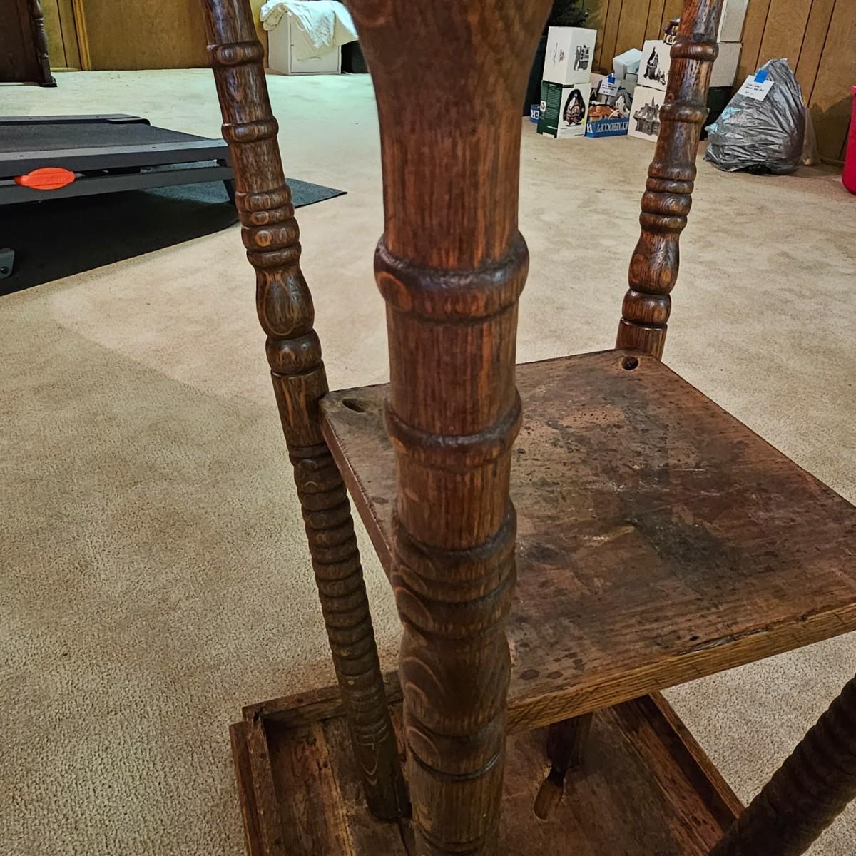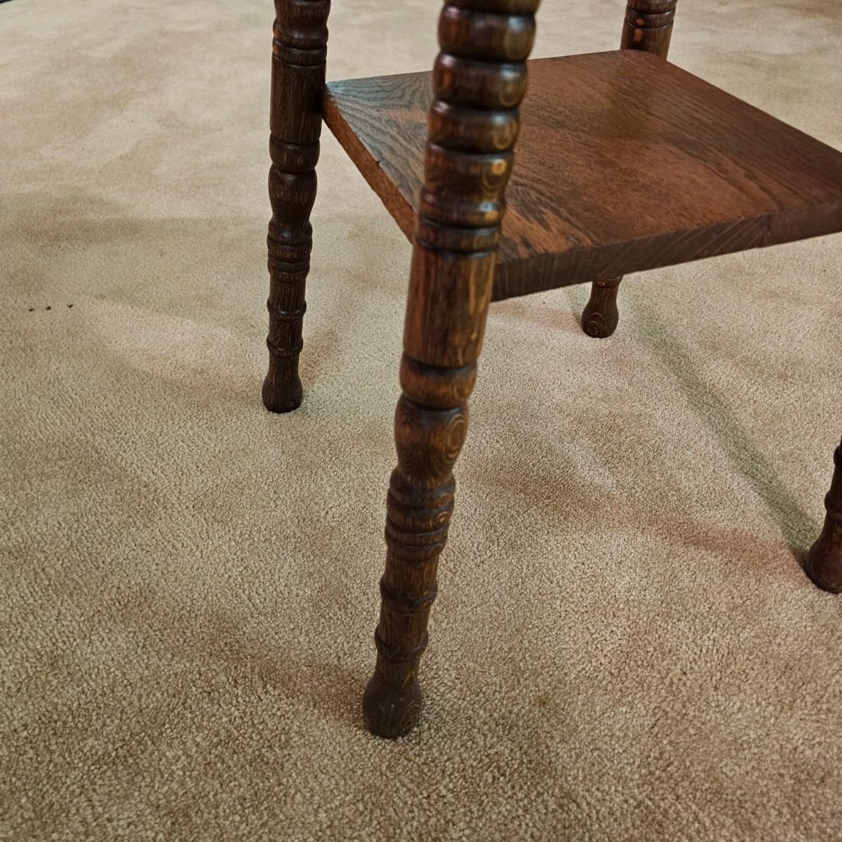 A compact square solid oak table with four spindle style legs. Table has some detail around top, small shelf underneath. Piece measures 16" x 16" x 28"H. Under shelf is 12" off ground. See photos for details. Local pickup only.