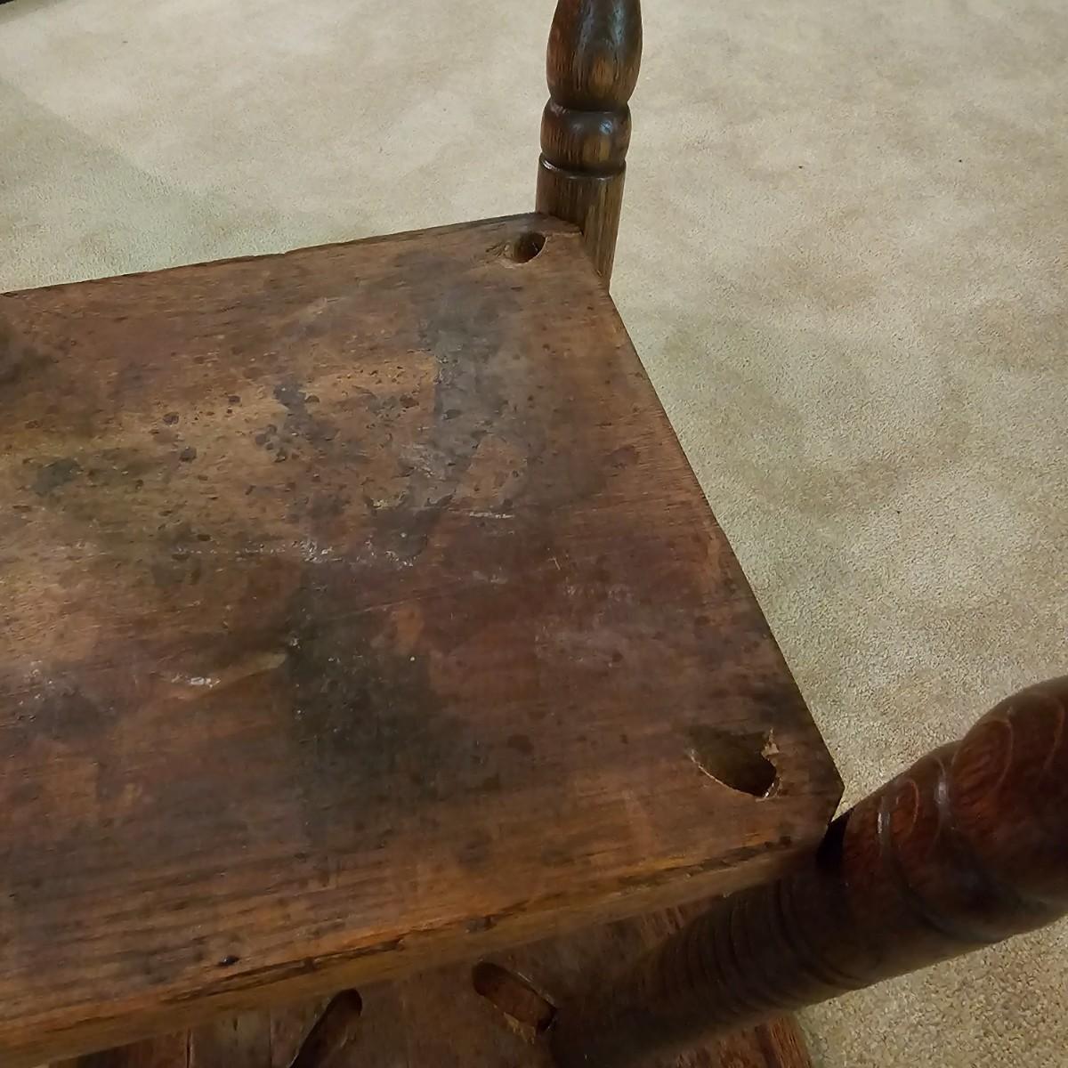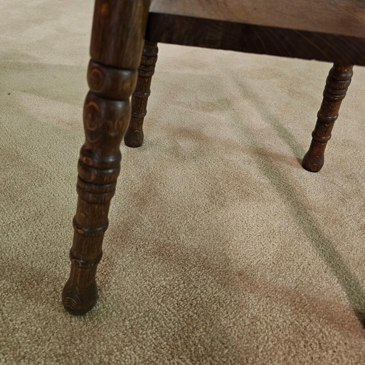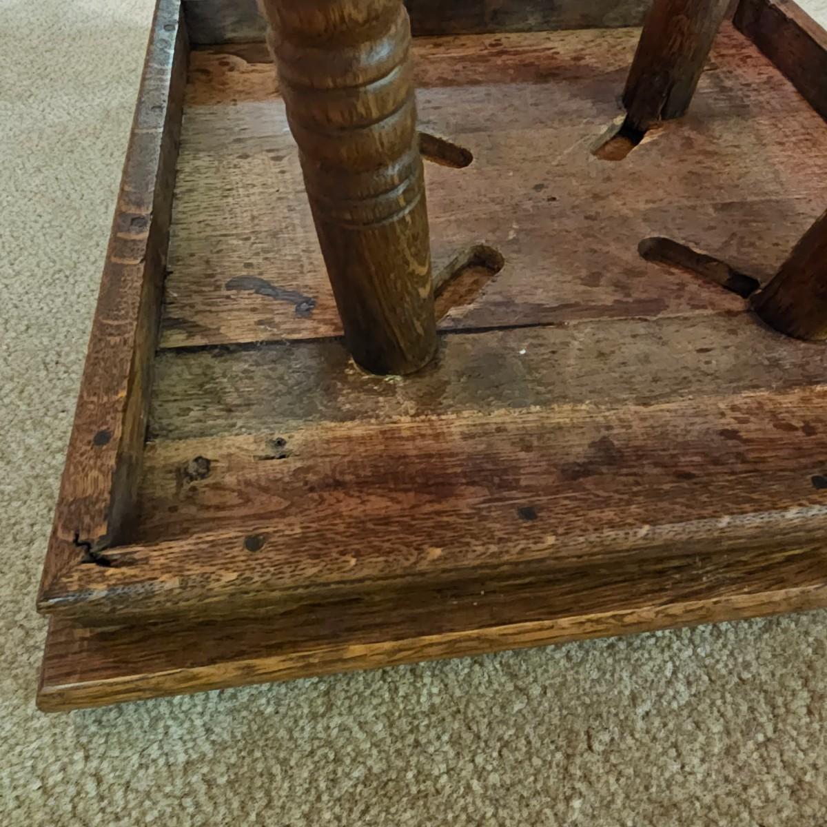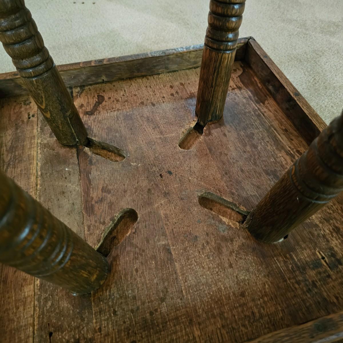 A compact square solid oak table with four spindle style legs. Table has some detail around top, small shelf underneath. Piece measures 16" x 16" x 28"H. Under shelf is 12" off ground. See photos for details. Local pickup only.