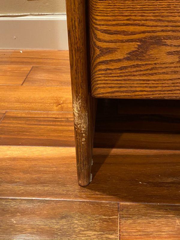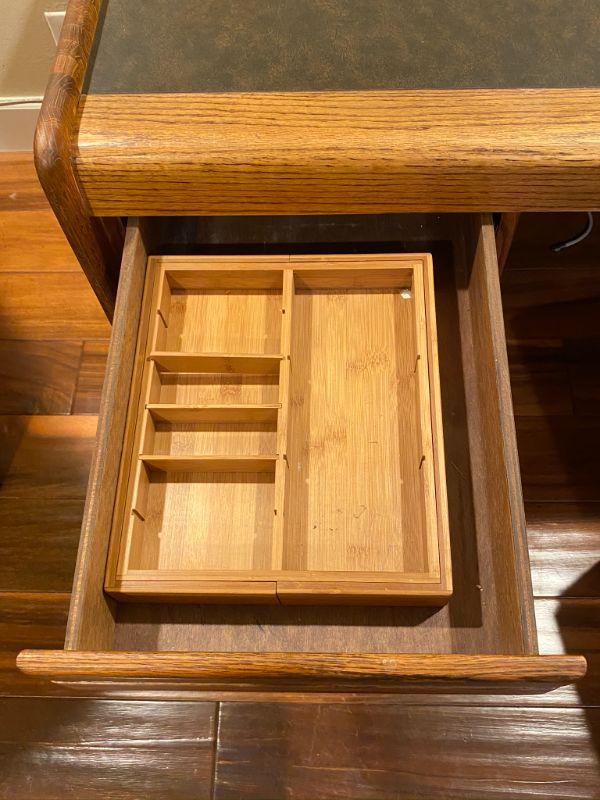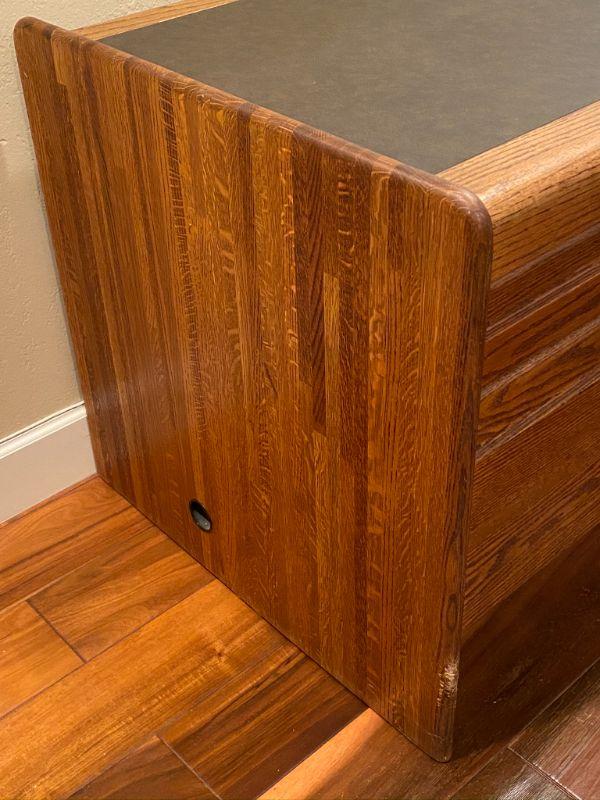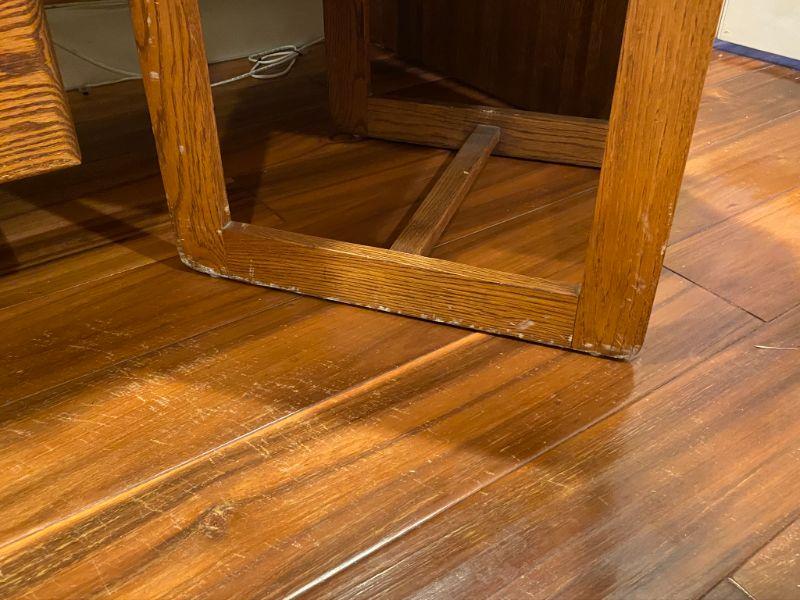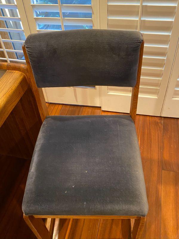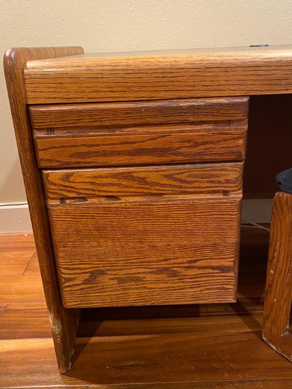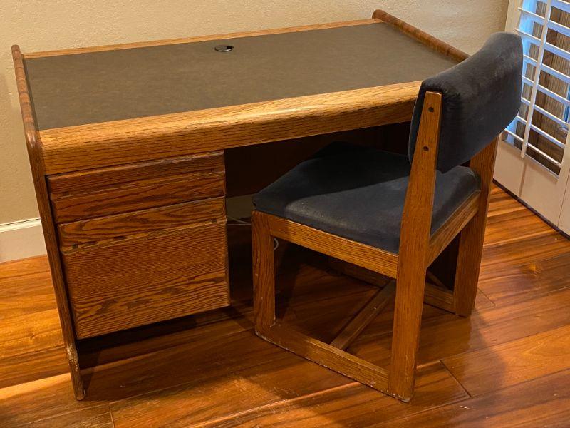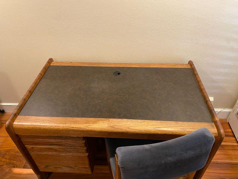 Solid oak desk & matching chair. Desk has 2 drawers on the left side and a built in writing surface pad. Chair has padded seat and back in a blue velour fabric. There is some scratches to the bottom left edge of desk and along the bottom of the chair.