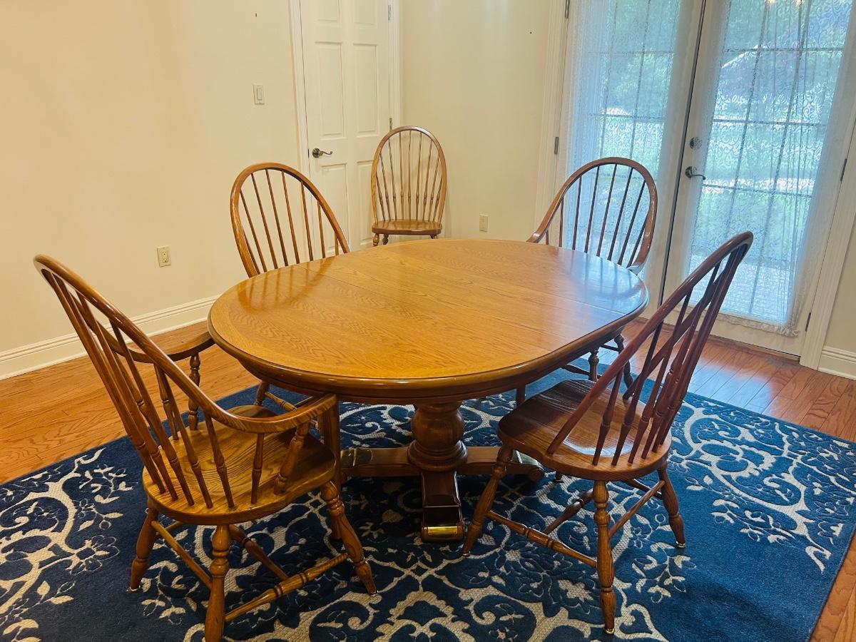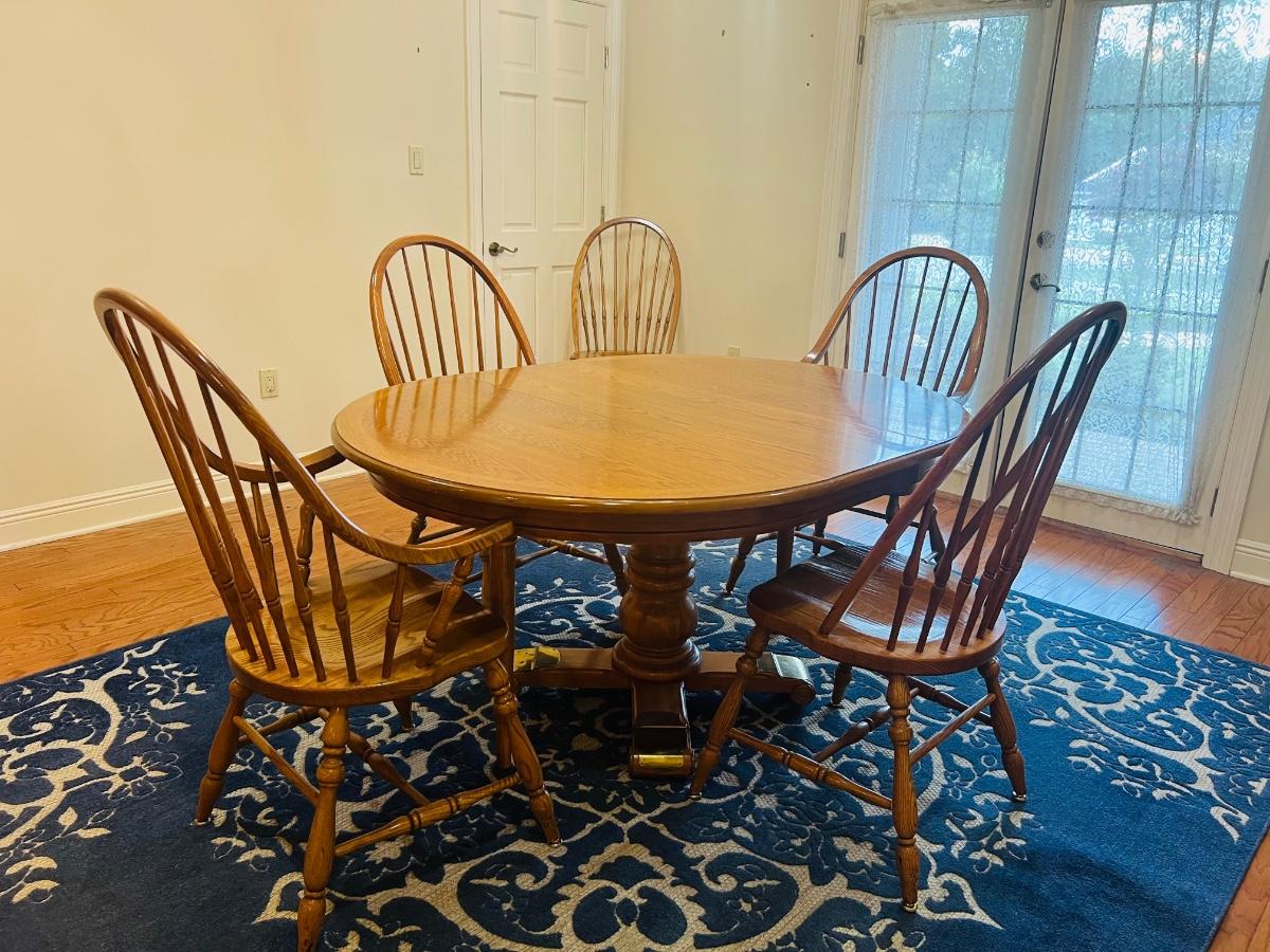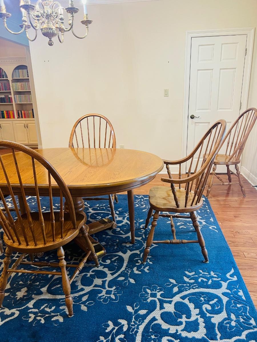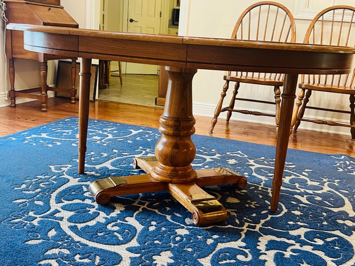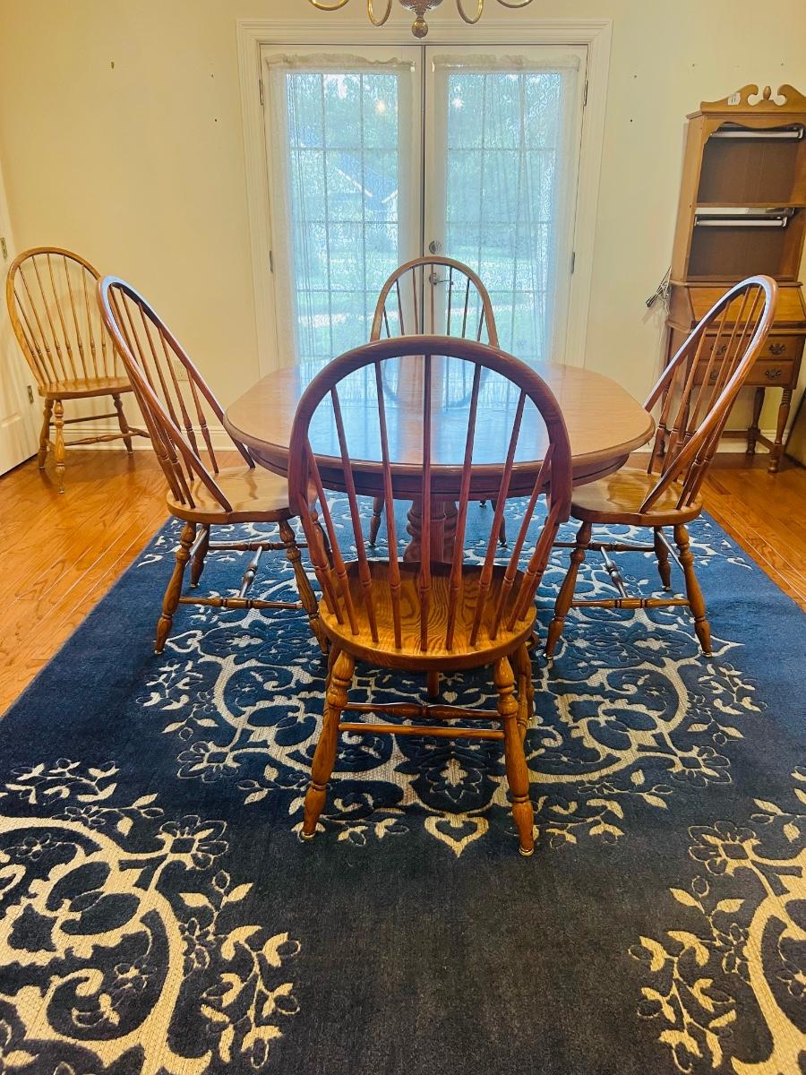 Table is HEAVY! You will need to bring muscle to move this. This can be round, oval or oblong! Table comes with five chairs. Two captains chairs and three regular chairs. As pictured measures 62 inches long, 46 inches wide and 30 inches tall. Measure 16 inches wide. One regular chair spindle has an imperfection see pictures. Rug not included.