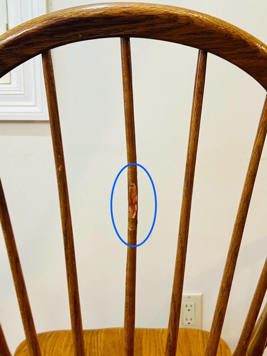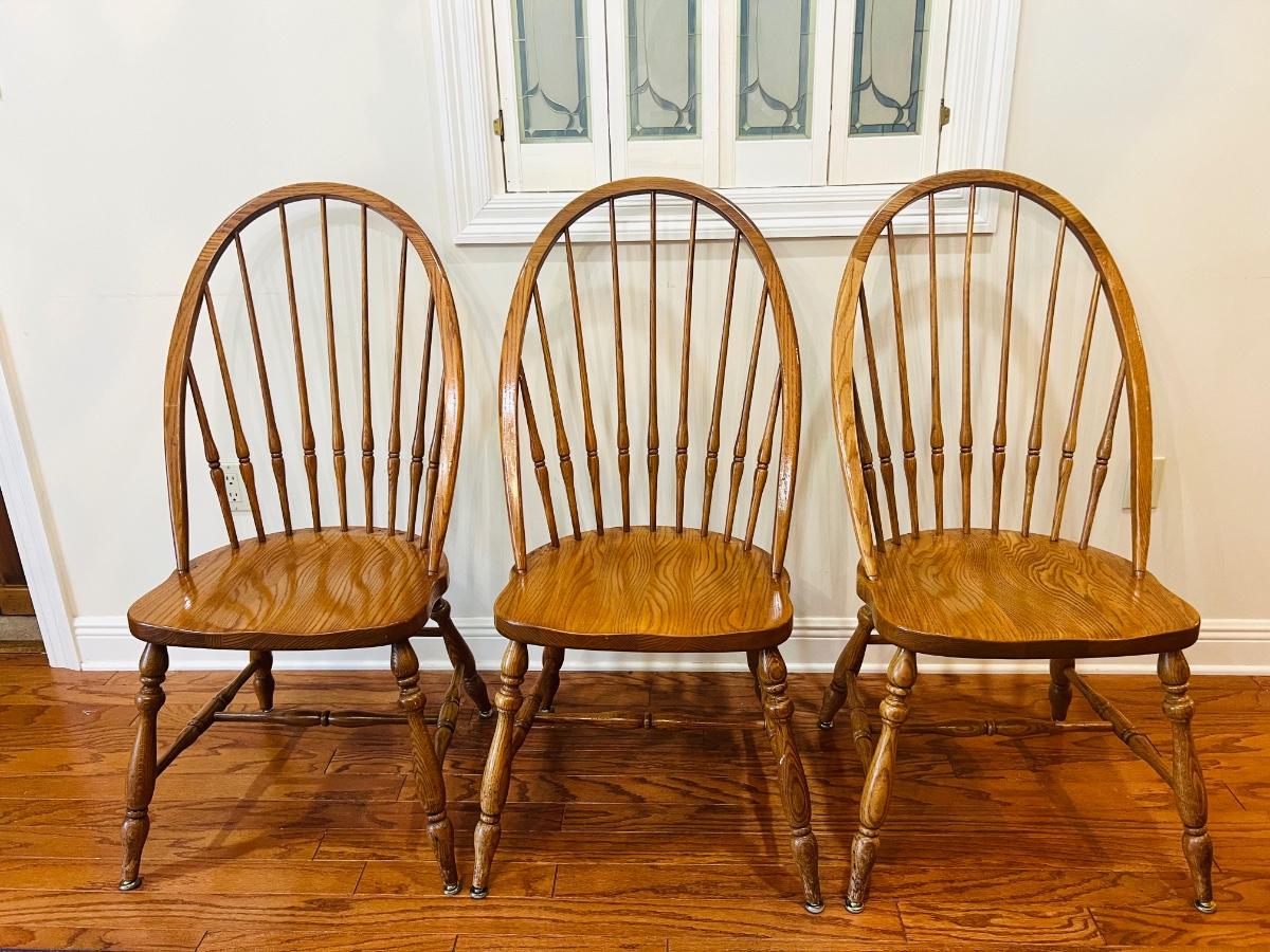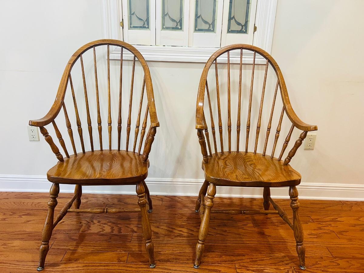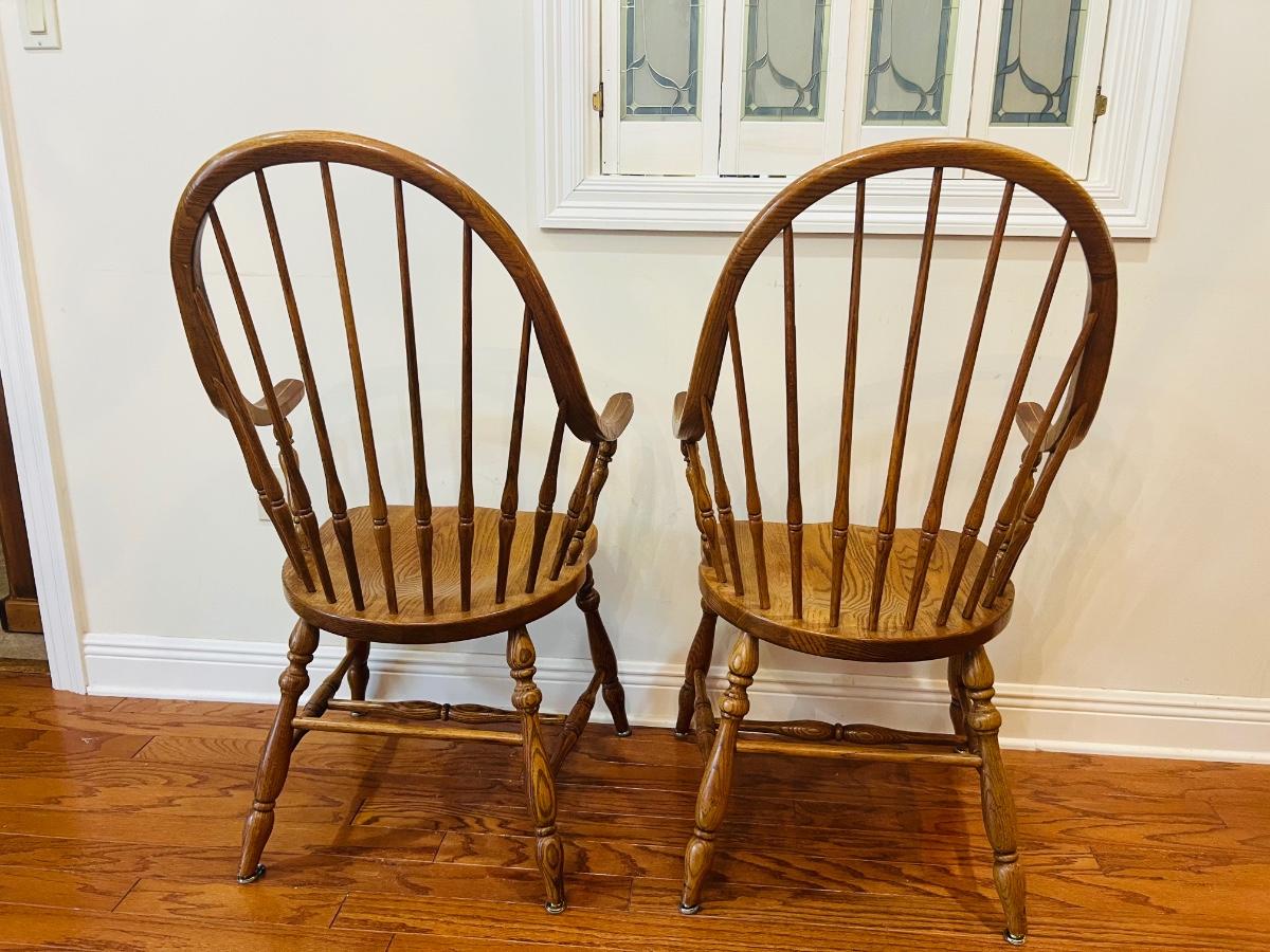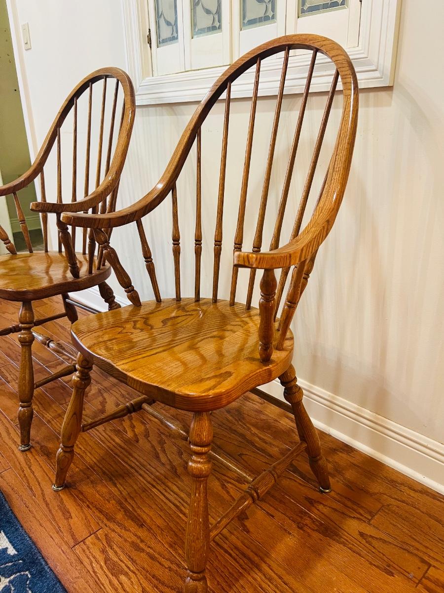 Table is HEAVY! You will need to bring muscle to move this. This can be round, oval or oblong! Table comes with five chairs. Two captains chairs and three regular chairs. As pictured measures 62 inches long, 46 inches wide and 30 inches tall. Measure 16 inches wide. One regular chair spindle has an imperfection see pictures. Rug not included.