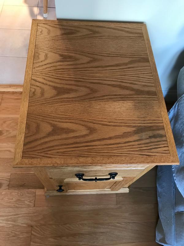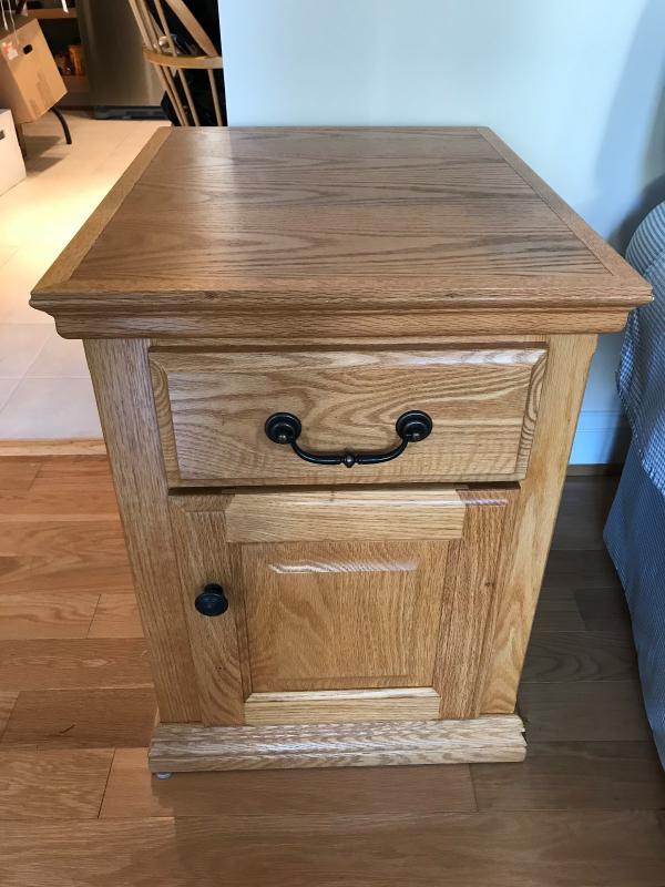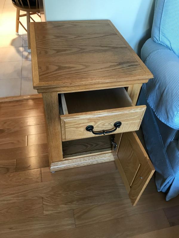 Solid golden oak end table cabinet with one drawer over one cabinet door. Finished all the way around. Oiled bronze finish handles. 19" x 24" x 25" H Very nice condition.
