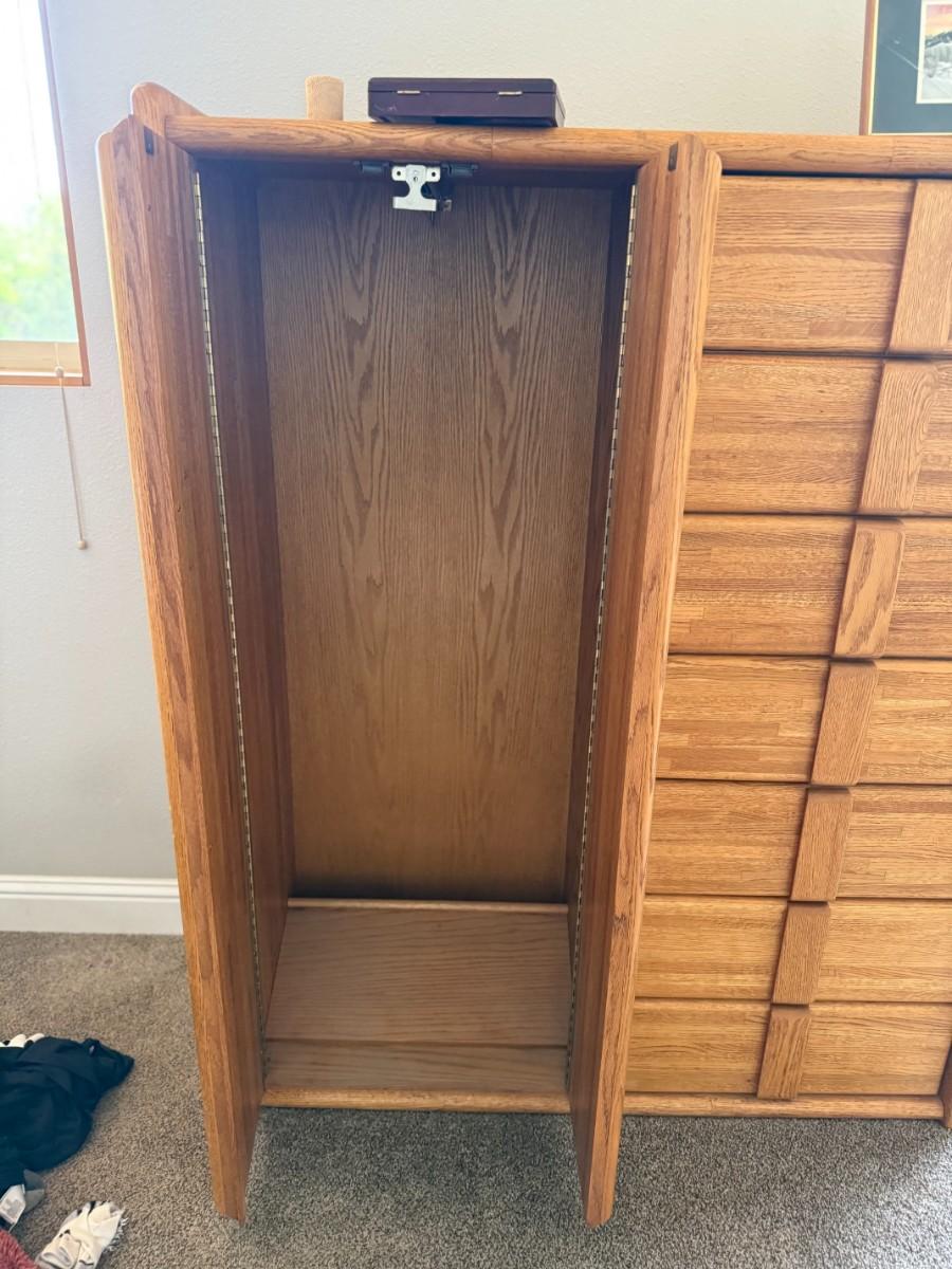 Beautiful mid-century style oak dresser with dual cabinet doors on the left and 12 drawers on the right. Well-constructed with smooth-glide drawers and elegant wood grain finish. Ideal for master bedrooms or as a statement piece in a guest room.