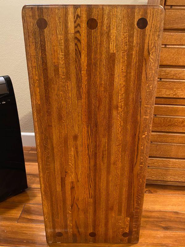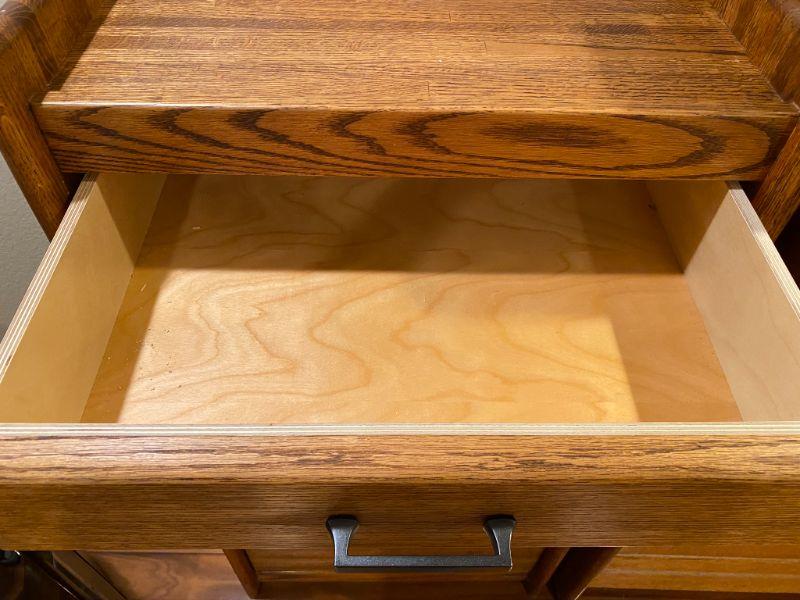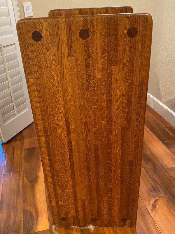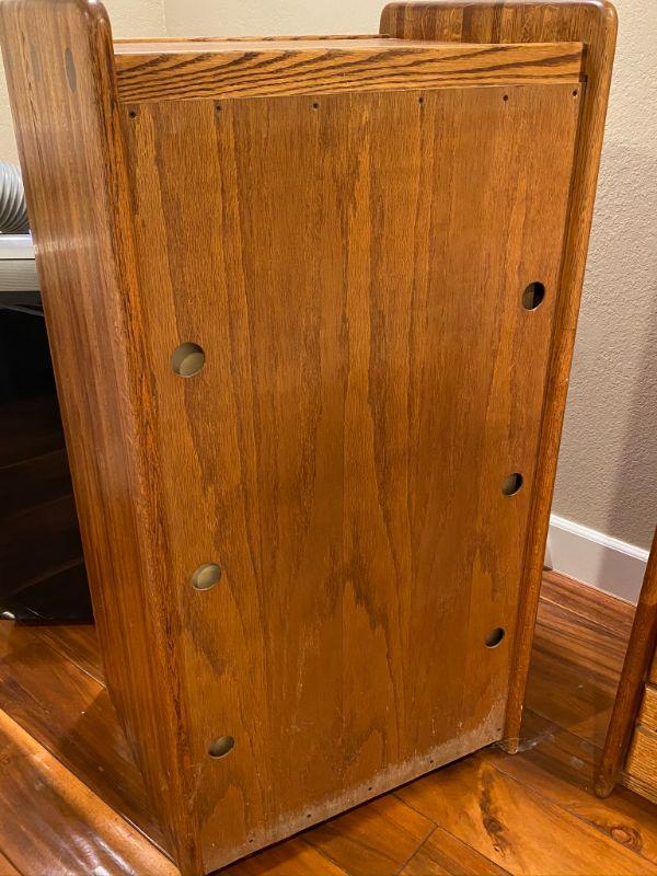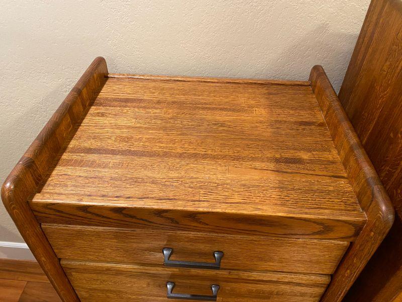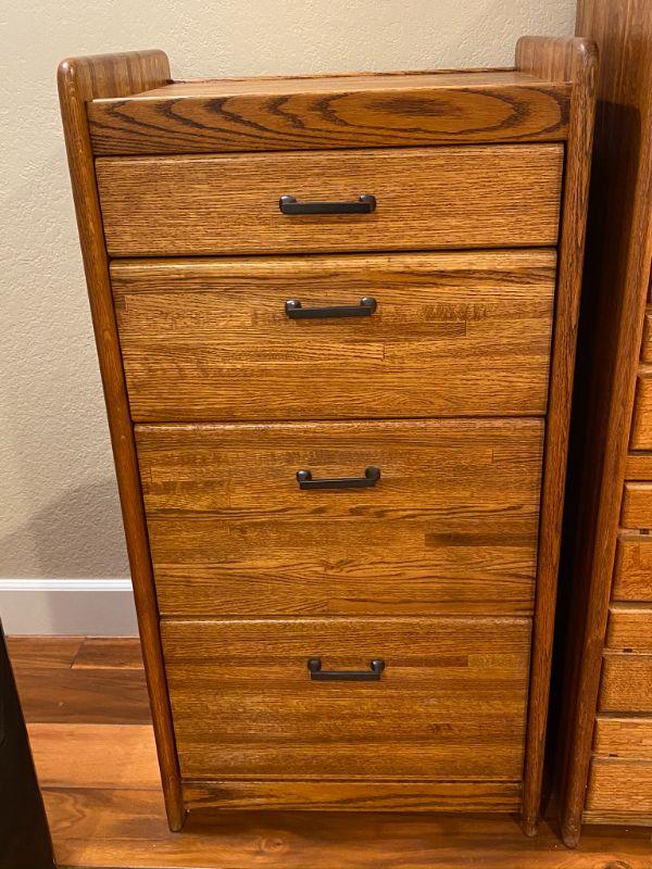 Heavy solid oak file cabinet. Top two drawers for storage the bottom two drawers can hold legal size files, has built in rails. Sturdy, well maintained. Drawers open smoothly. About 4' tall.