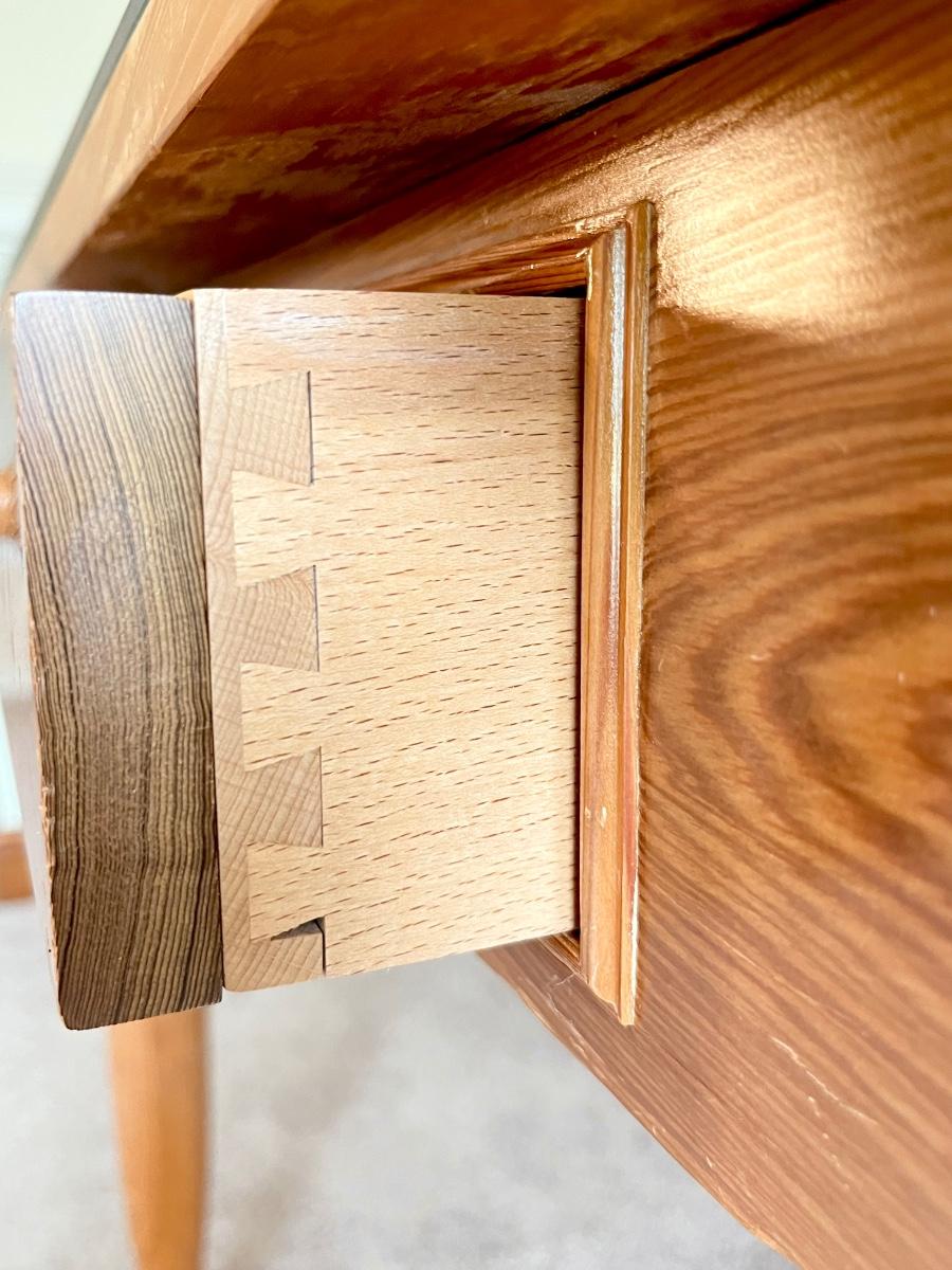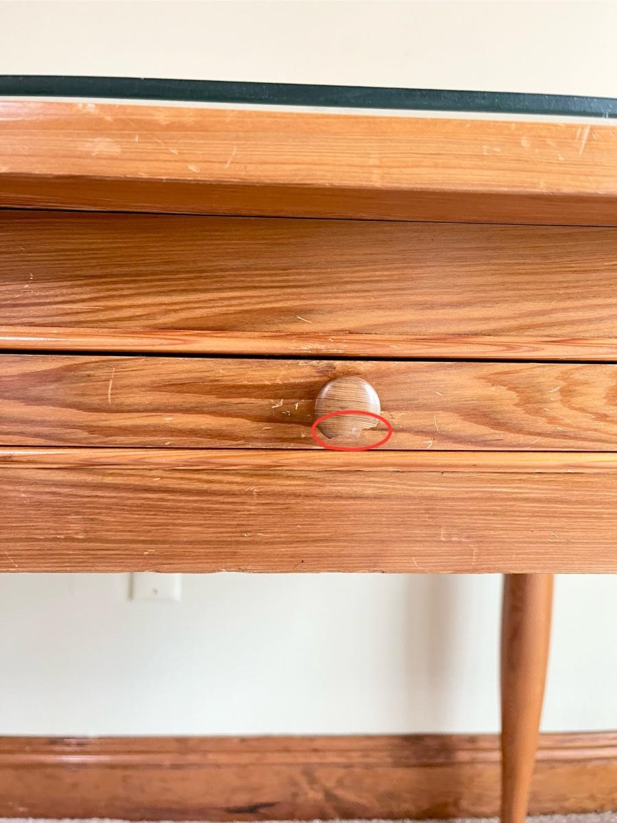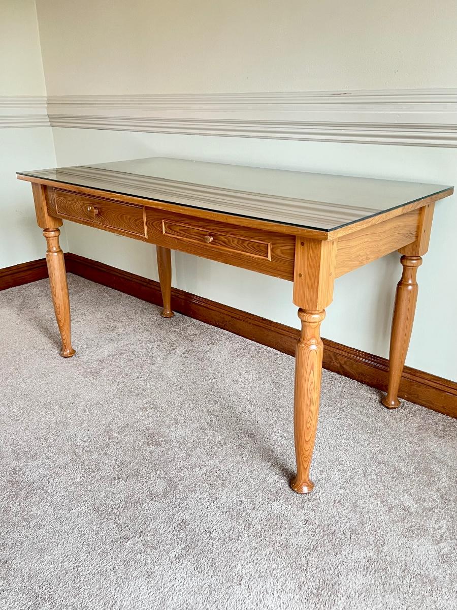 31” H x 54” W x 28” D ~ Drawer open easily ~ minor dings & scratches as seen in photos ~ Glass also has minor scratches from use ~ knobs are chipped & could be replaced ~ No brand name ~ Comes with a custom glass top for protection