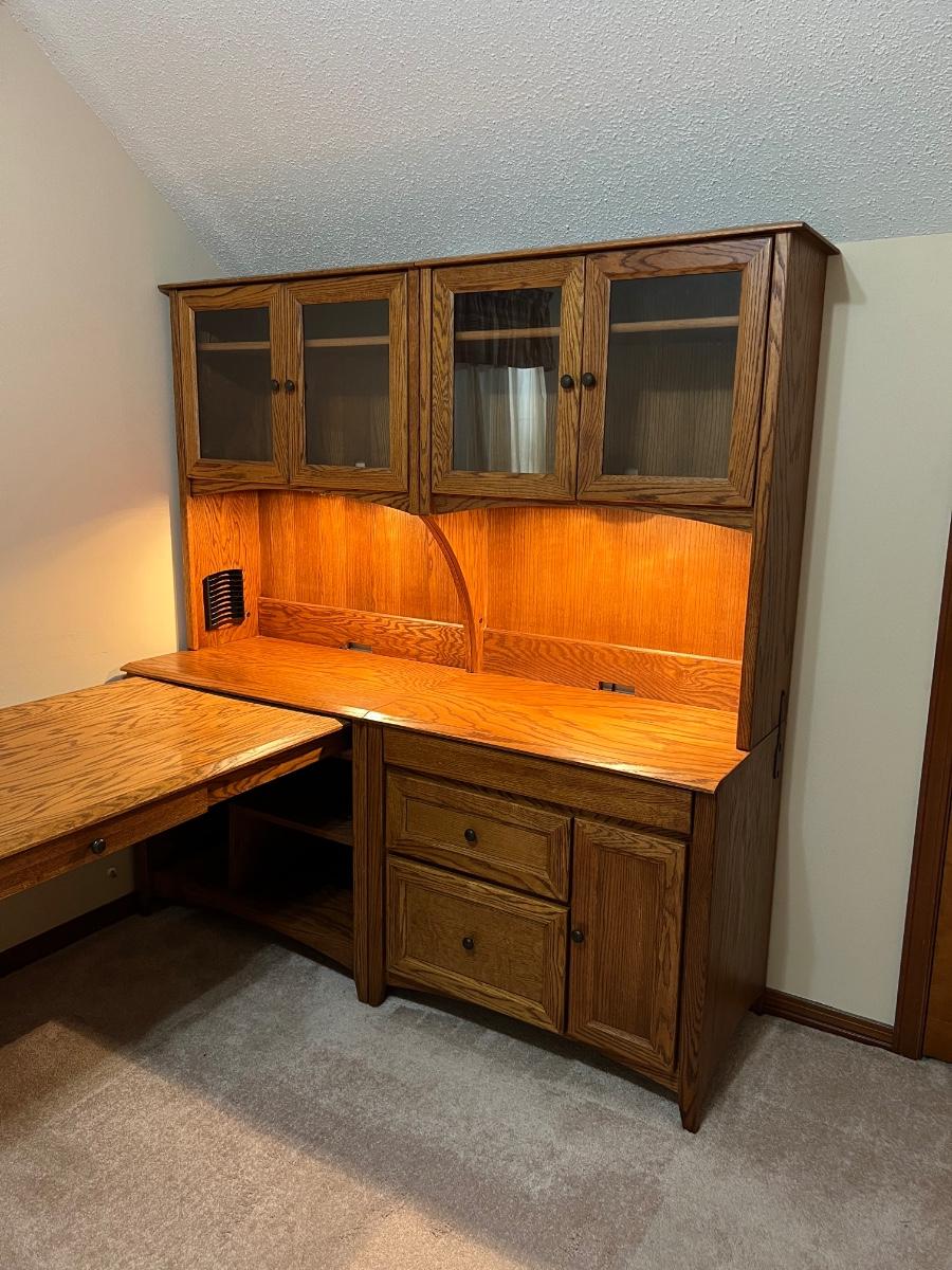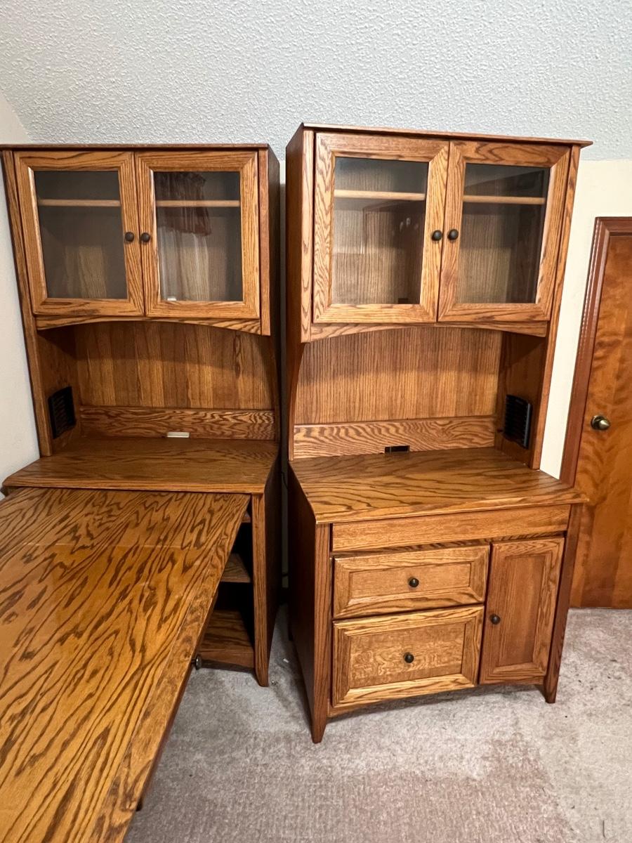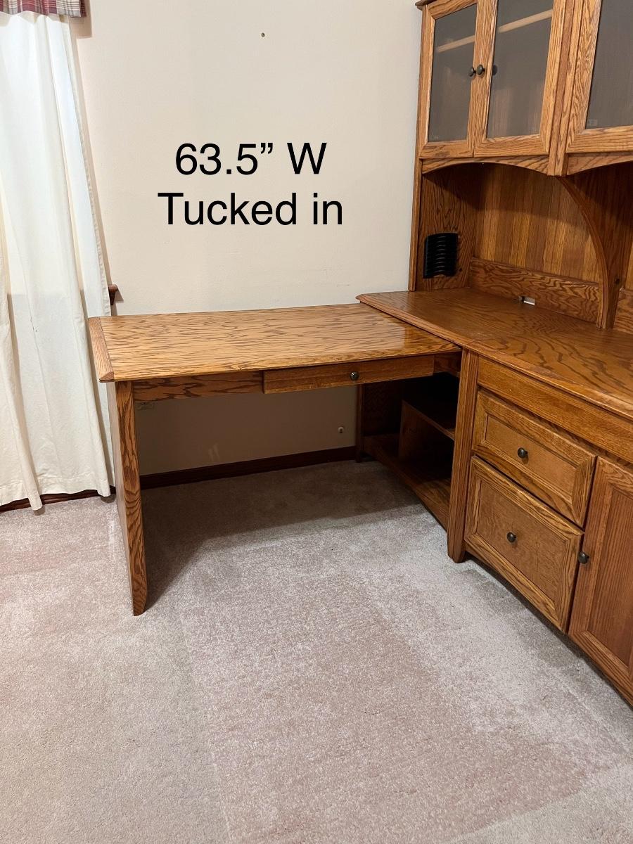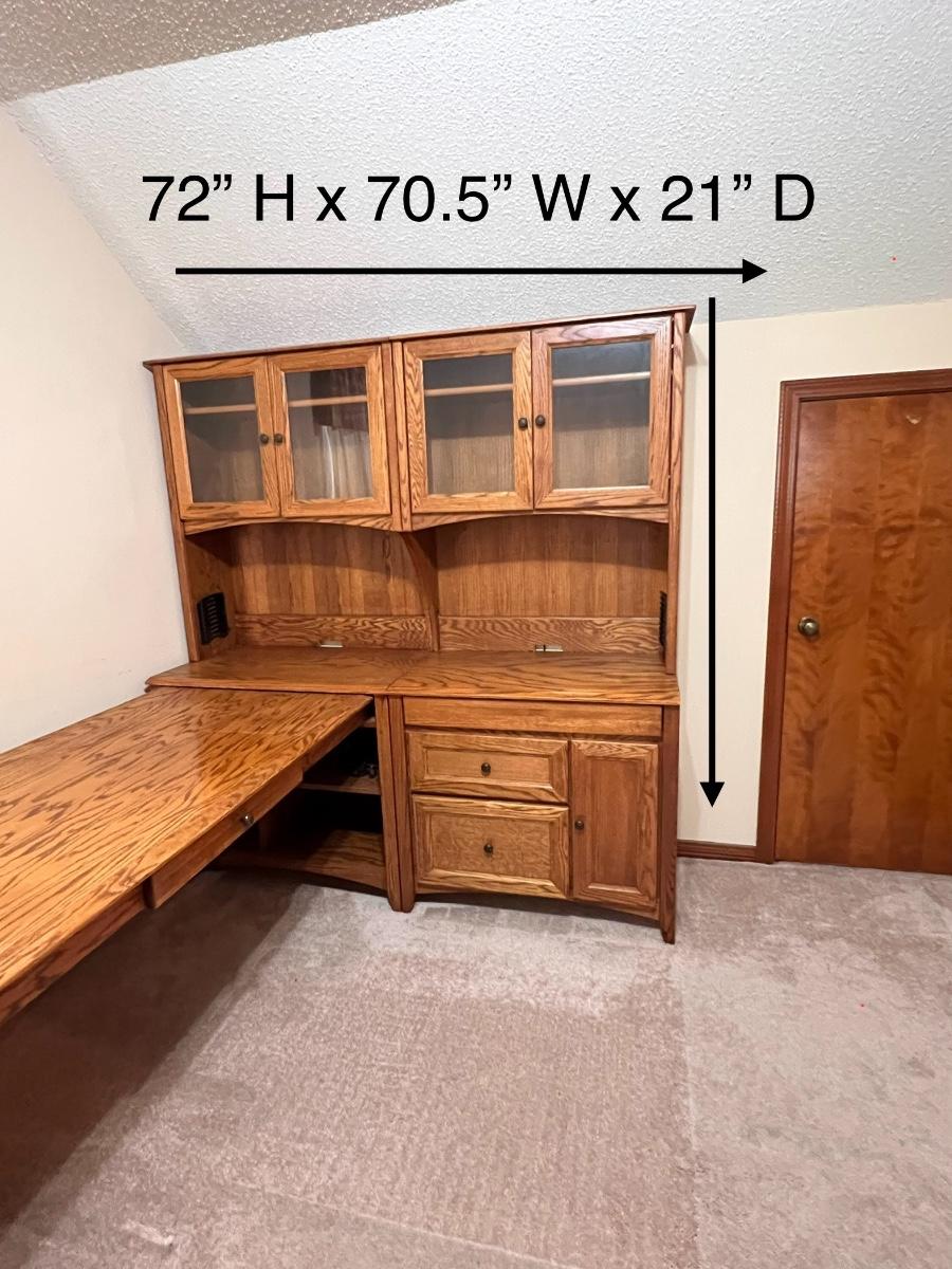 5 pieces ~ Shelving in top cabinets are adjustable ~ Side table top is adjustable, see photos ~ Measurements for the extension table measure from wall to the end of the table ~ The 2 hutches can be used separately as shown in photos, they are approximately 34” W